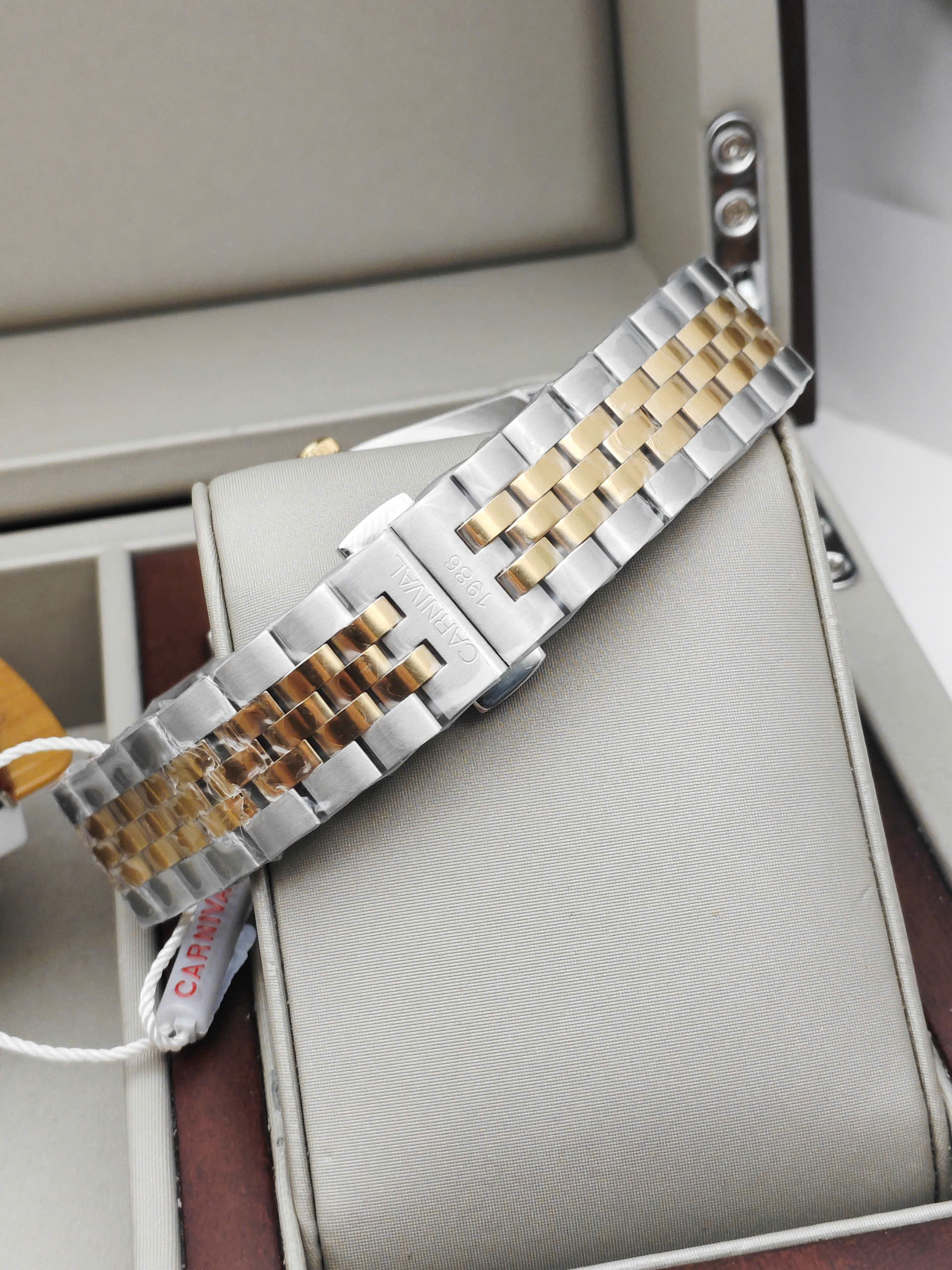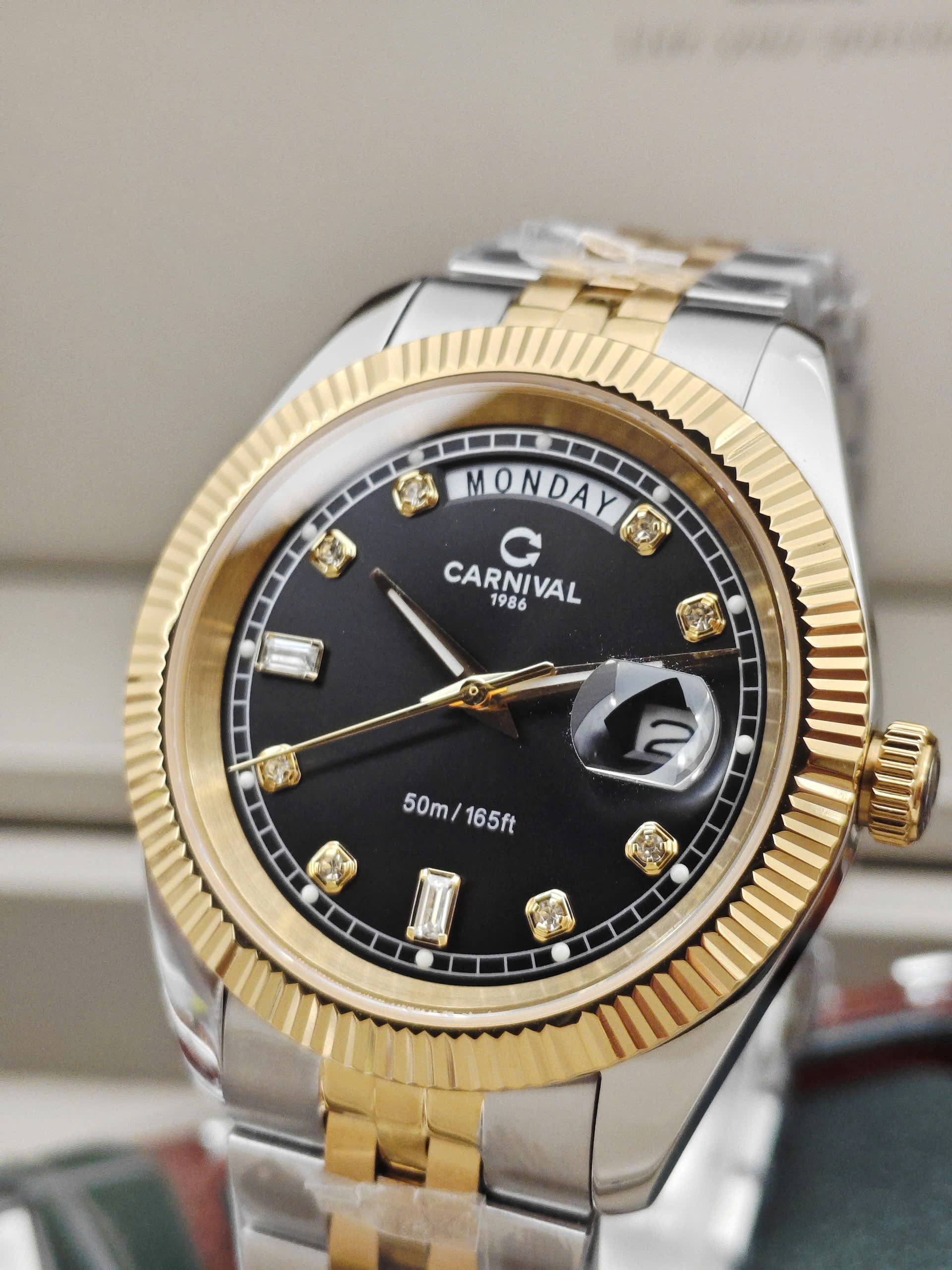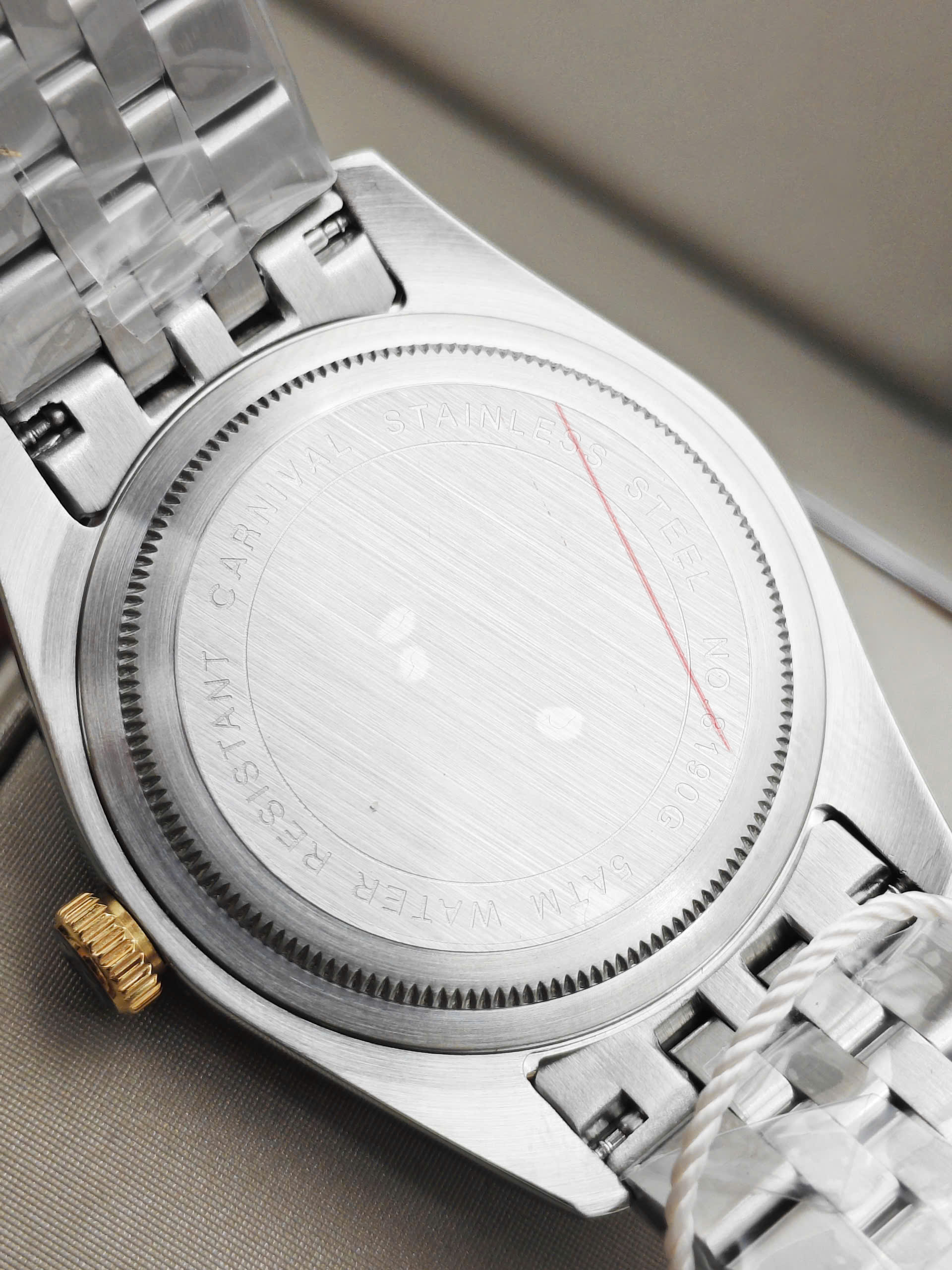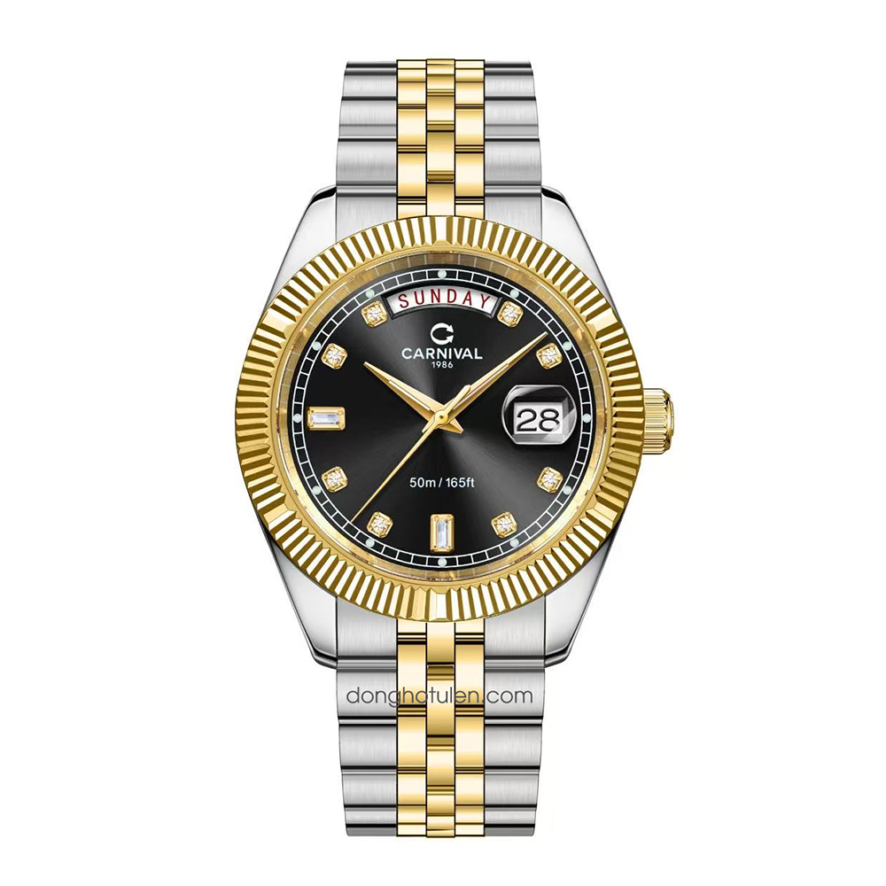 Carnival 8190G-CV-D sử dụng bộ máy Quartz Japan nổi tiếng với độ chính xác cao và hoạt động ổn định. Sự kết hợp giữa lắp ráp tại China và bộ máy Nhật Bản giúp sản phẩm đạt được sự cân bằng giữa chất lượng và giá thành. Đồng hồ được trang bị chức năng lịch ngày và thứ tiện lợi, hỗ trợ người dùng quản lý thời gian hiệu quả hơn. Độ chịu nước 5ATM cho phép bạn yên tâm sử dụng khi rửa tay, đi mưa nhẹ hoặc sinh hoạt hằng ngày mà không lo ảnh hưởng đến bộ máy bên trong.