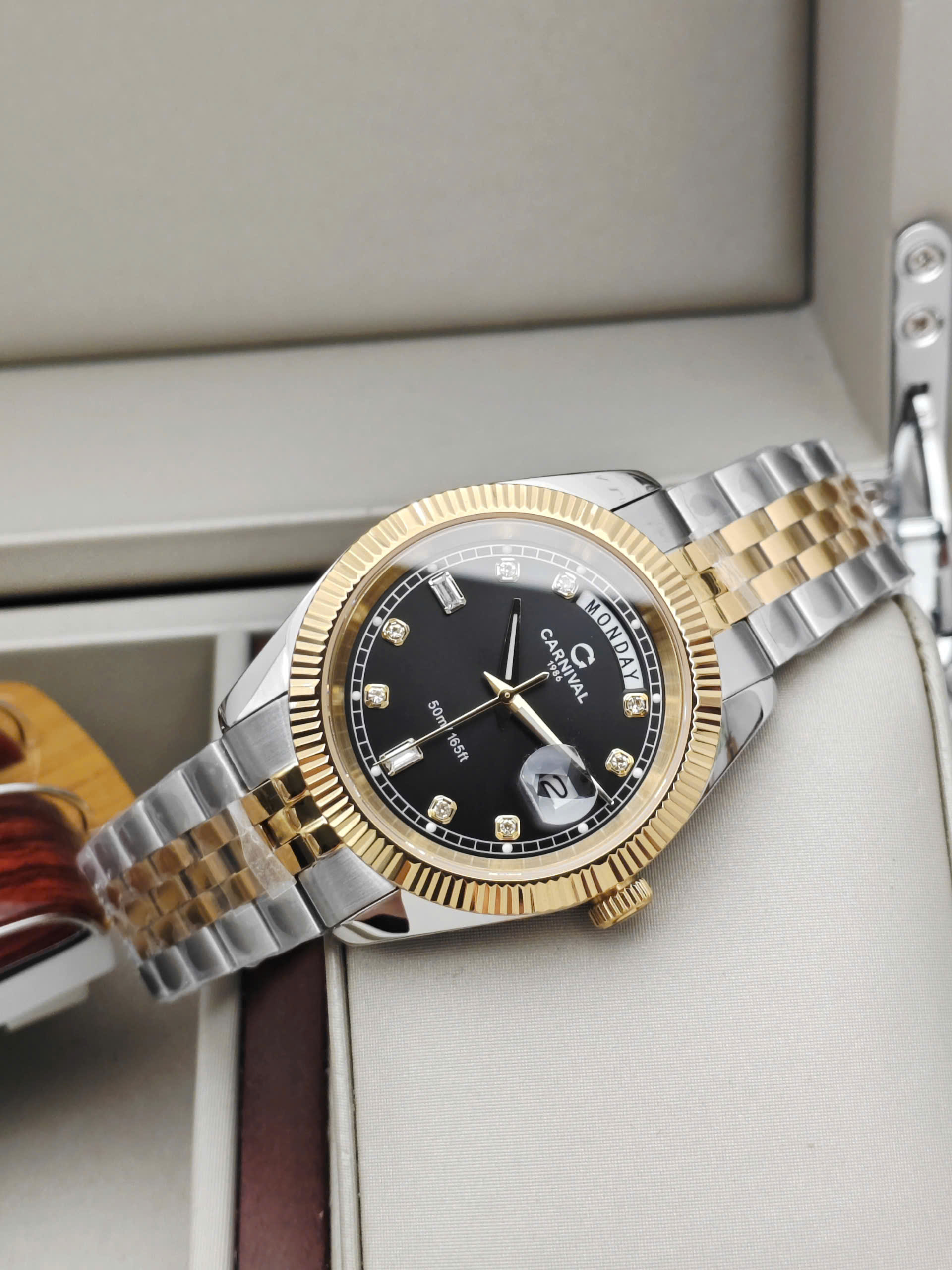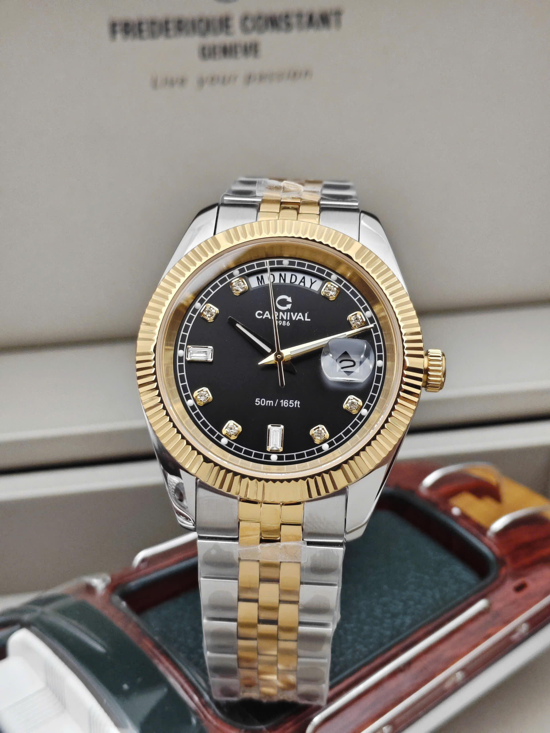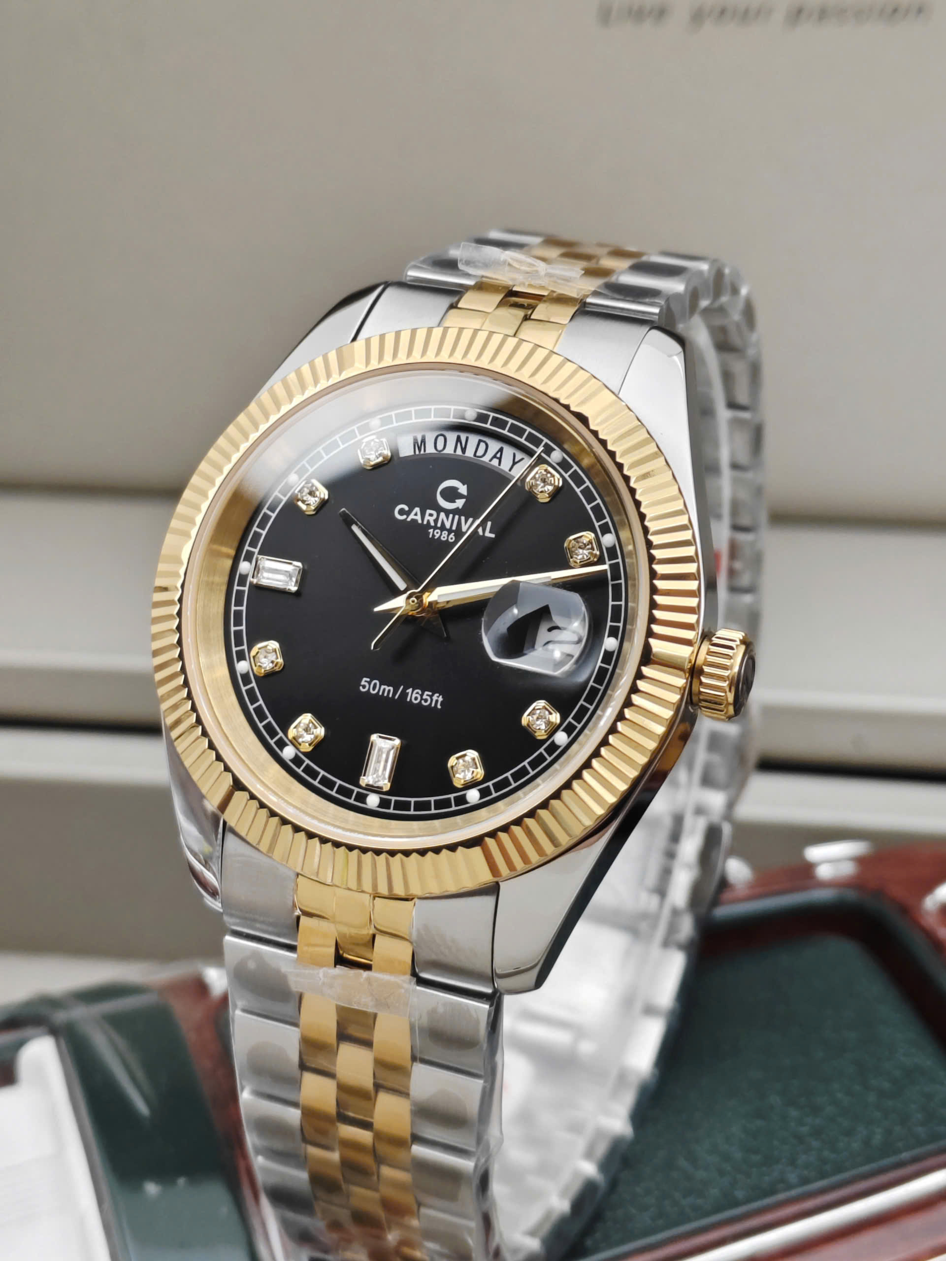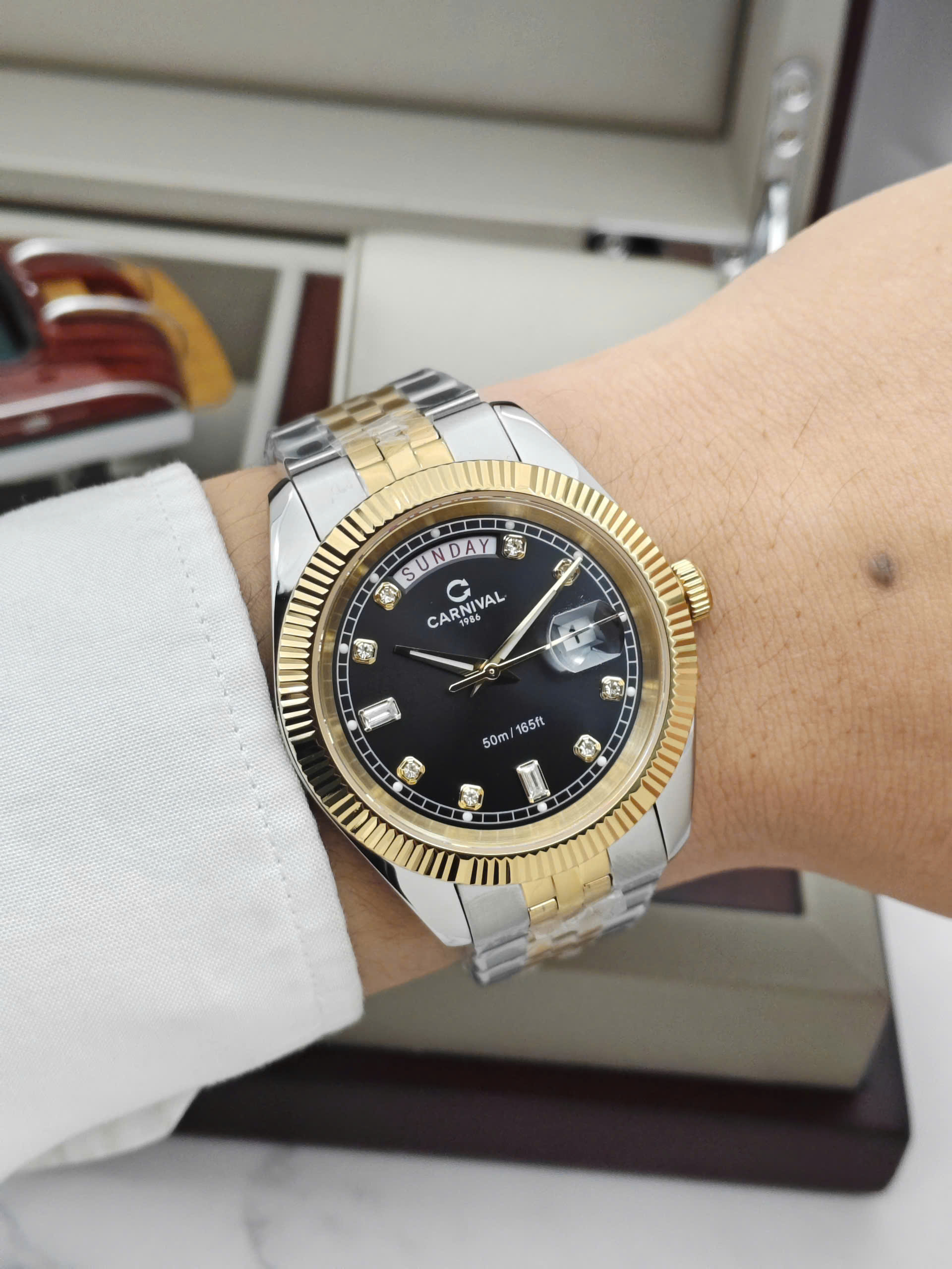 Carnival 8190G-CV-D sử dụng bộ máy Quartz Japan nổi tiếng với độ chính xác cao và hoạt động ổn định. Sự kết hợp giữa lắp ráp tại China và bộ máy Nhật Bản giúp sản phẩm đạt được sự cân bằng giữa chất lượng và giá thành. Đồng hồ được trang bị chức năng lịch ngày và thứ tiện lợi, hỗ trợ người dùng quản lý thời gian hiệu quả hơn. Độ chịu nước 5ATM cho phép bạn yên tâm sử dụng khi rửa tay, đi mưa nhẹ hoặc sinh hoạt hằng ngày mà không lo ảnh hưởng đến bộ máy bên trong.