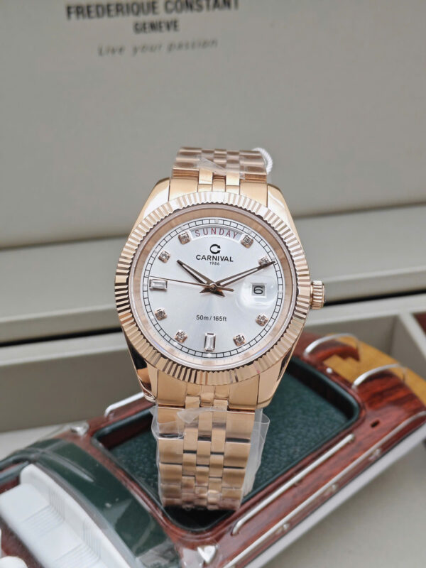 Đồng hồ Carnival 8190G là mẫu đồng hồ nam mang phong cách thanh lịch, sang trọng, phù hợp với quý ông hiện đại. Thuộc thương hiệu Carnival danh tiếng đến từ Thụy Sỹ, sản phẩm gây ấn tượng với thiết kế vỏ và dây thép không gỉ mạ vàng hồng tinh tế, tôn lên vẻ đẳng cấp và thời trang. Mặt số trắng trang nhã kết hợp các chi tiết tối giản giúp tổng thể hài hòa, dễ dàng sử dụng trong nhiều hoàn cảnh, từ công sở đến các sự kiện quan trọng.