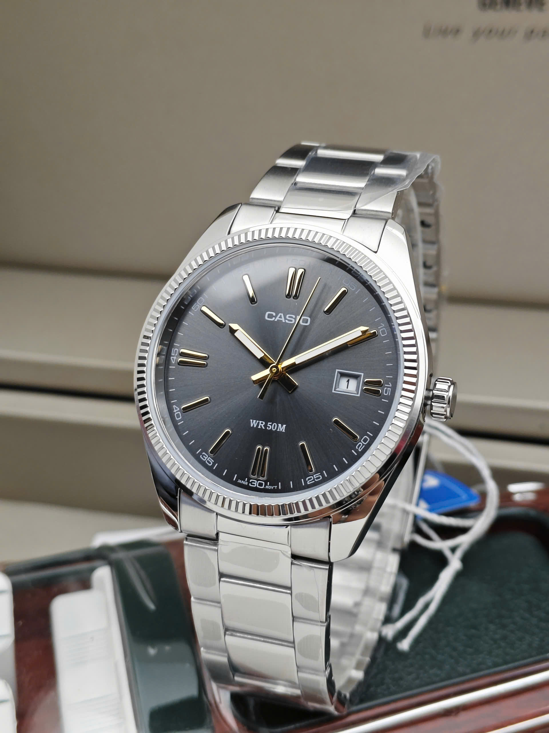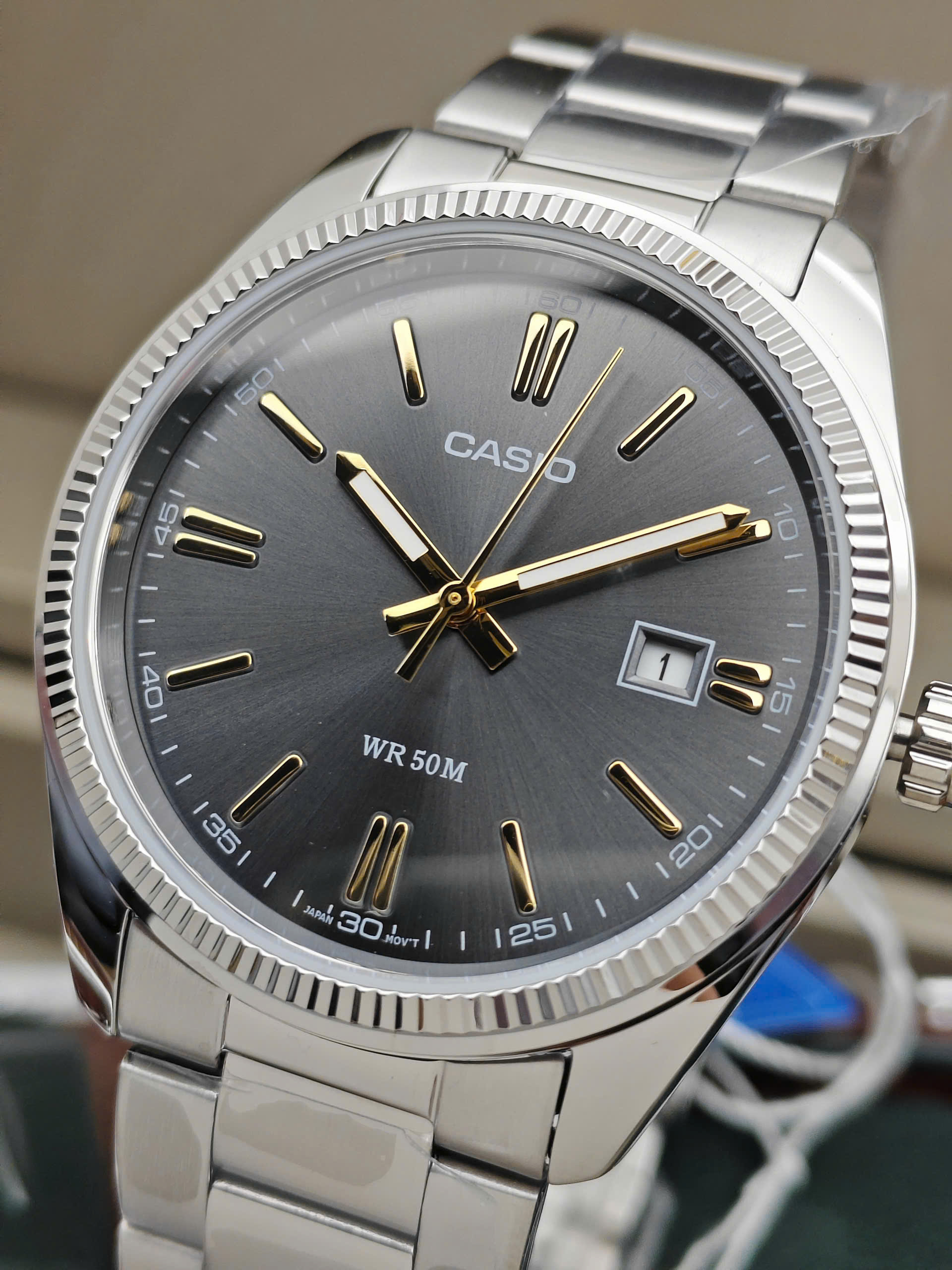 Đồng hồ nam CASIO MTP-1302D-1A2VDF mang phong cách lịch lãm, phù hợp cho nam giới yêu thích sự đơn giản và bền bỉ. Sản phẩm đến từ thương hiệu Casio Nhật Bản, nổi bật với vỏ kim loại phủ ion màu bạc sang trọng cùng dây thép không gỉ chắc chắn. Mặt số màu xám hiện đại kết hợp đường kính 41mm tạo cảm giác nam tính, dễ đeo hằng ngày. Đồng hồ sử dụng bộ máy quartz pin xuất xứ Nhật Bản, cho độ chính xác cao và ổn định.