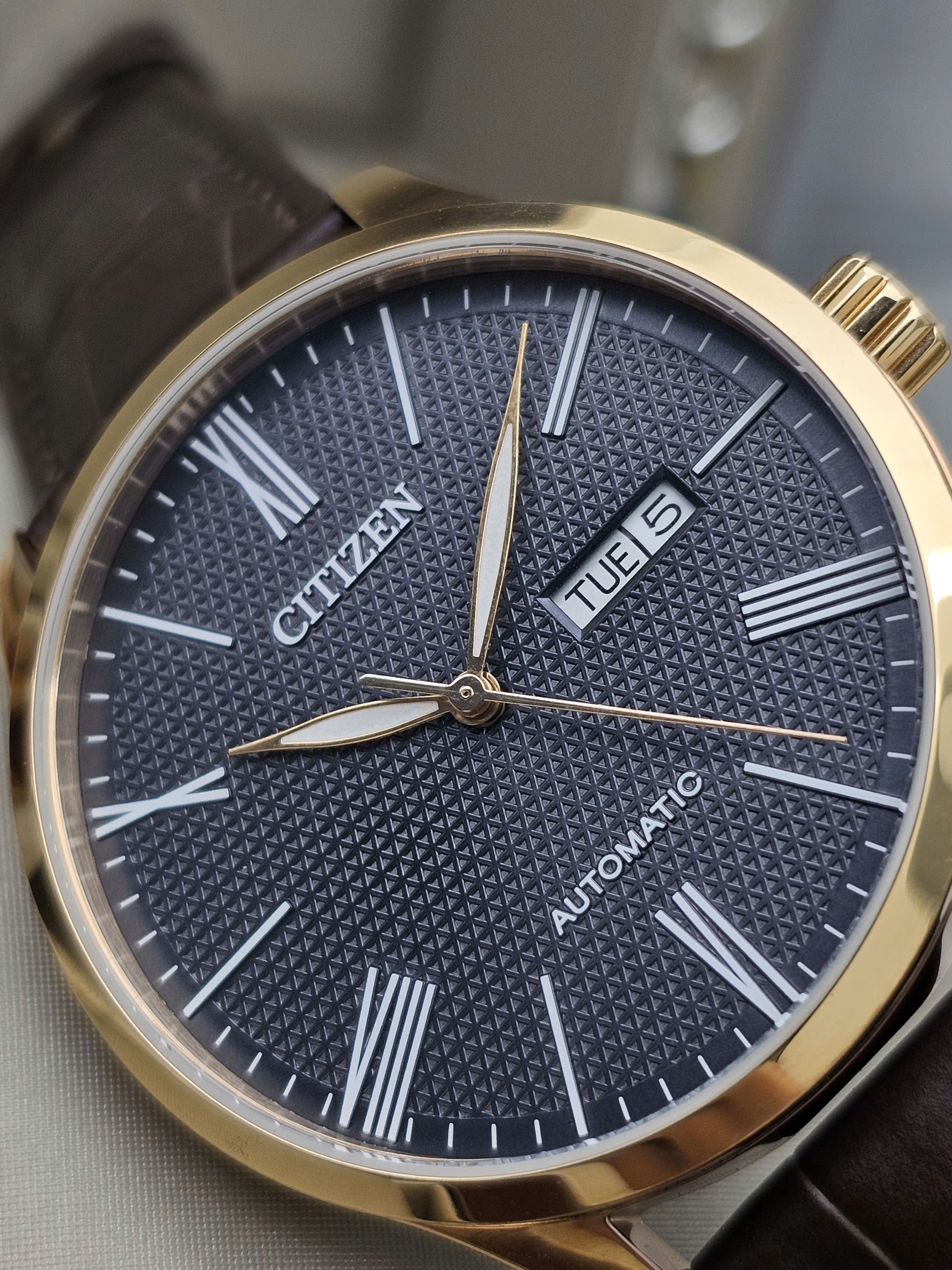 Đồng hồ Citizen Automatic NH8353-00H với thiết kế mặt họa tiết hình học (lớp vân Guilloché tam giác) mang lại sự khác biệt nhưng vẫn sở hữu vẻ thanh lịch với 3 kim và 1 lịch.