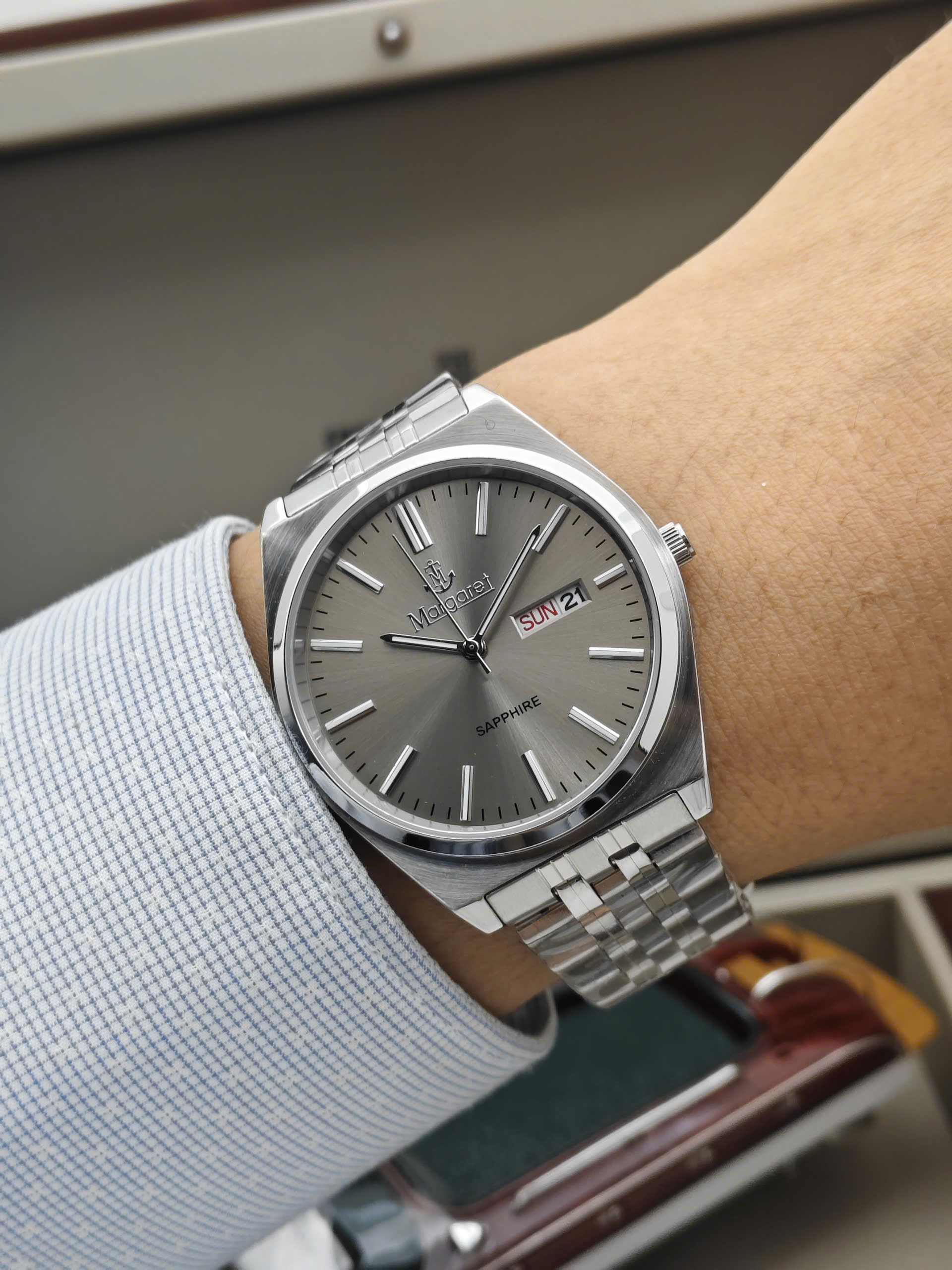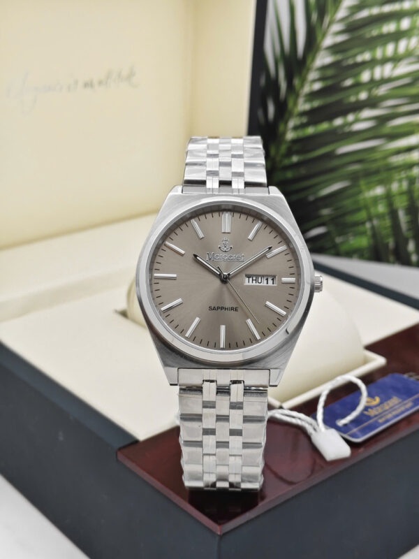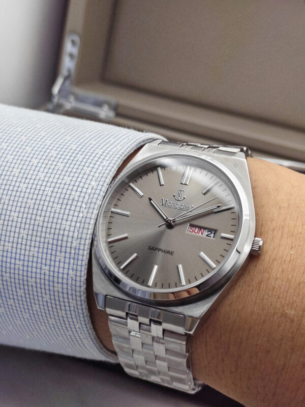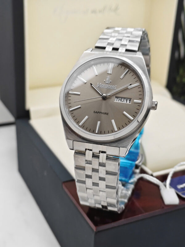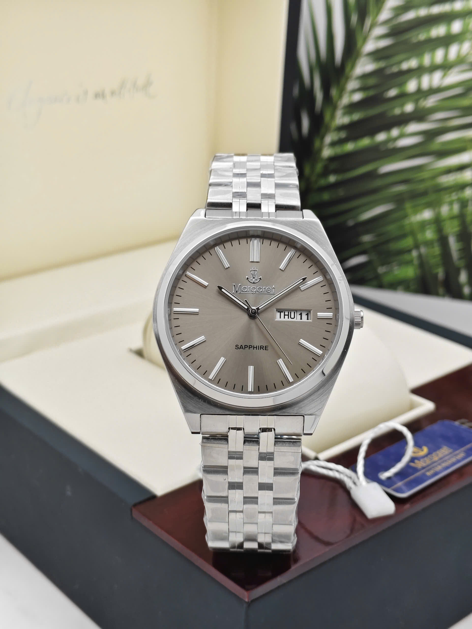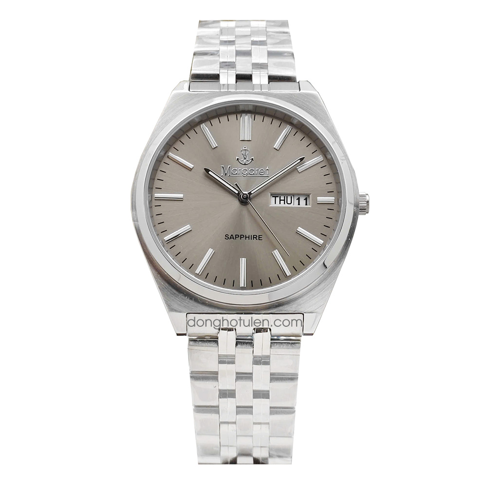 Đồng hồ nam Margaret Dây thép trắng mặt xám kính sapphire MT.8187 lịch đôi