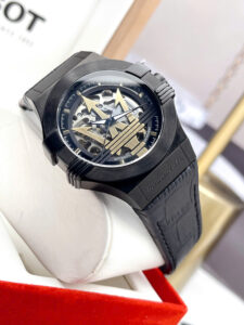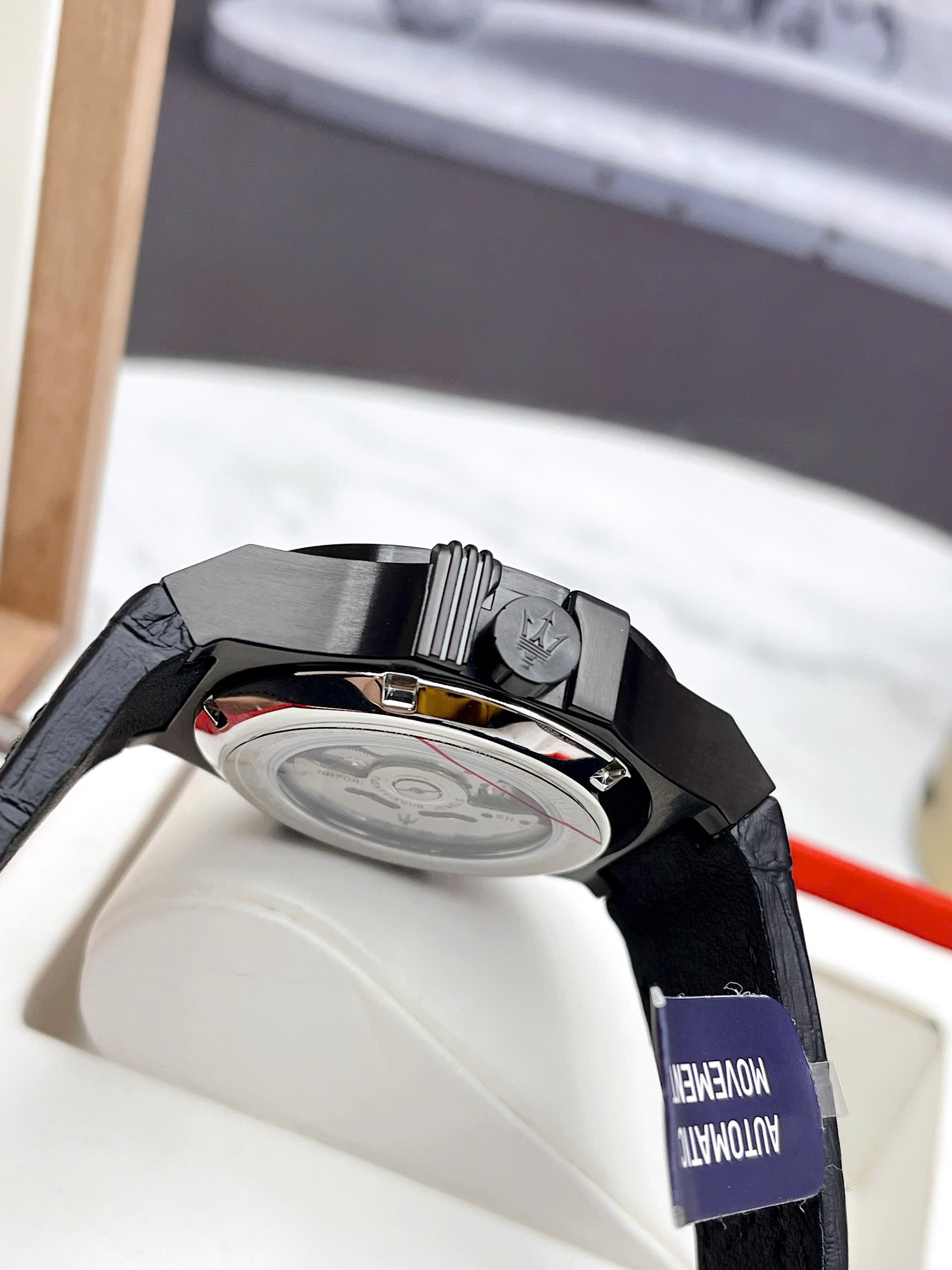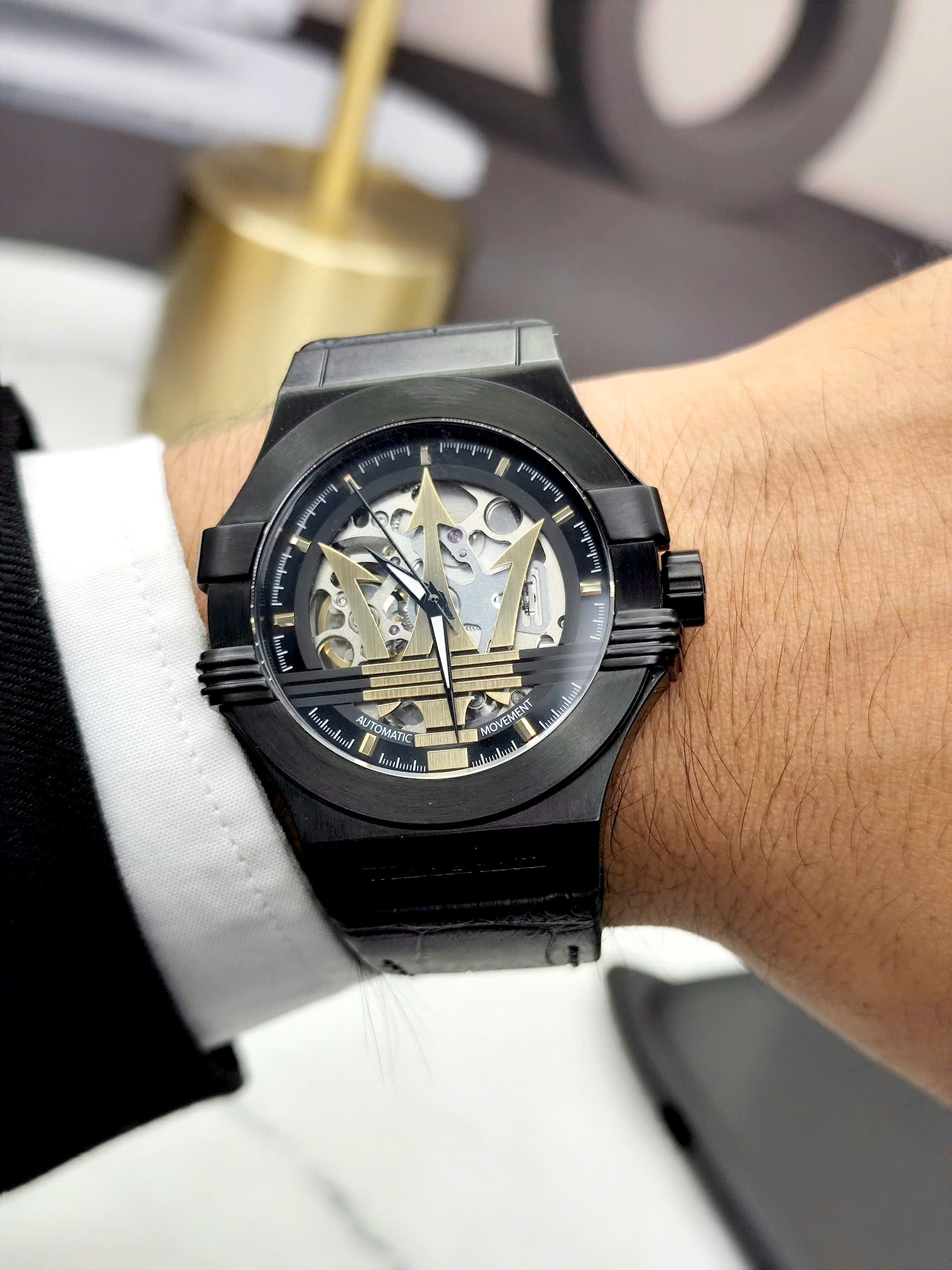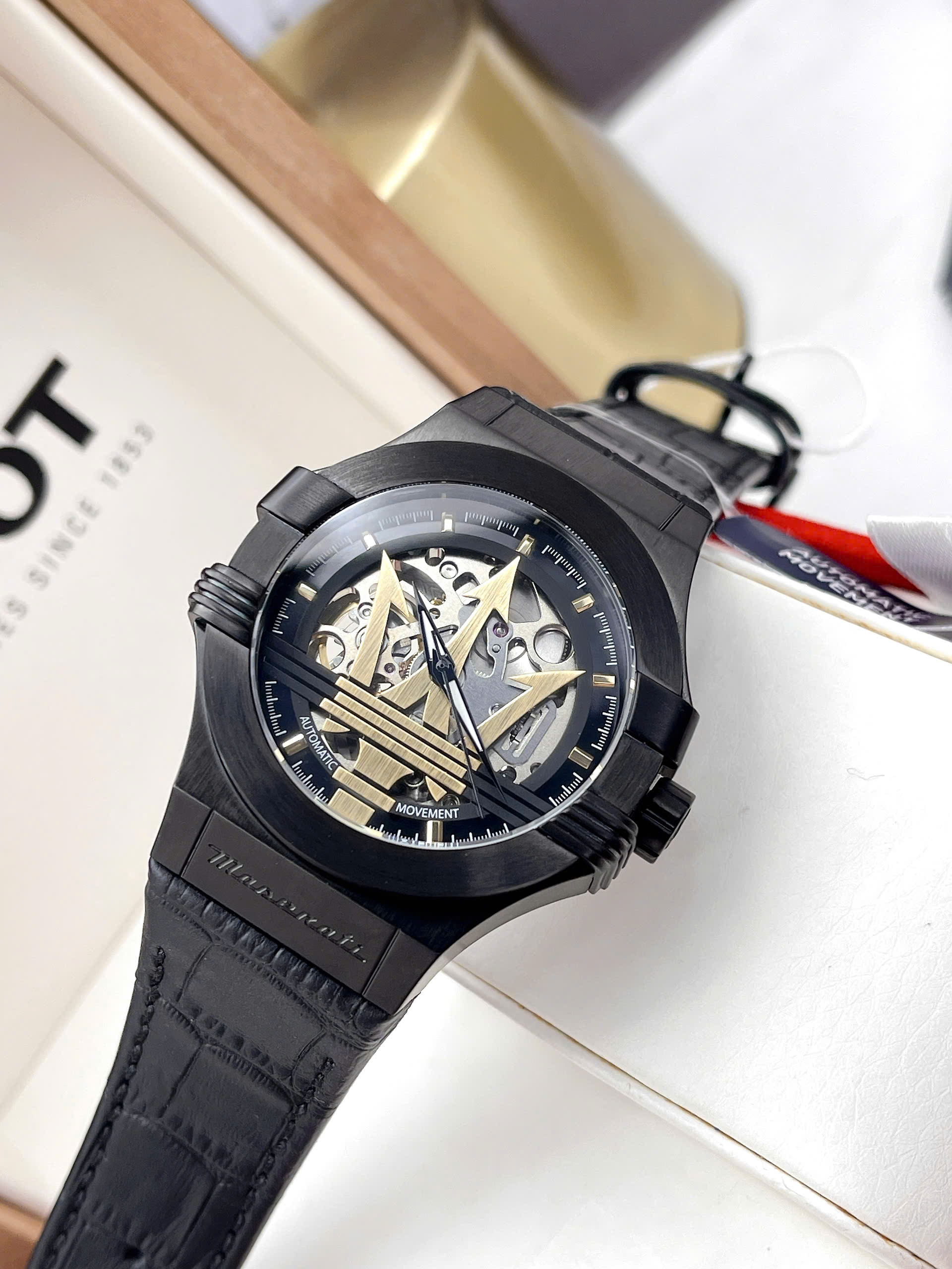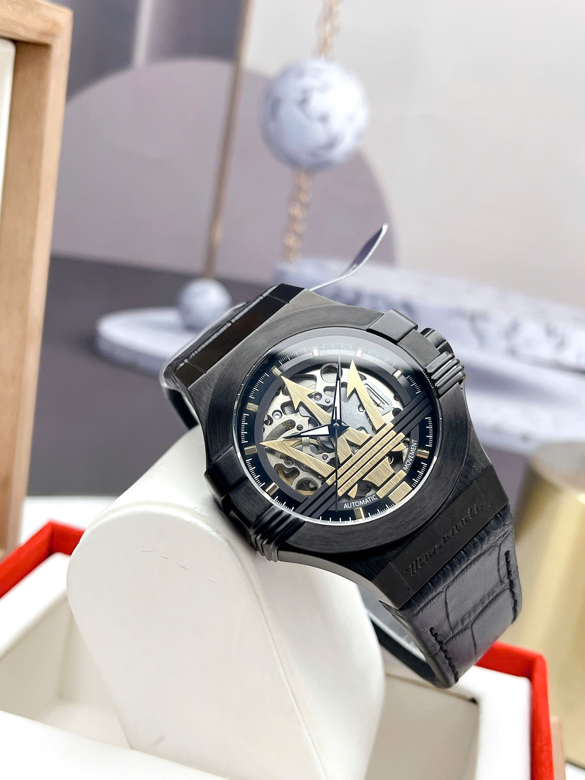 Đồng hồ cơ Maserati Potenza R8821108036 với thiết kế cây đinh ba vàng chủ đạo, dây da đen, mặt đen cực ngầu, lộ đáy, kim phủ dạ quang sẽ nâng tầm cá tính cho bạn.