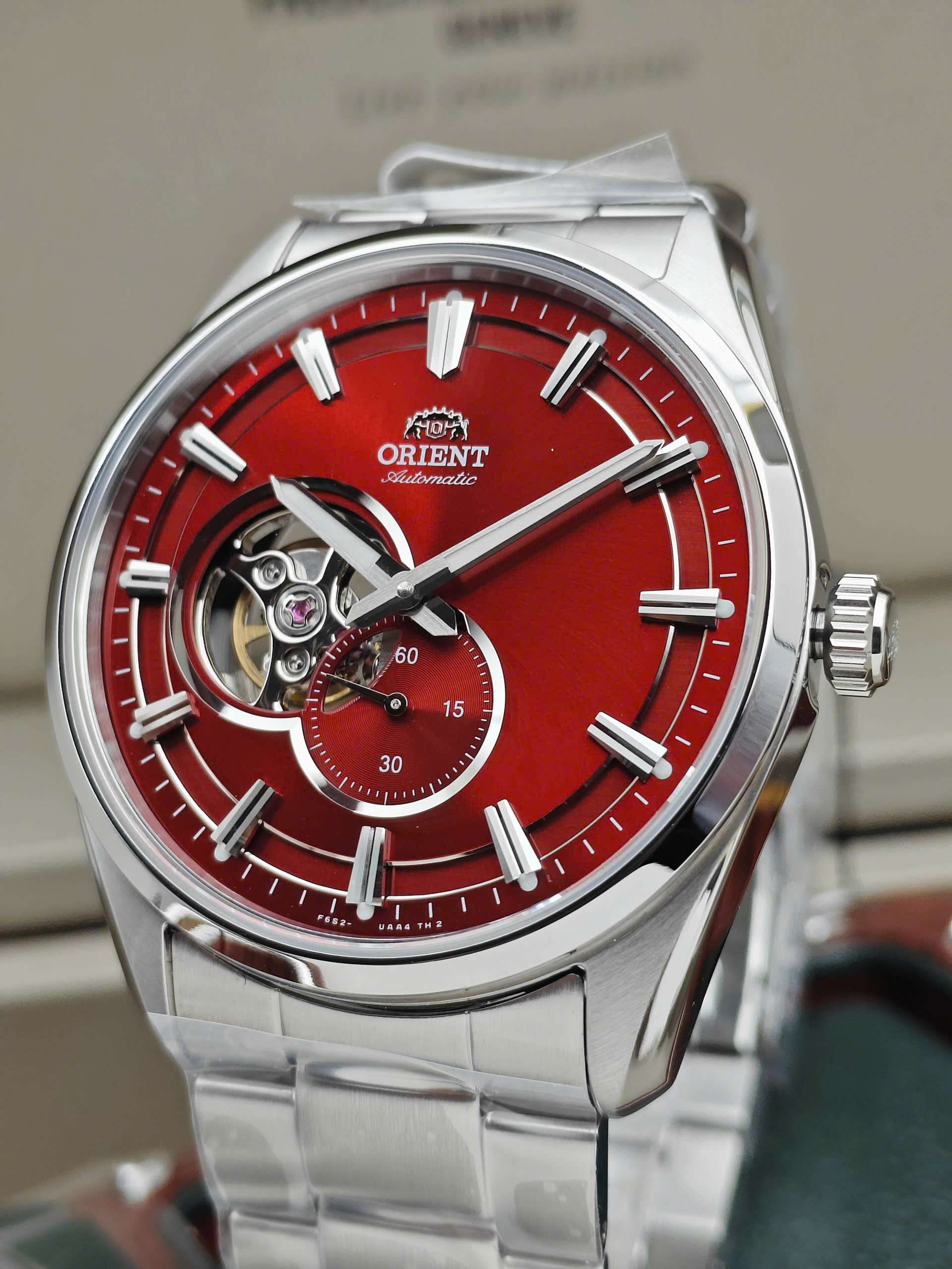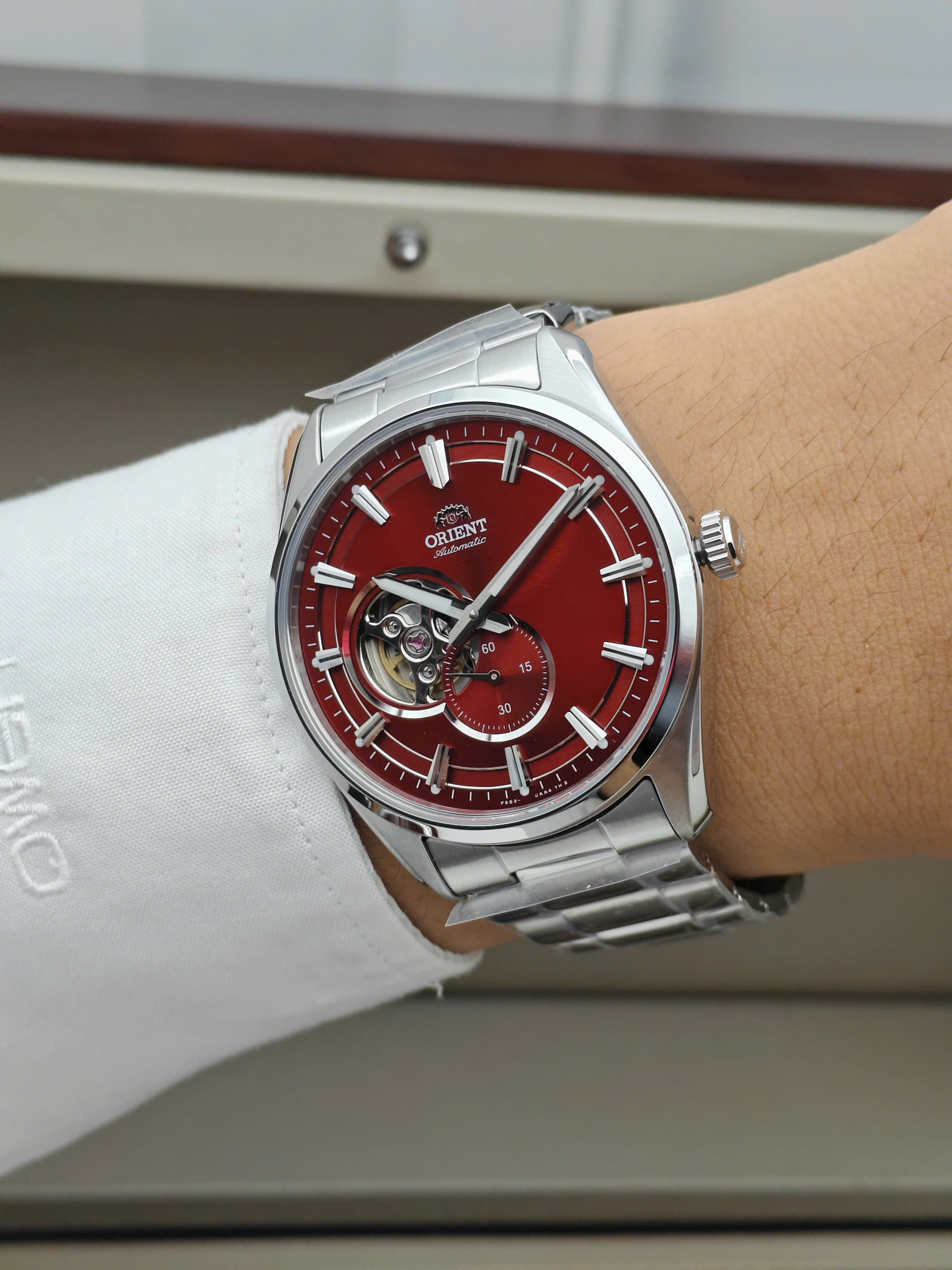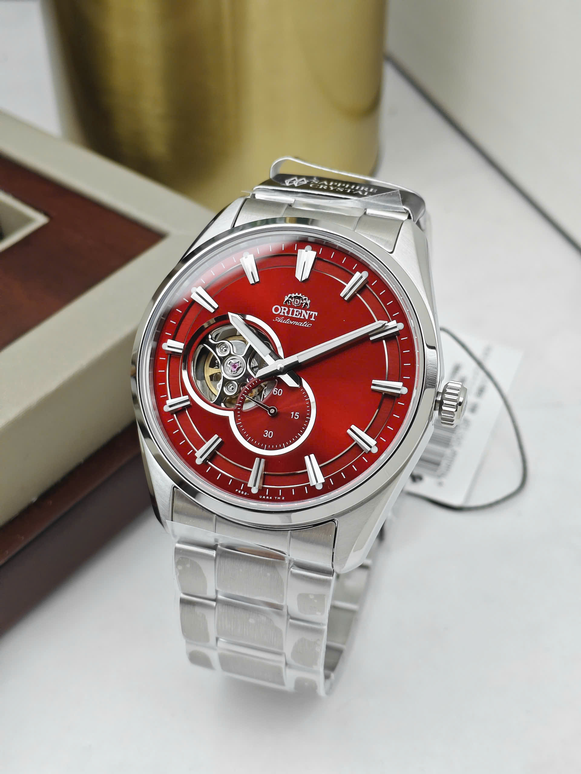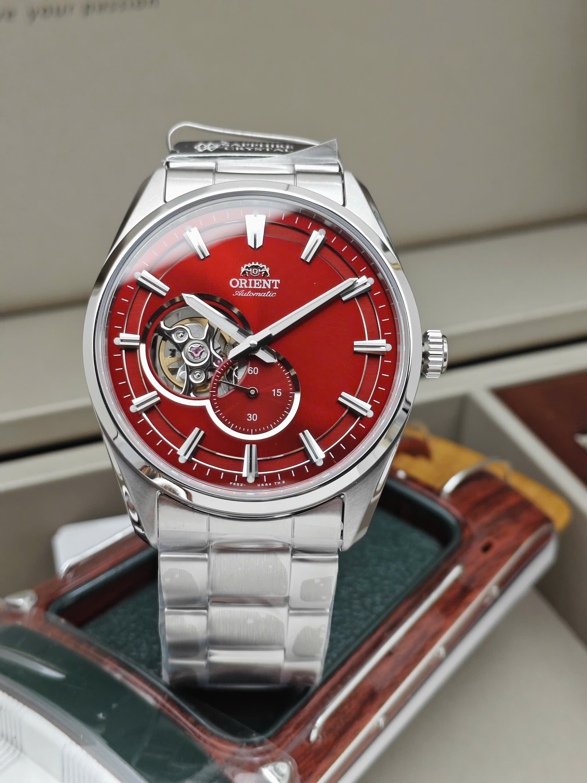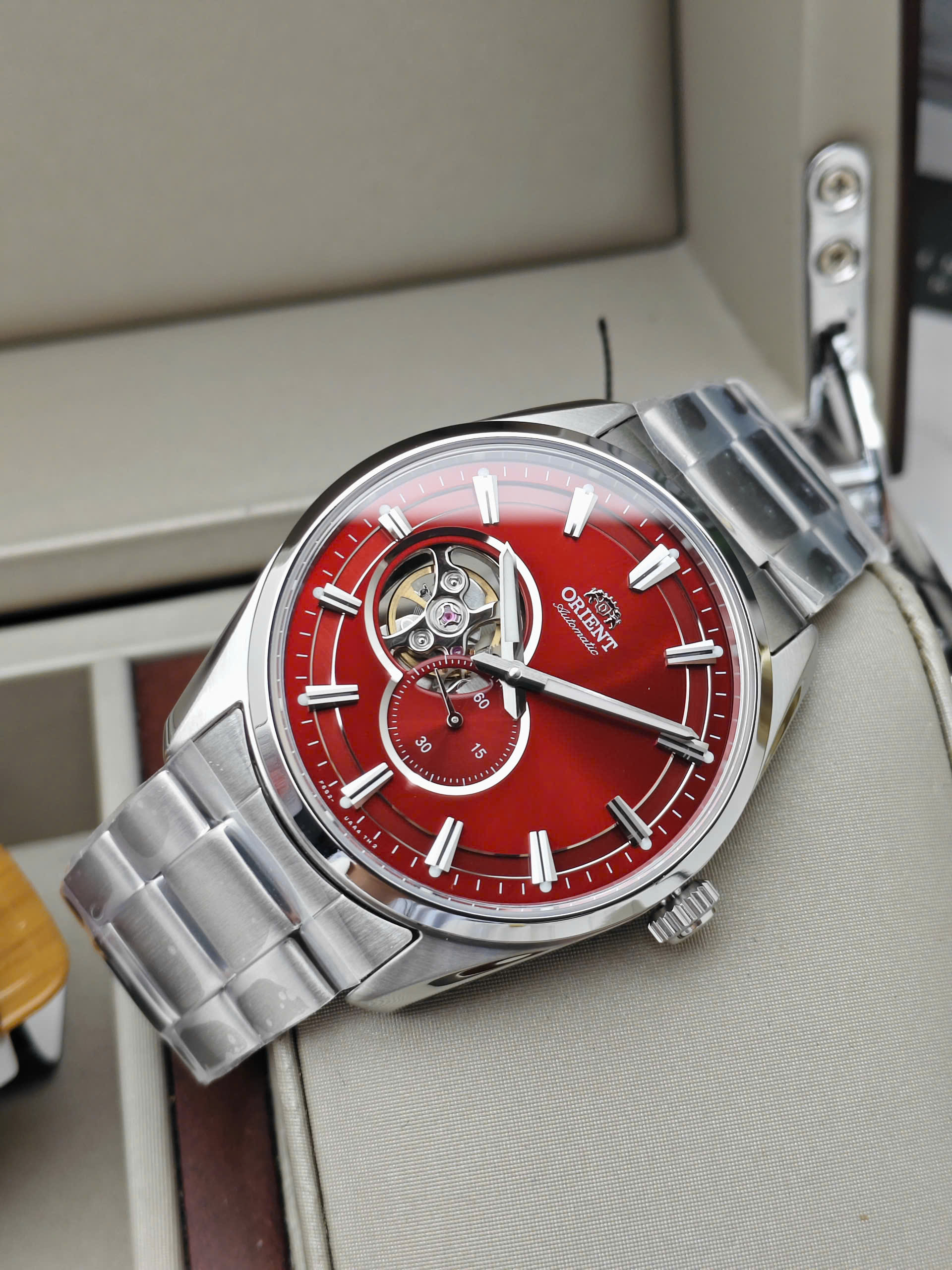 Đồng hồ nam Tự động Hở tim Kim Rốn Kính Sapphire Orient Small Second Open Heart đỏ RA-AR0010R10B