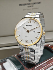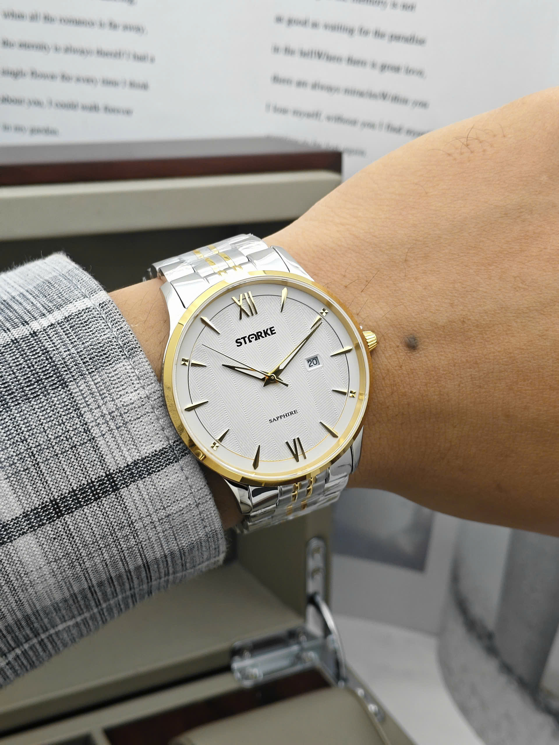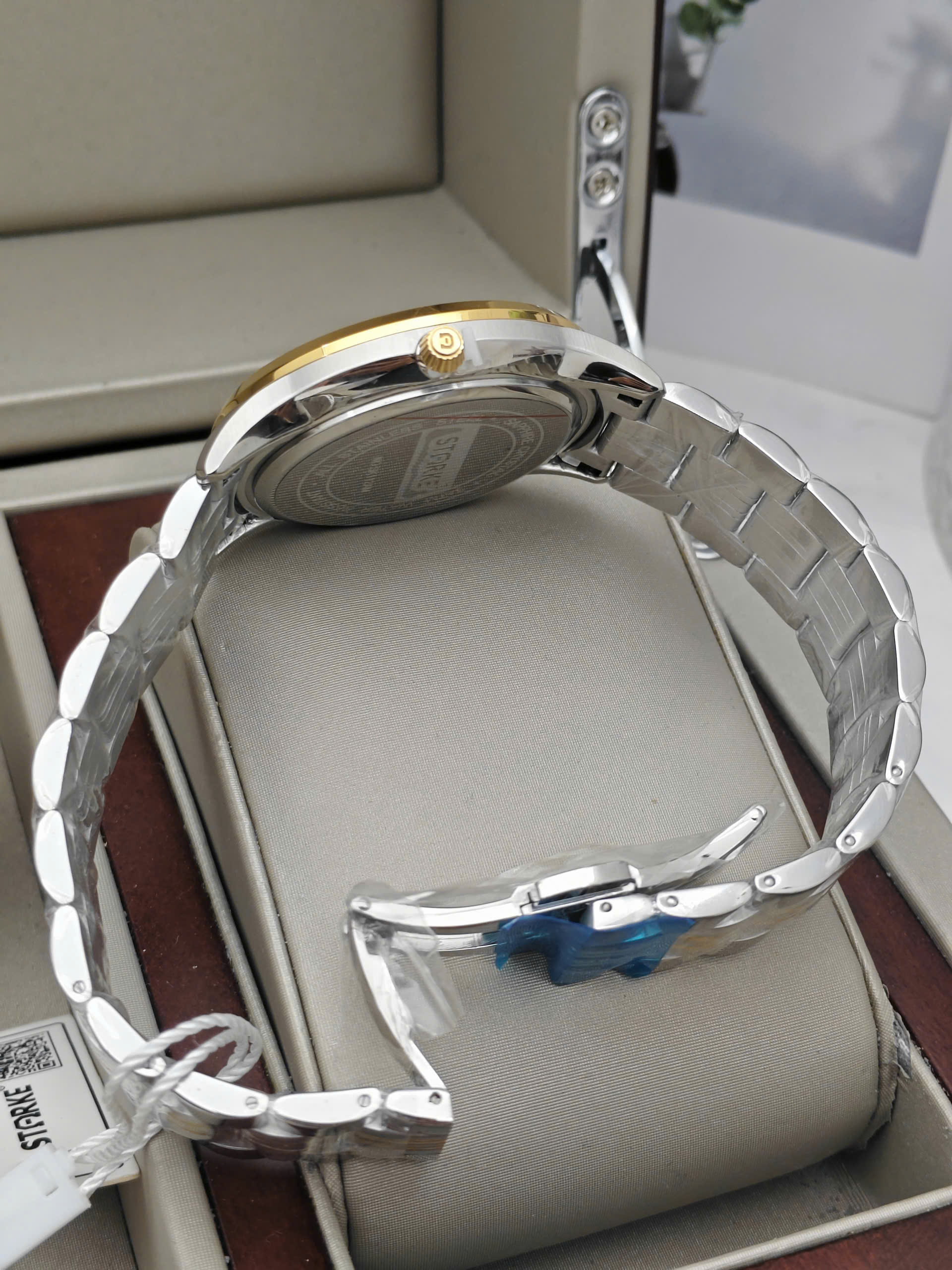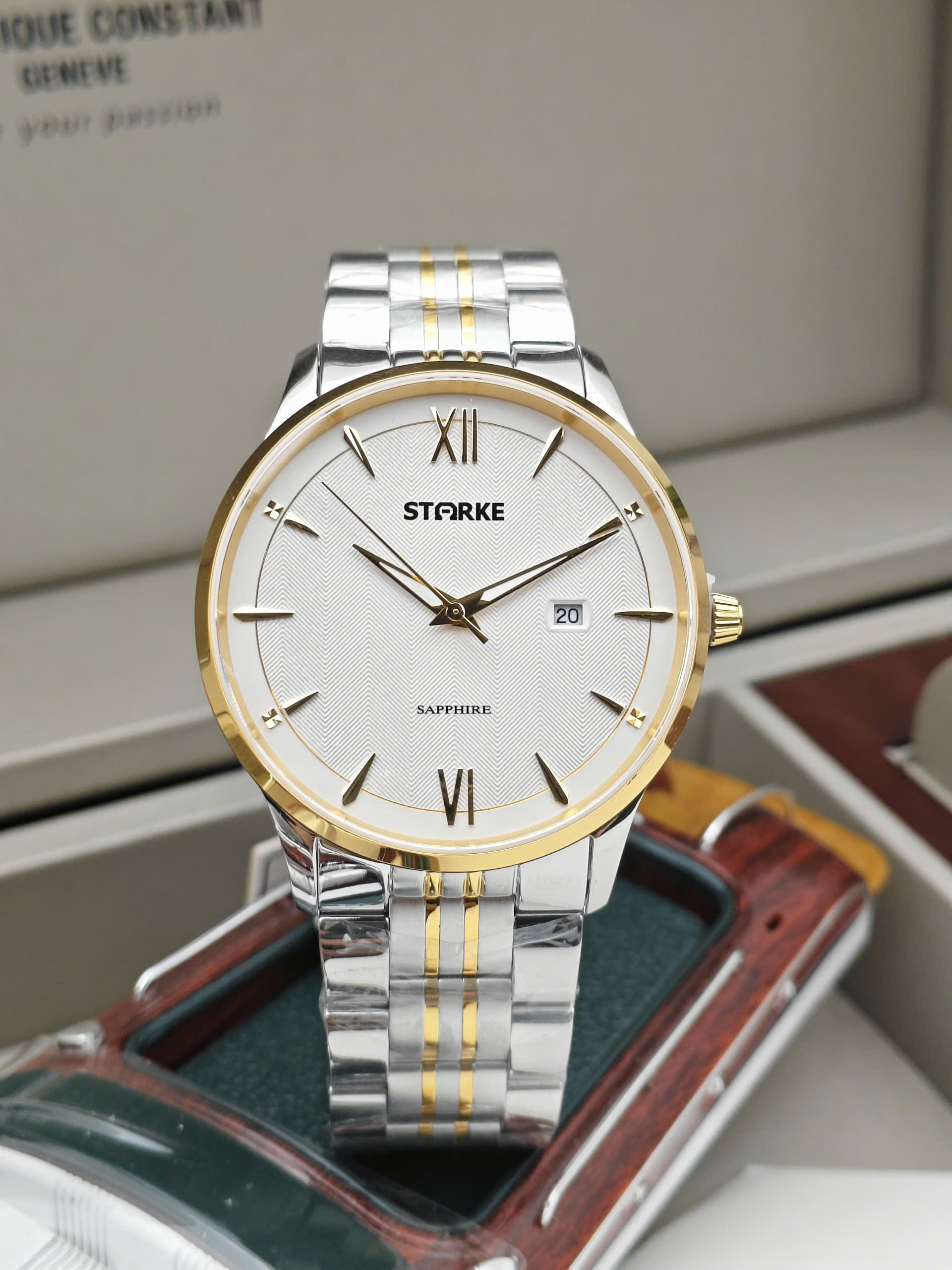 Đồng hồ Starke SK112AM-AAW thuộc dòng SK112AM của thương hiệu Starke đến từ Đức, mang phong cách sang trọng và tinh tế dành cho nam giới yêu thích sự lịch lãm. Thiết kế nổi bật với vỏ mạ vàng gold kết hợp dây demi thời thượng, tạo nên tổng thể đẳng cấp nhưng vẫn hài hòa. Mặt số màu vàng gold sang trọng cùng đường kính 41mm giúp đồng hồ ôm tay vừa vặn, dễ dàng phối hợp với trang phục công sở lẫn trang phục thường ngày.