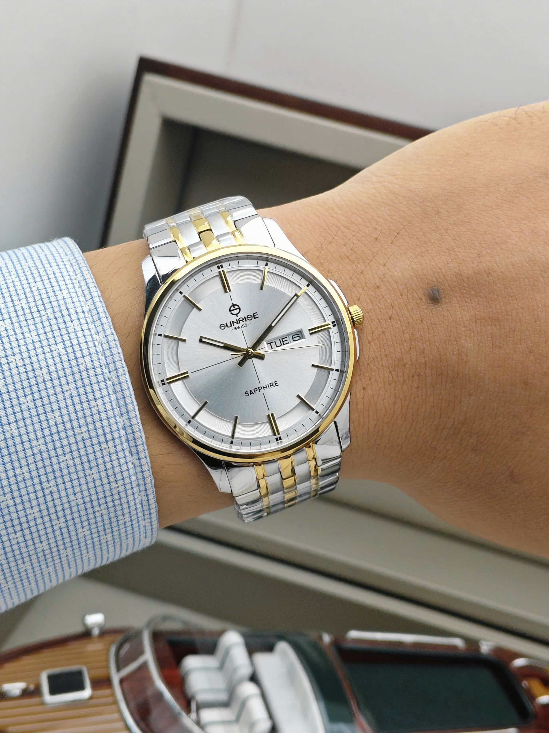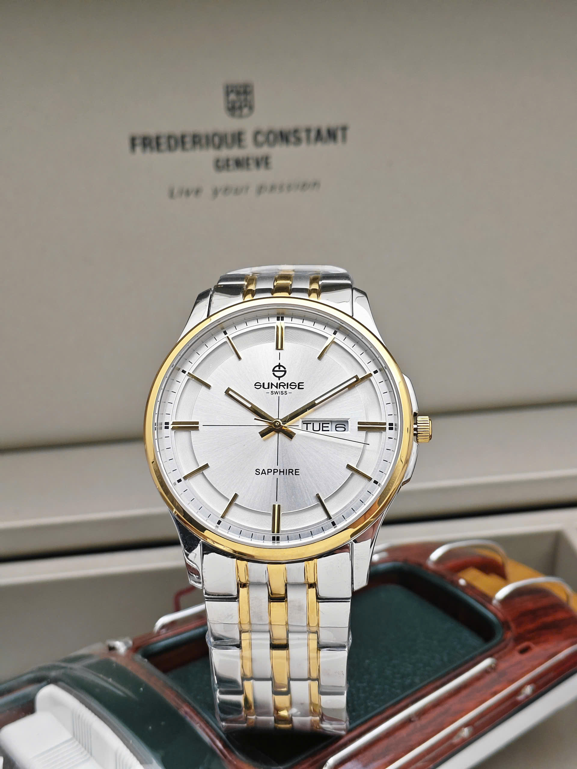 Đồng hồ nam SUNRISE 1143SA-Demi nổi bật với thiết kế demi thời thượng, kết hợp hài hòa giữa sắc thép và vàng sang trọng. Mang phong cách Thụy Sỹ thanh lịch, mẫu đồng hồ này sở hữu mặt số bạc trang nhã cùng viền vàng nổi bật, tạo nên vẻ đẹp tinh tế nhưng vẫn đầy nam tính. Đường kính mặt 39mm vừa vặn với cổ tay nam giới châu Á, phù hợp cho cả môi trường công sở lẫn các dịp gặp gỡ quan trọng.