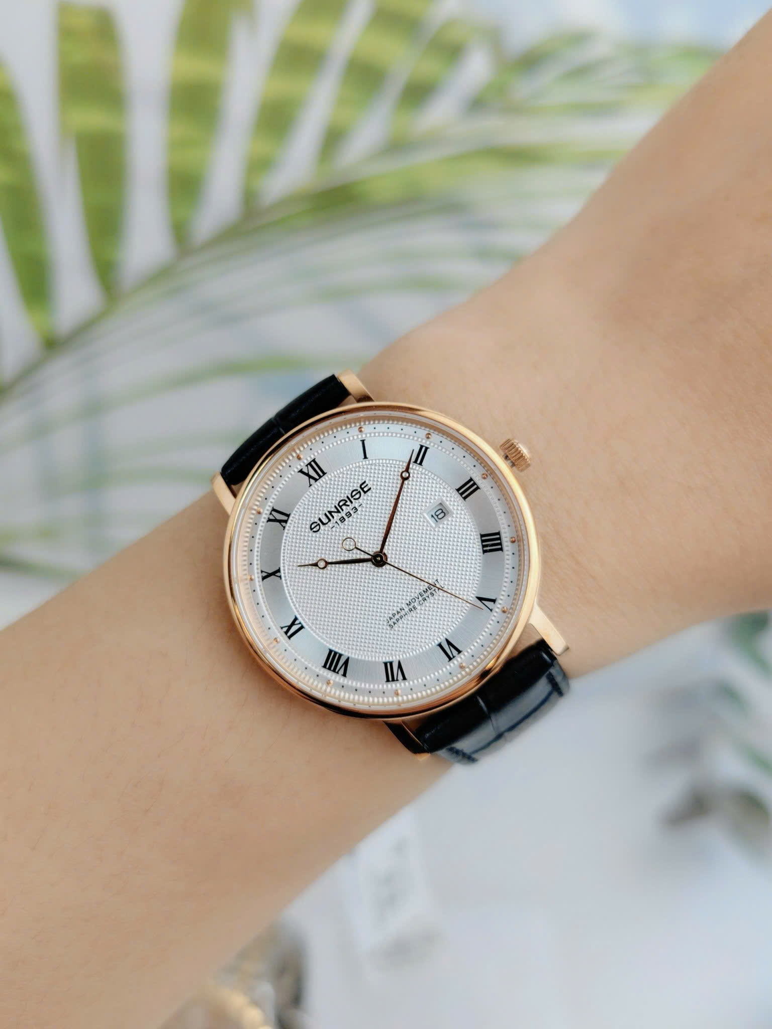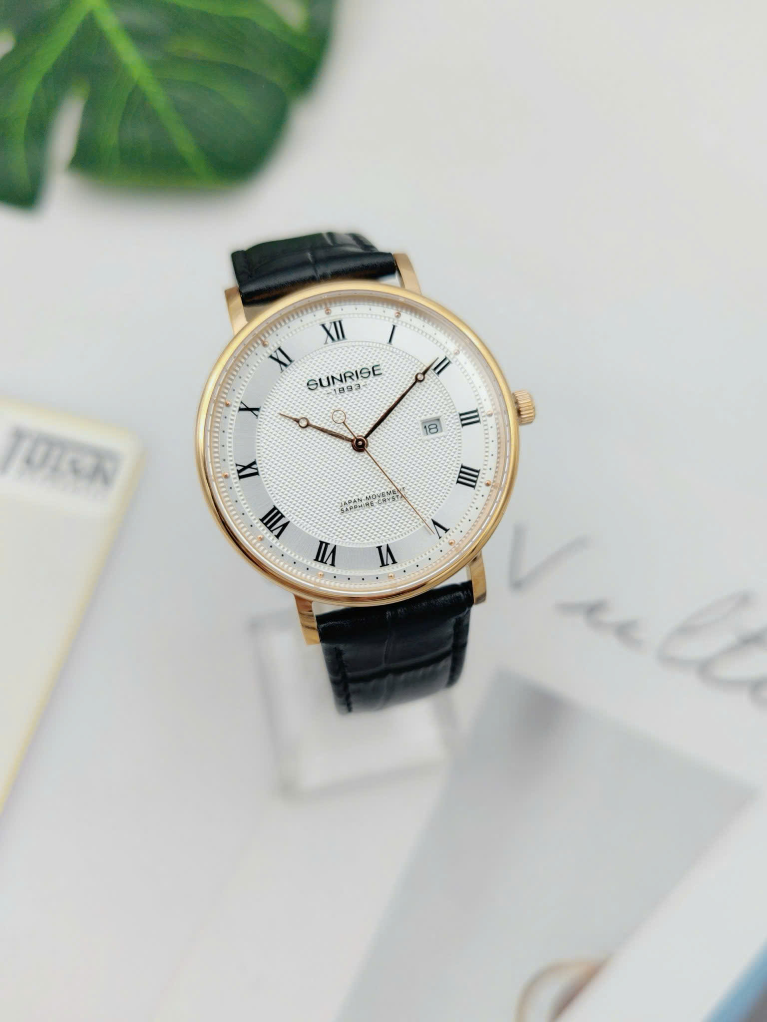 Đồng hồ nam Sunrise Viền Vàng hồng Mặt Vàng 1257PA-RGW-LBk chính hãng được bảo hành 2 năm, thay pin miễn phí 10 năm tại shop.