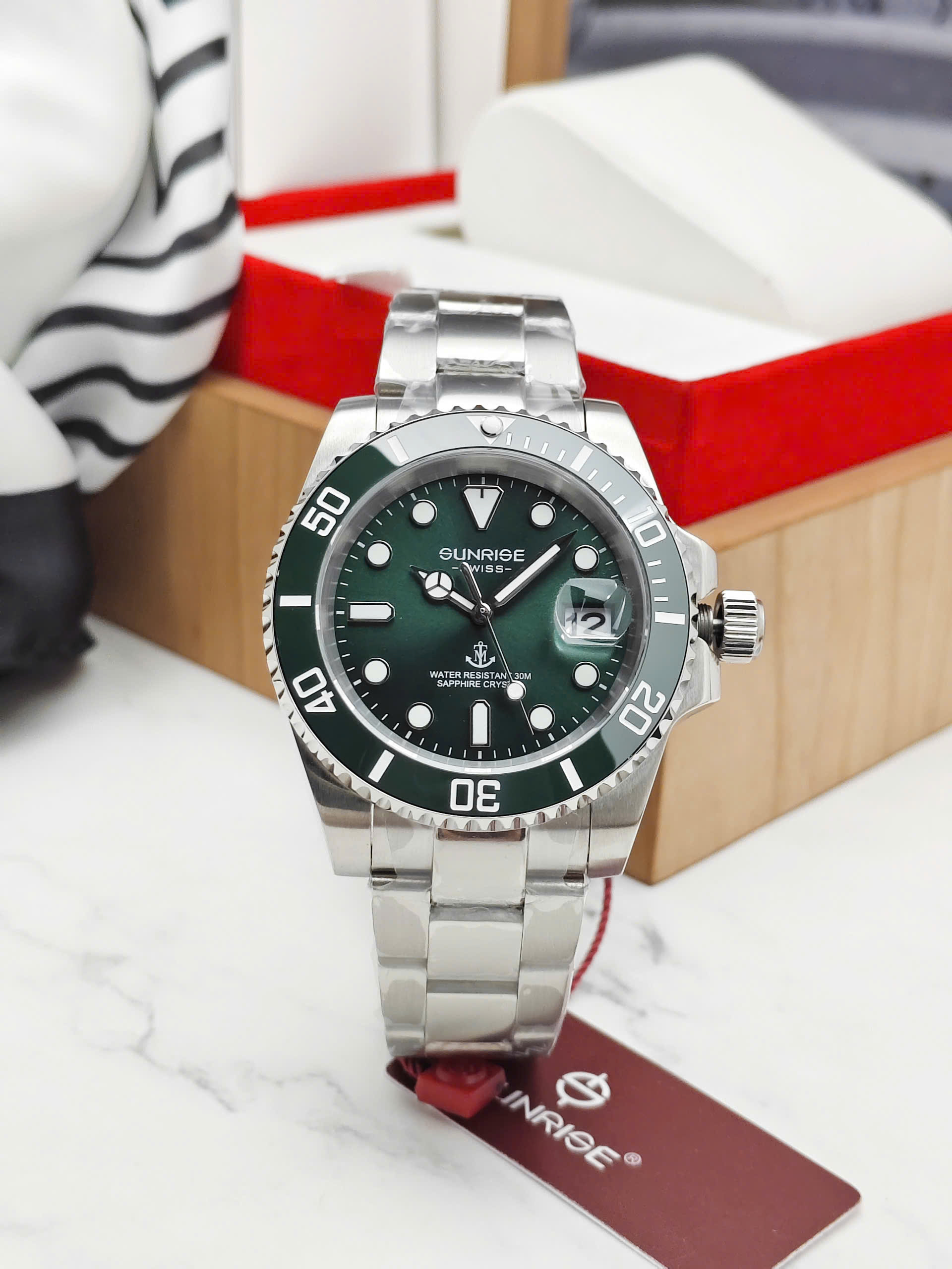 Đồng hồ nam Sunrise 1343SA-Green thuộc dòng 1343SA của thương hiệu Sunrise Thụy Sĩ, gây ấn tượng mạnh với thiết kế hiện đại và màu sắc cá tính. Mặt số xanh lá (Green) độc đáo mang đến cảm giác trẻ trung, khác biệt nhưng vẫn giữ được vẻ lịch lãm cần có cho nam giới. Đường kính mặt số 41mm tạo sự cân đối trên cổ tay, phù hợp cho cả môi trường công sở lẫn những buổi gặp gỡ thường ngày.