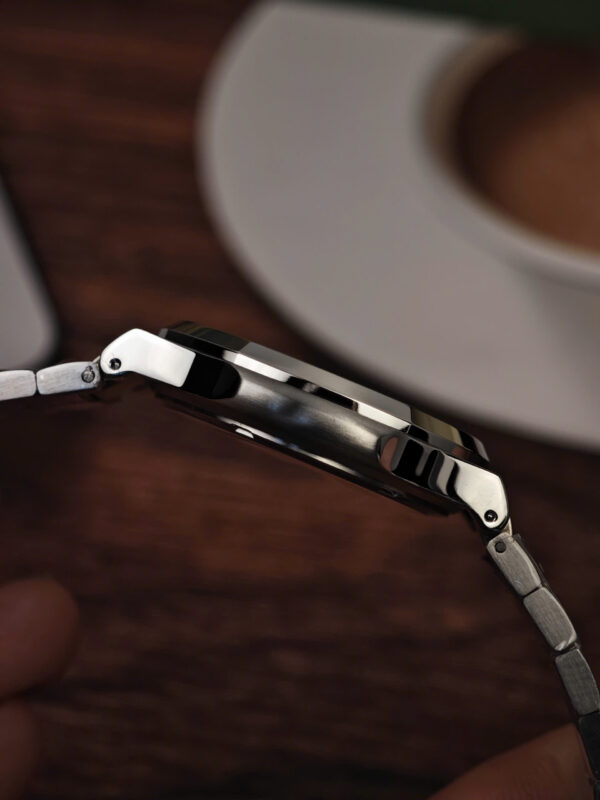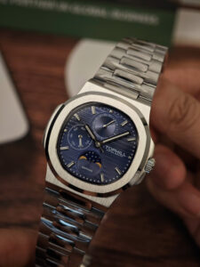 Sở hữu dáng Nautilus thiết kế vỏ trắng mặt xanh tuyệt đẹp. Size nhỏ gọn chỉ 40mm nhưng trang bị bộ lịch Thứ, Ngày, Sun & Moon tiện dụng.
