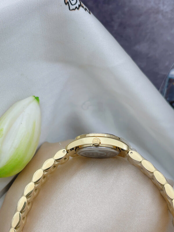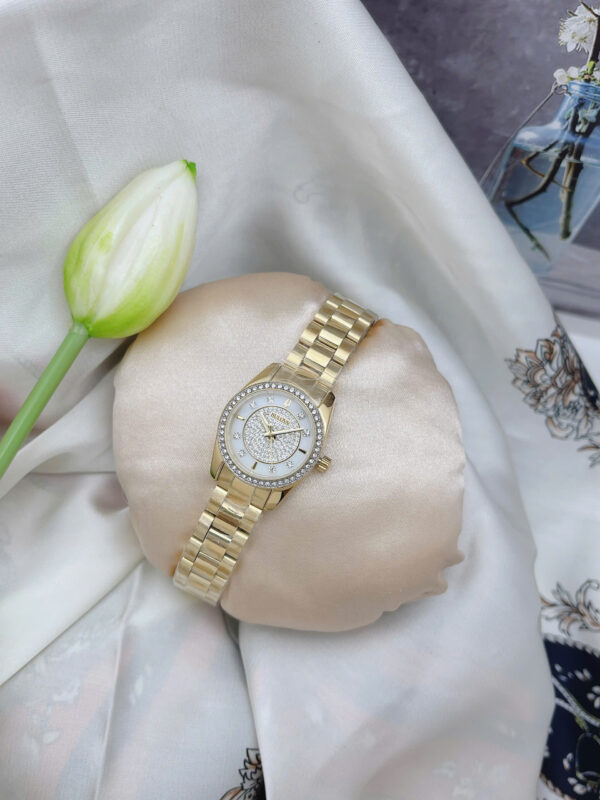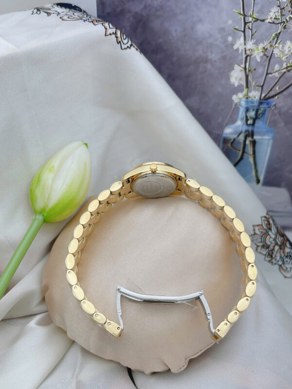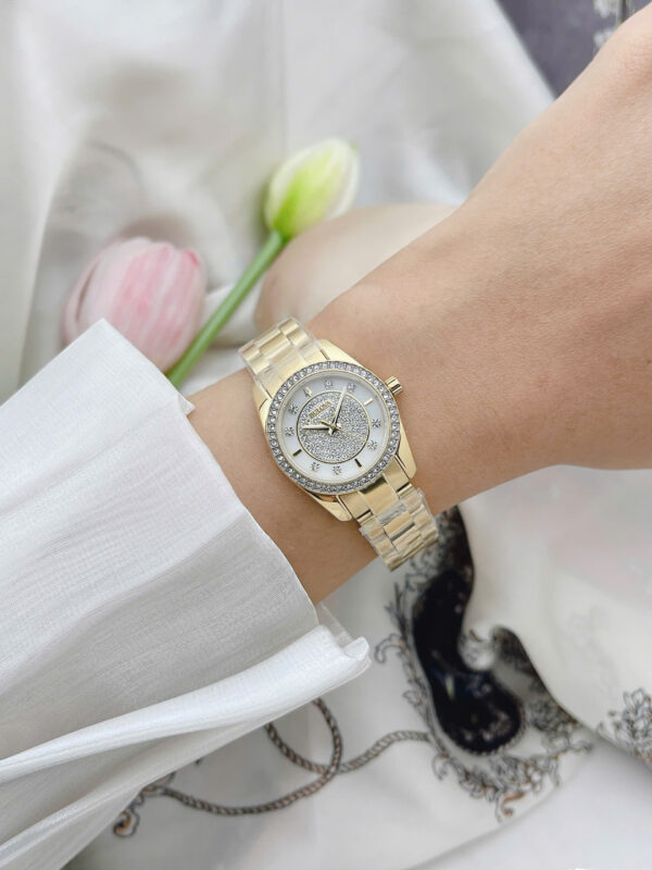 Đồng hồ được thiết kế với màu vàng chủ đạo, với 8 cọc số đính đá, mặt đồng hồ cũng được đính đá lấp lánh vô cùng thu hút ánh nhìn.