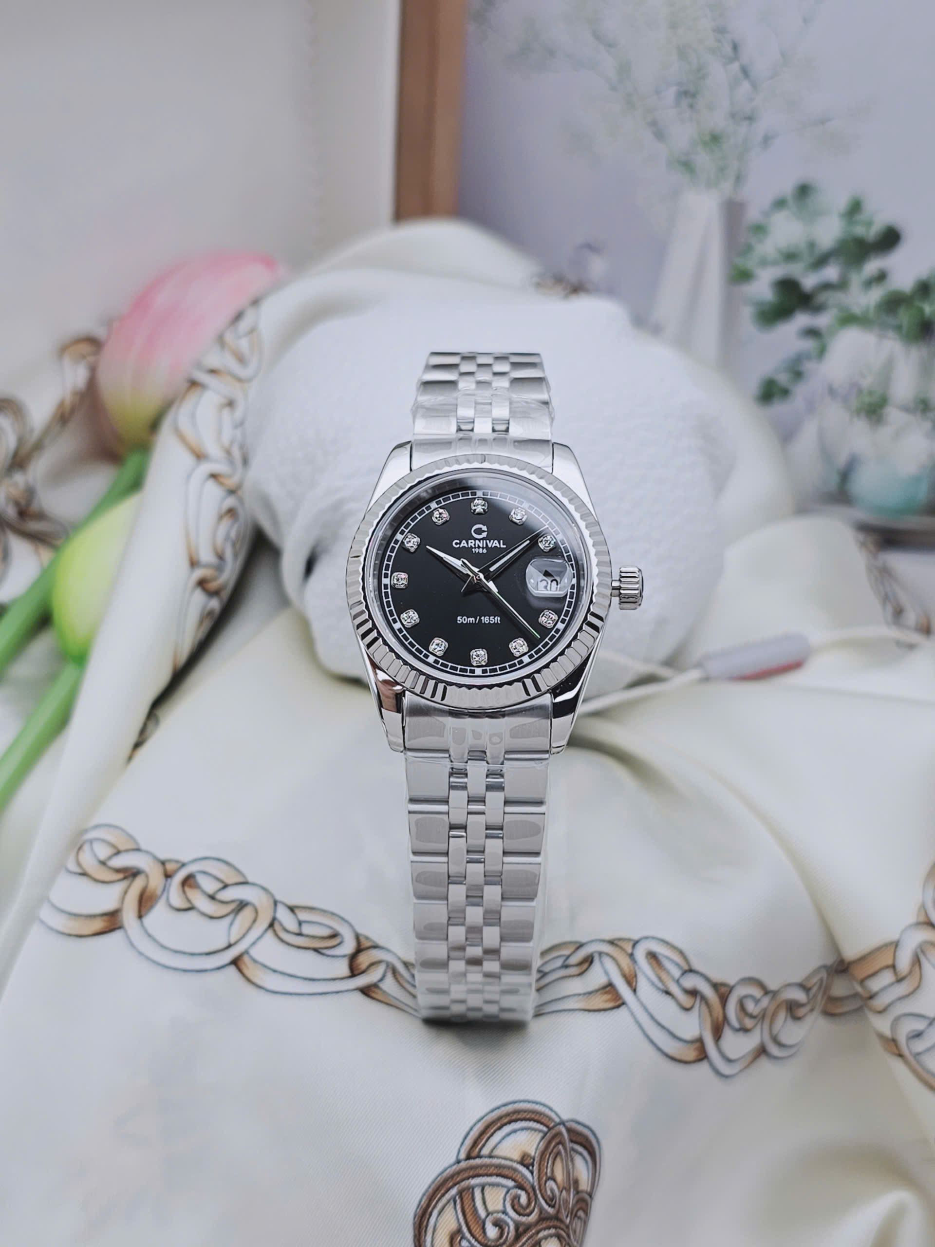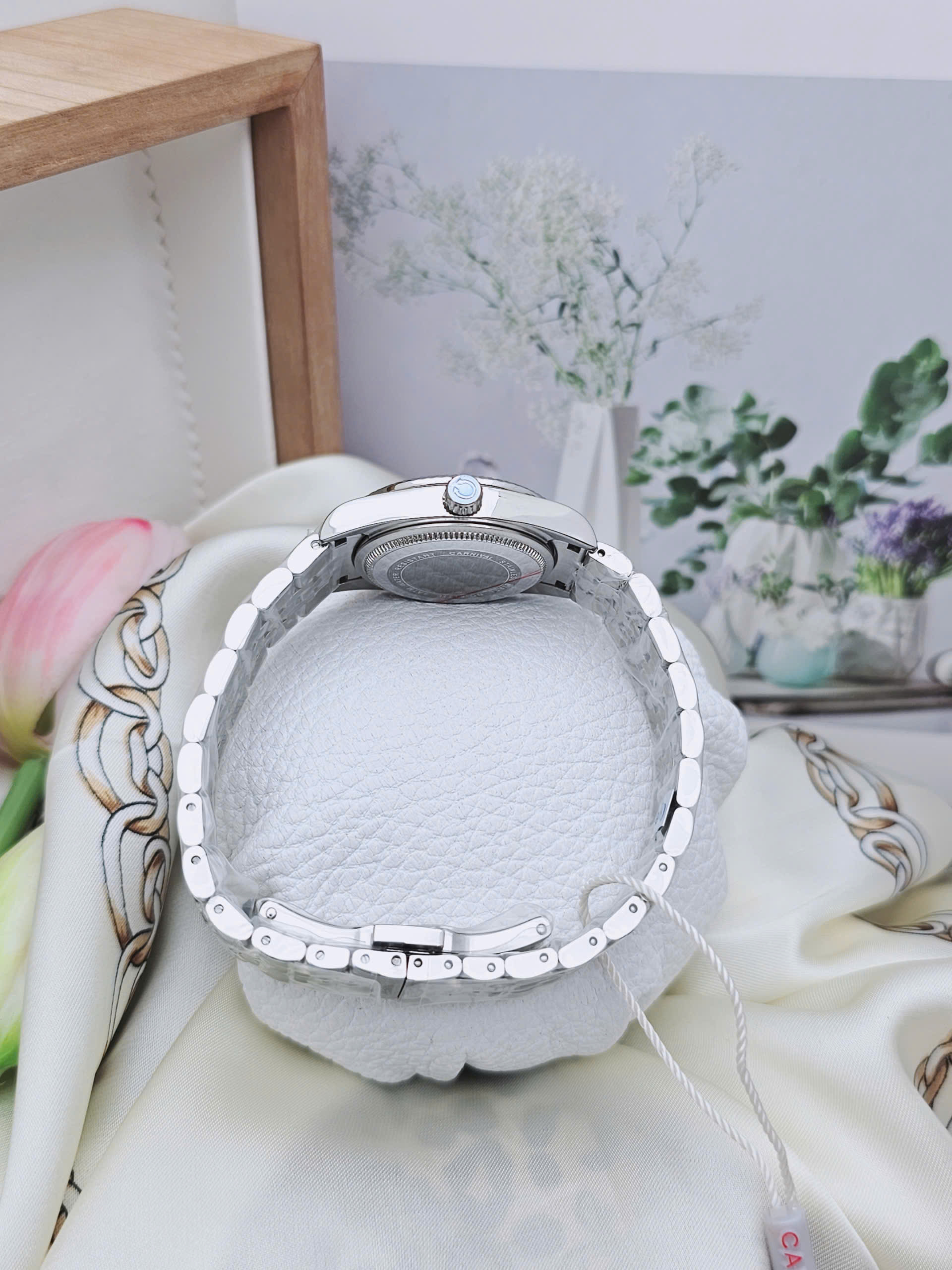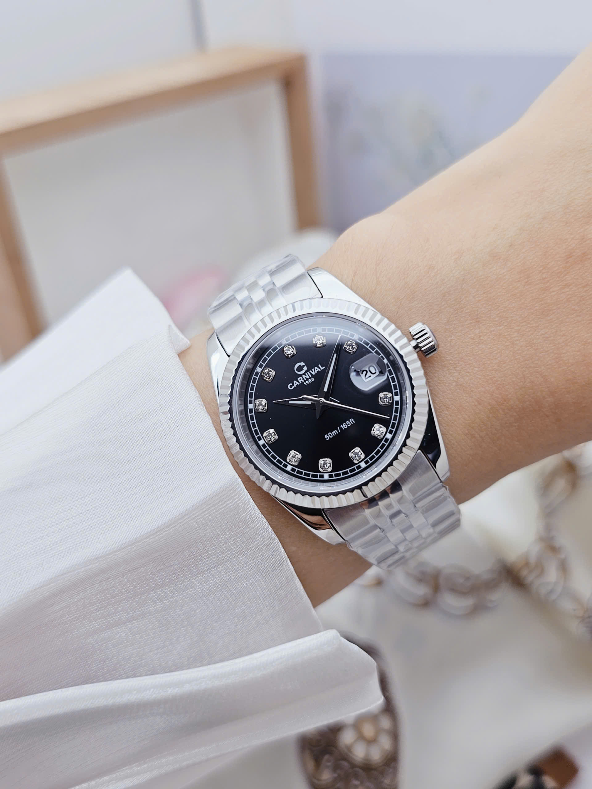 Mặt kính Sapphire tăng độ sang trọng và khả năng chống trầy cực tốt – bạn có thể yên tâm sử dụng hàng ngày mà không lo mặt kính mờ hay trầy xước do va chạm thường gặp. Với đường kính chỉ khoảng 30mm, mẫu đồng hồ này rất hài hòa với cổ tay phụ nữ châu Á – mang lại vẻ ngoài thanh mảnh, dịu dàng, dễ phối đồ cho nhiều dịp khác nhau.