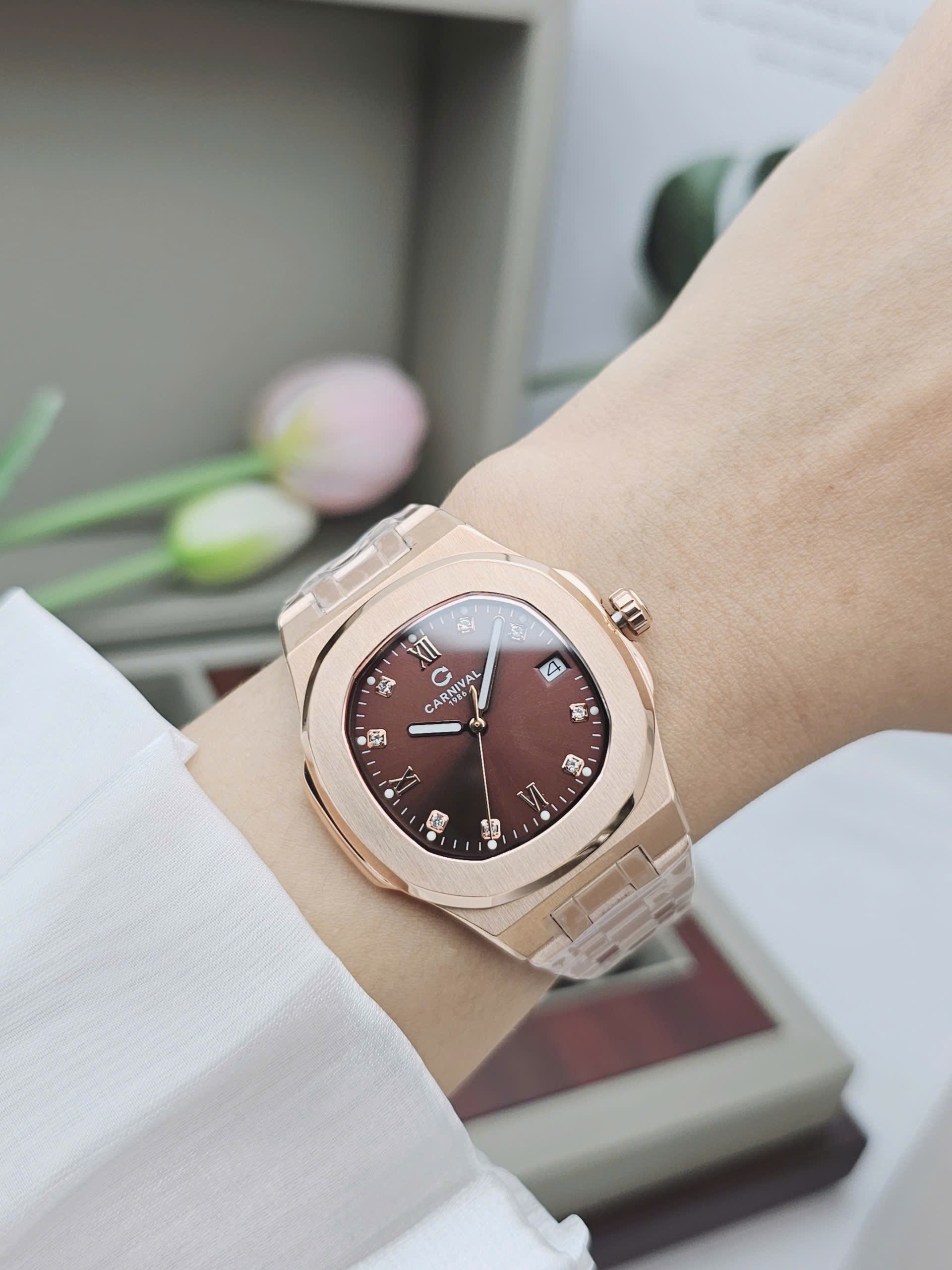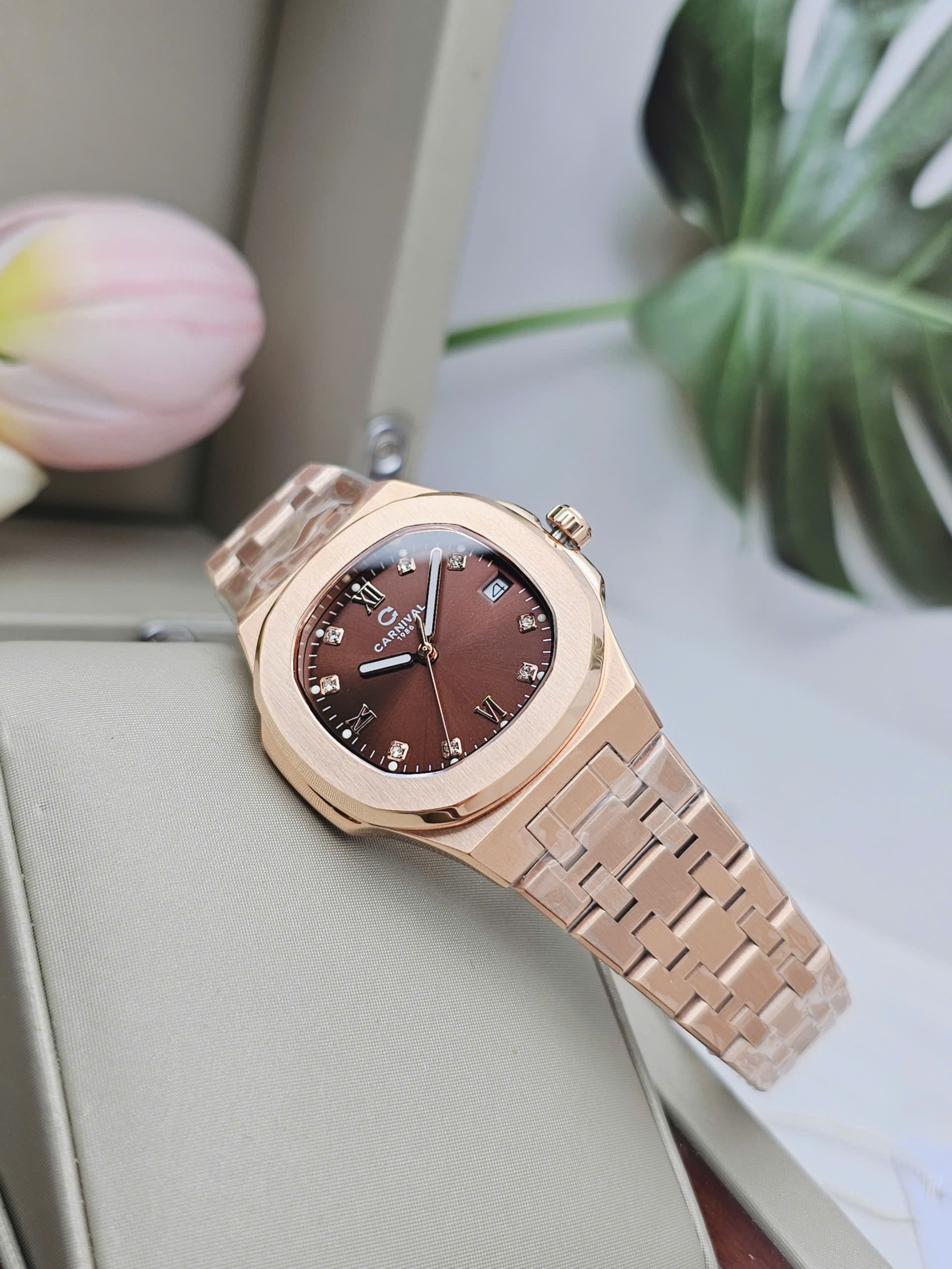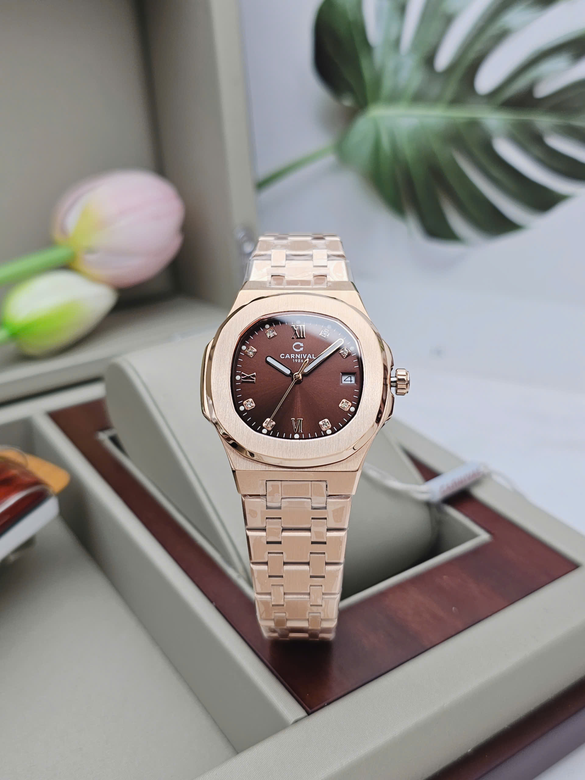 Carnival 8160L-VH-N1 là hiện thân của vẻ đẹp thanh lịch mang hơi thở châu Âu, dành riêng cho người phụ nữ yêu sự tinh xảo. Thương hiệu Carnival đến từ Thụy Sỹ mang theo tinh thần chuẩn mực trong thiết kế, thể hiện rõ qua mặt số nâu trầm ấm đầy chiều sâu. Kích thước 34mm cùng độ dày chỉ 7.8mm tạo nên dáng vẻ mảnh mai, nhẹ nhàng trên cổ tay, tôn vinh nét duyên dáng tự nhiên mà không phô trương.