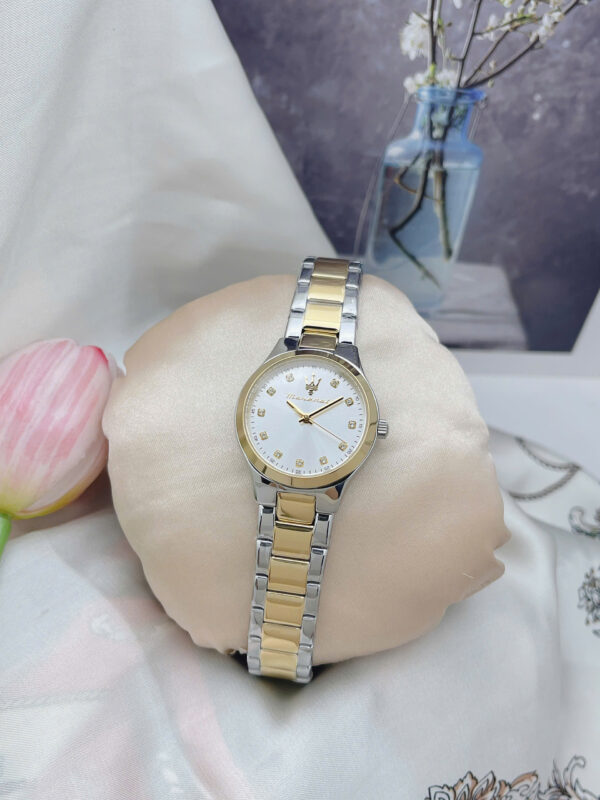 Đồng hồ nữ Maserati Attrazione R8853151505 với thiết kế cây đinh ba chủ đạo, viền inox được mạ màu vàng gold, mặt trắng, dây thép không gỉ được kết hợp với màu vàng gold trùng với màu viền, đồng thời toàn bộ phần cọc số được đính bằng đá lấp lánh mang lại vẻ ngoài sang chảnh, tự tin nhưng không kém phần sang trọng cho các bạn.