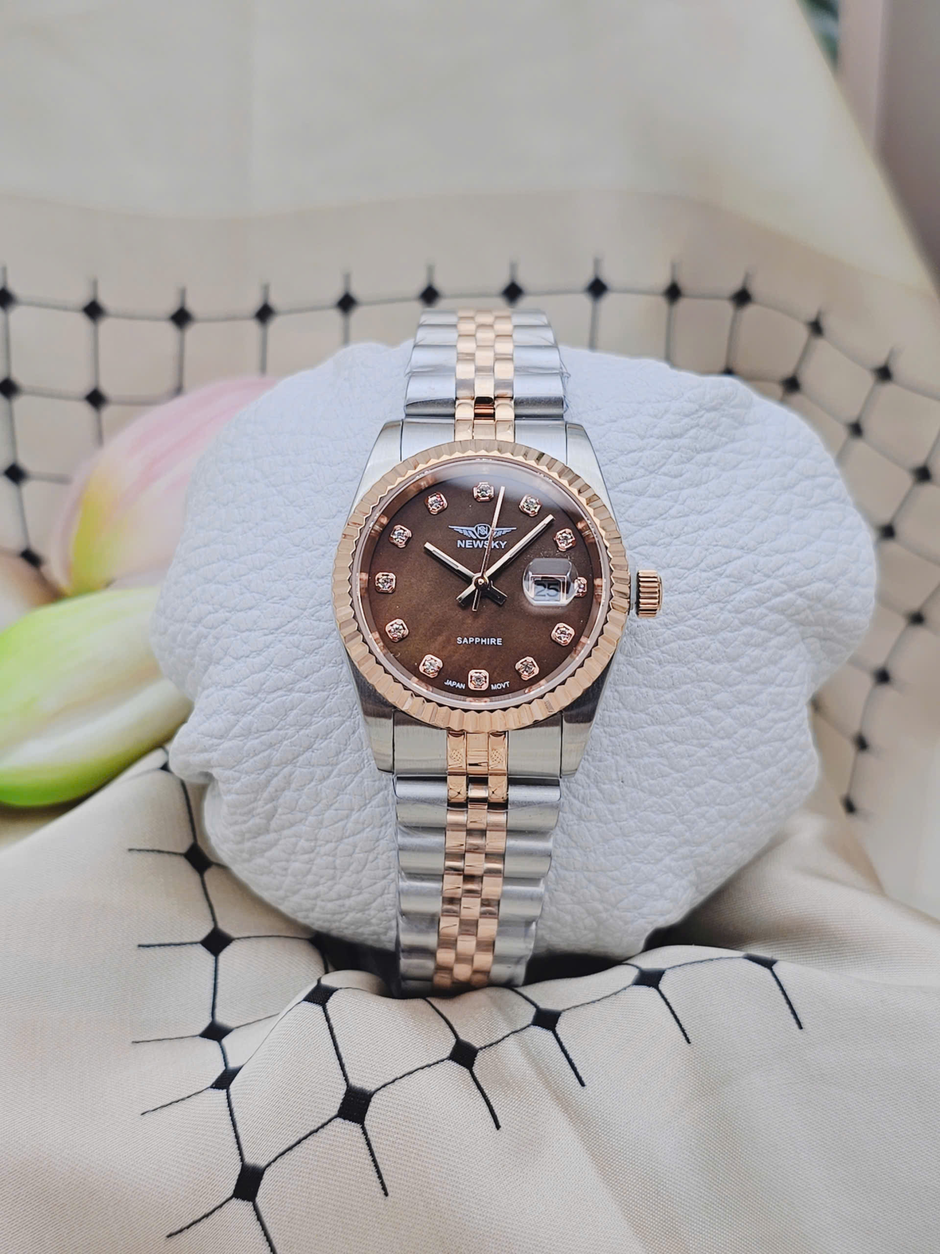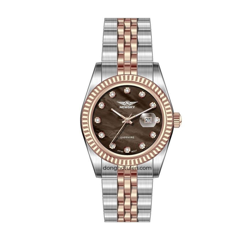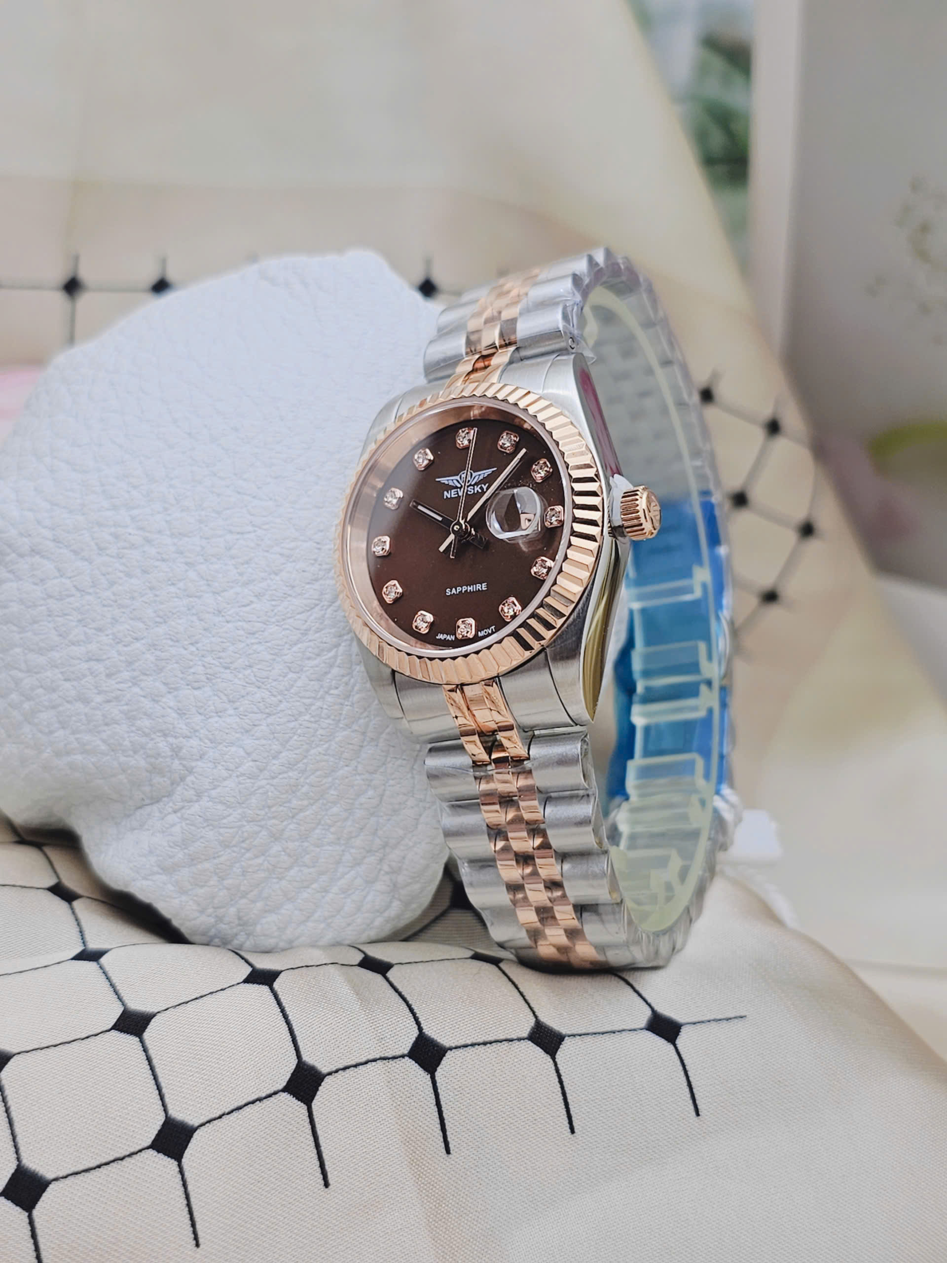 Đồng hồ nữ NEWSKY NS5023L.S06 gây ấn tượng với thiết kế demi tinh tế, kết hợp hài hòa giữa hai tông màu bạc và vàng hồng sang trọng, mang đậm phong cách thanh lịch của thương hiệu Nhật Bản. Mặt số tròn 28mm nhỏ gọn, ôm tay vừa vặn, đặc biệt phù hợp với phái đẹp yêu thích sự nhẹ nhàng nhưng vẫn nổi bật. Mặt số màu nâu độc đáo tạo chiều sâu thị giác, mang đến vẻ đẹp hiện đại và khác biệt so với các mẫu đồng hồ truyền thống.