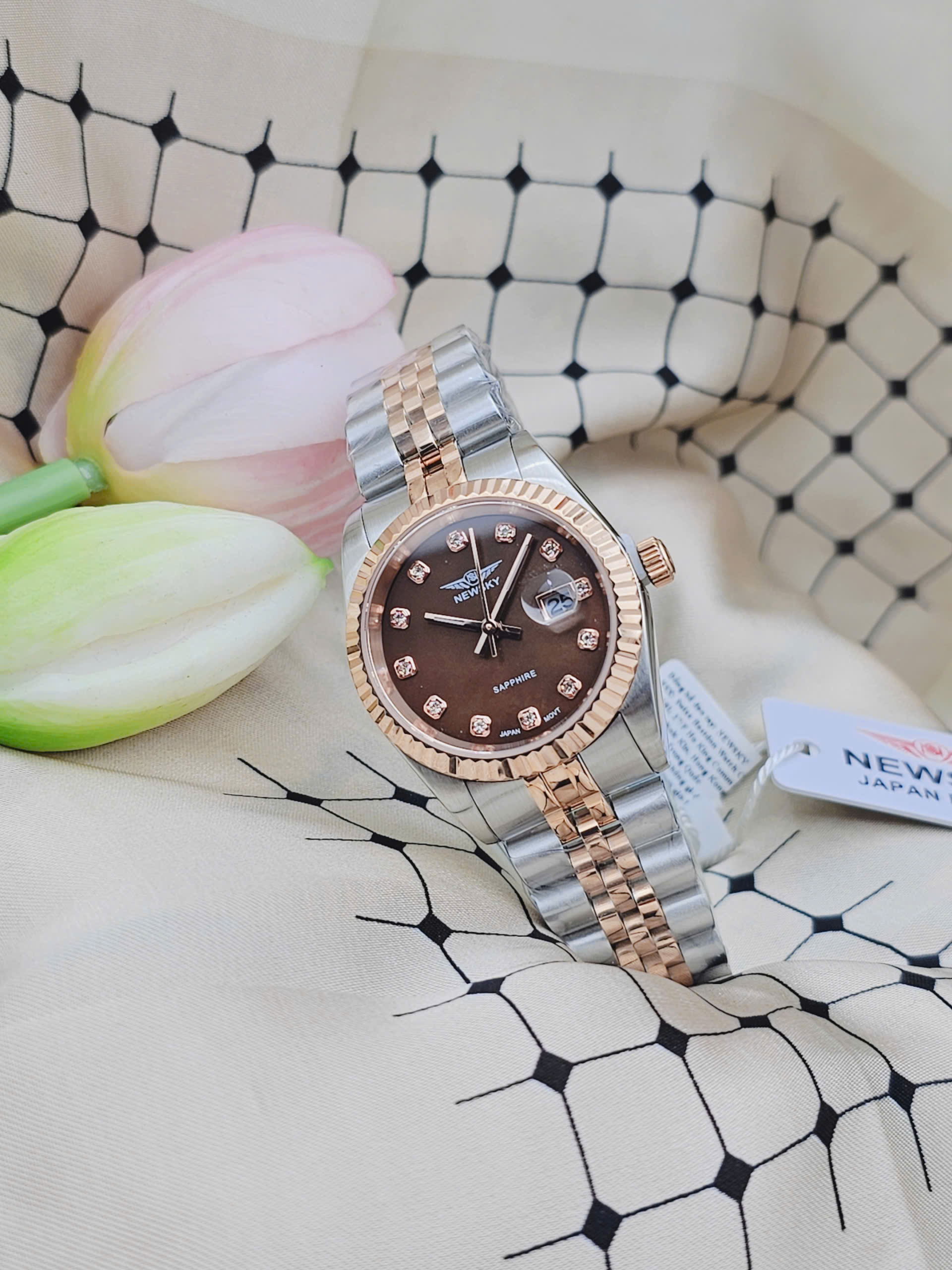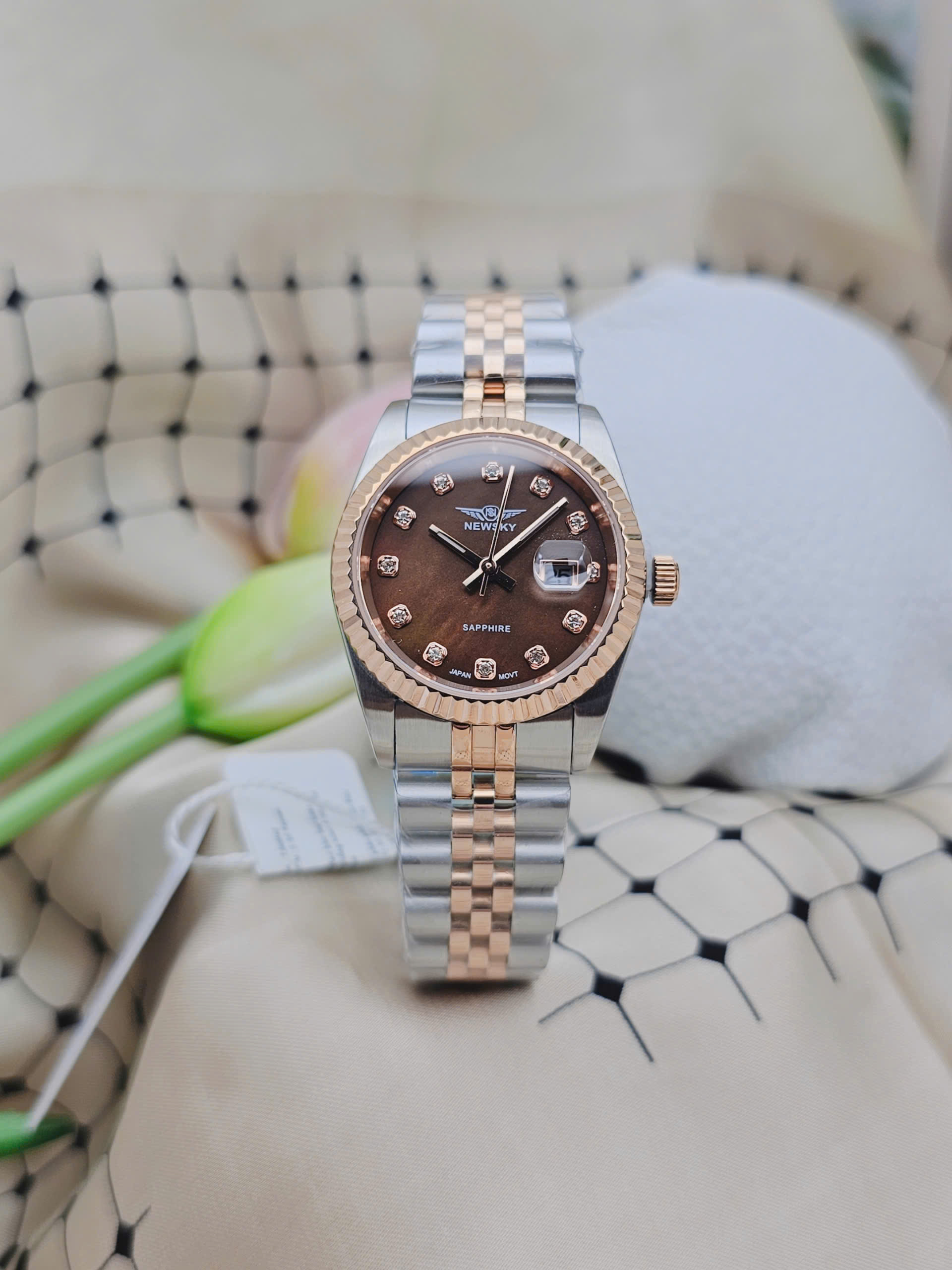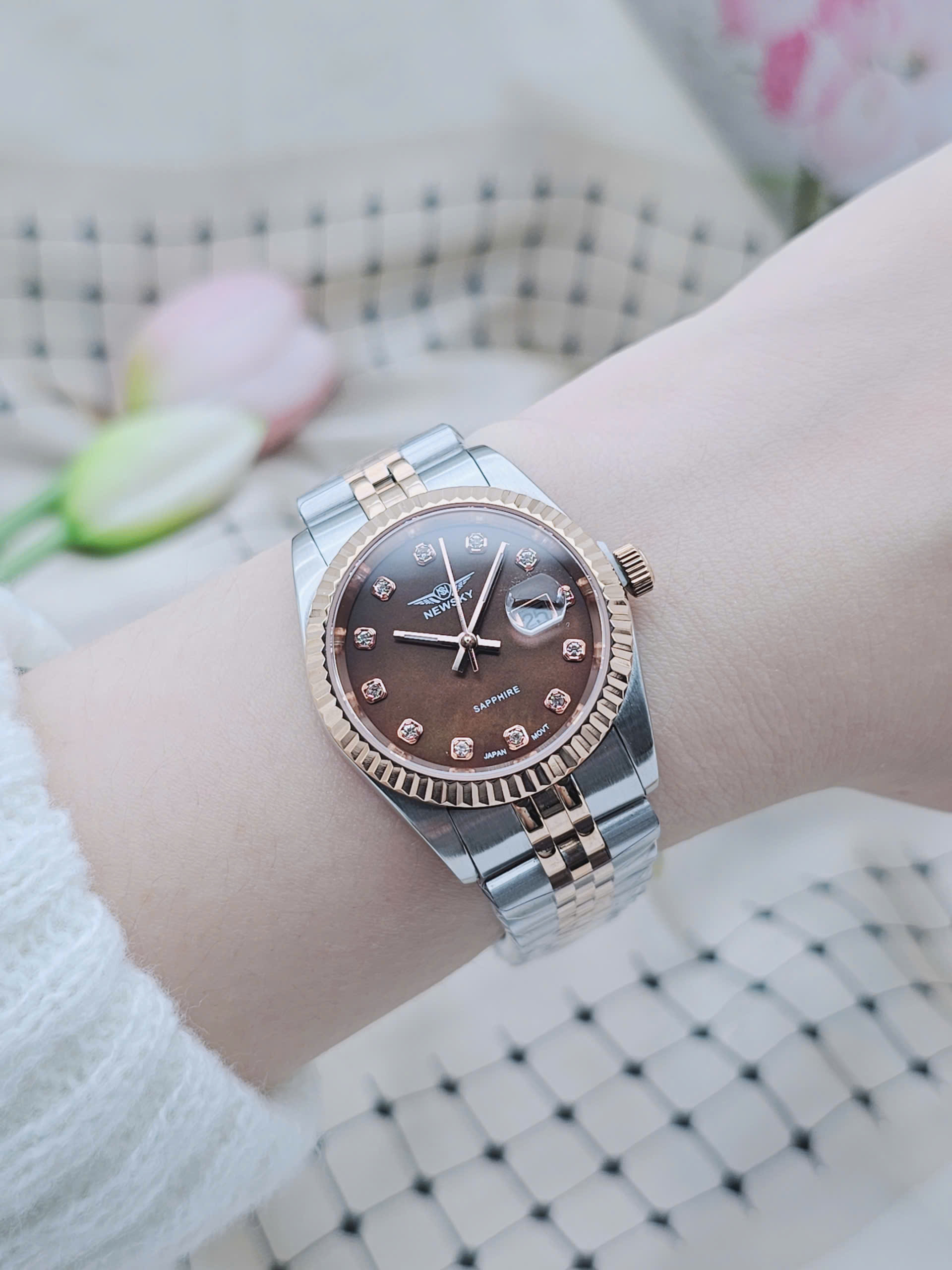 Đồng hồ nữ NEWSKY NS5023L.S06 gây ấn tượng với thiết kế demi tinh tế, kết hợp hài hòa giữa hai tông màu bạc và vàng hồng sang trọng, mang đậm phong cách thanh lịch của thương hiệu Nhật Bản. Mặt số tròn 28mm nhỏ gọn, ôm tay vừa vặn, đặc biệt phù hợp với phái đẹp yêu thích sự nhẹ nhàng nhưng vẫn nổi bật. Mặt số màu nâu độc đáo tạo chiều sâu thị giác, mang đến vẻ đẹp hiện đại và khác biệt so với các mẫu đồng hồ truyền thống.