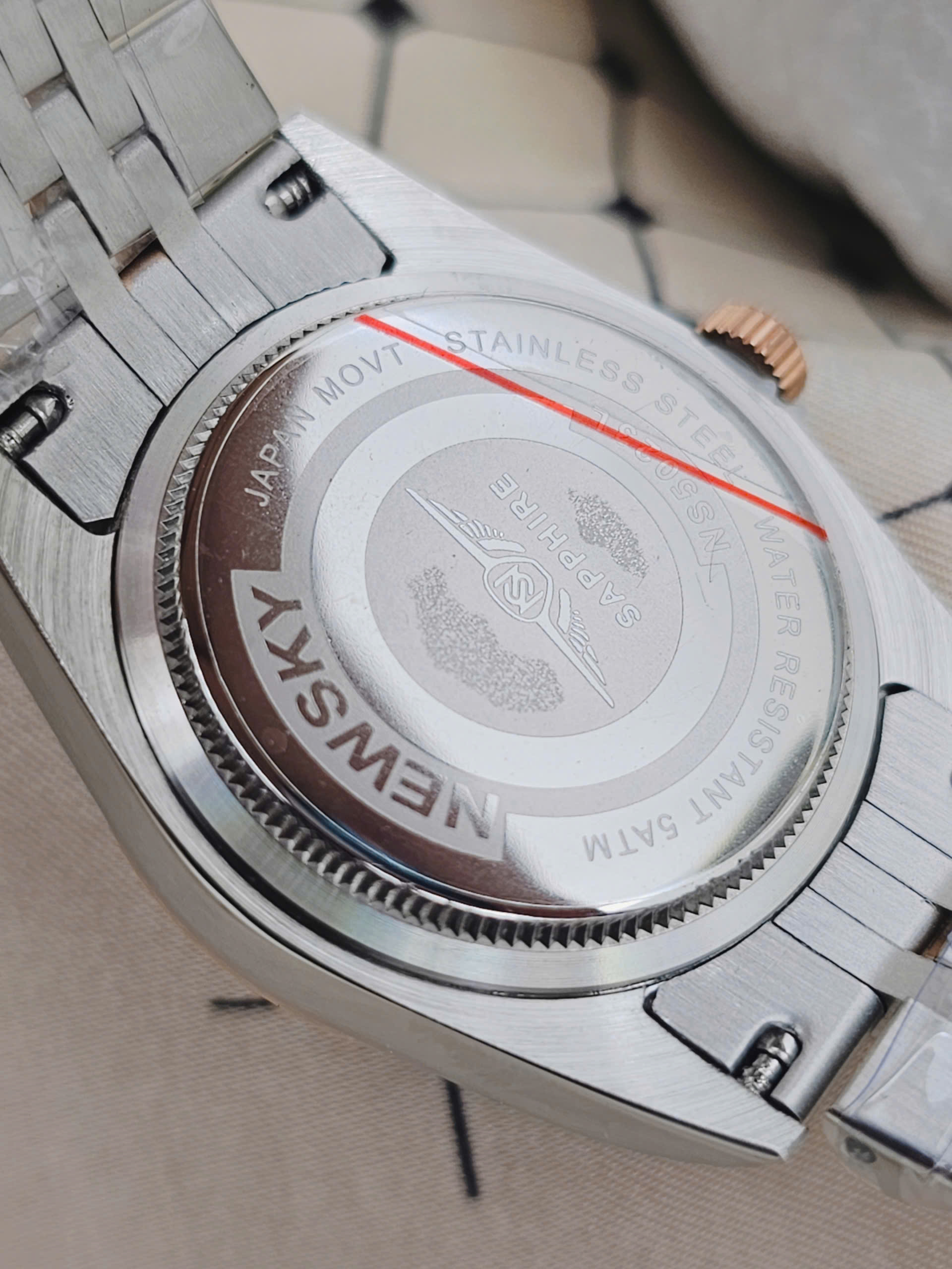 NEWSKY NS5023L.S06 được hoàn thiện từ thép không gỉ cao cấp cho cả vỏ và dây đeo, đảm bảo độ bền cao và khả năng chống oxy hóa tốt. Dây thép demi bạc – vàng hồng không chỉ chắc chắn mà còn giúp đồng hồ dễ phối với nhiều loại trang sức khác nhau. Mặt kính sapphire cao cấp có khả năng chống trầy xước vượt trội, bảo vệ mặt số luôn sáng rõ. Đồng hồ sử dụng bộ máy pin quartz xuất xứ Nhật Bản, nổi tiếng về độ chính xác và sự ổn định trong quá trình vận hành.