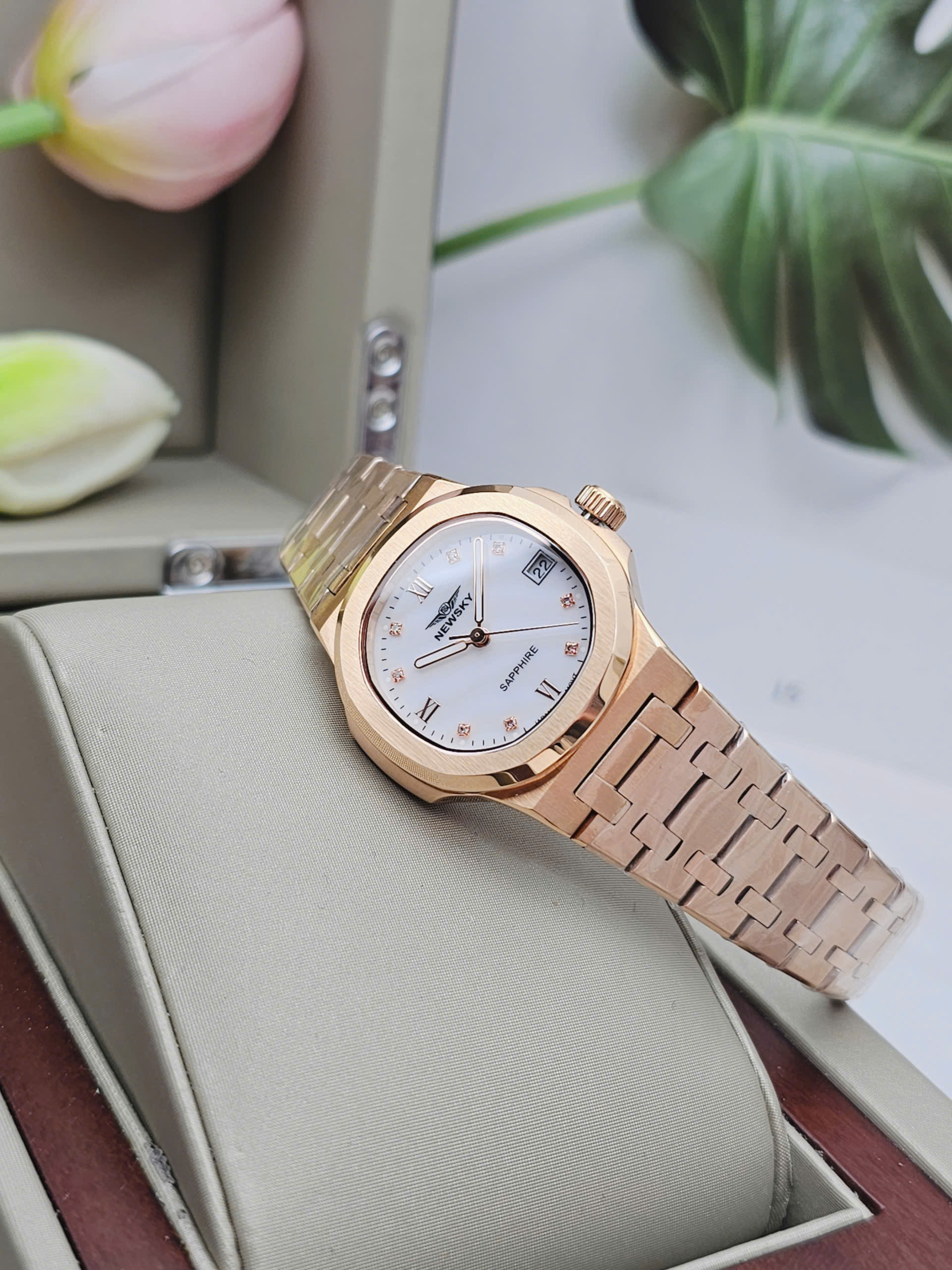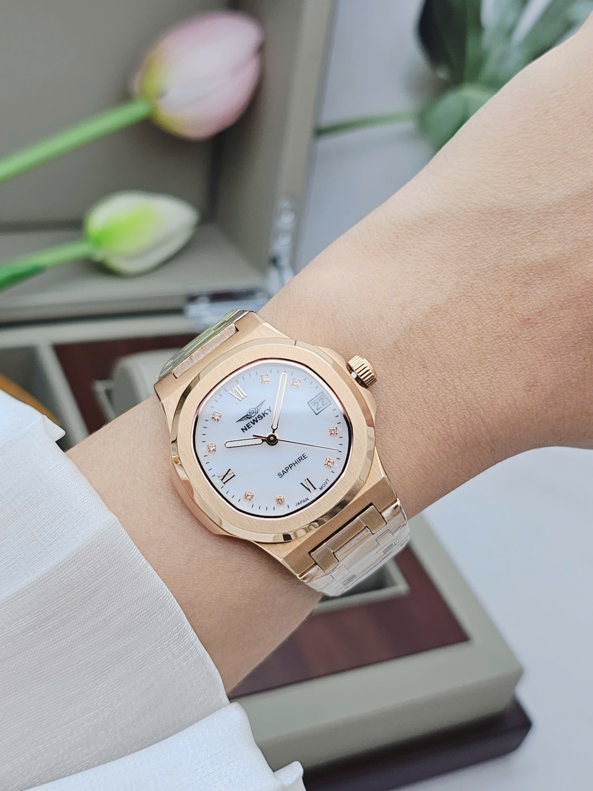 Đồng hồ nữ NEWSKY NS5025L-S05 là sự kết hợp hài hòa giữa phong cách thanh lịch và công nghệ chế tác hiện đại đến từ Nhật Bản. Sản phẩm sử dụng bộ máy Quartz Japan Movt nổi tiếng về độ chính xác và bền bỉ, mang lại sự an tâm tuyệt đối trong quá trình sử dụng hằng ngày. Thiết kế mặt số gọn gàng với kích thước vỏ 34mm giúp tôn lên vẻ nữ tính, phù hợp với cổ tay phụ nữ châu Á. Đây là mẫu đồng hồ lý tưởng cho những ai yêu thích sự tinh tế, tối giản nhưng vẫn sang trọng.