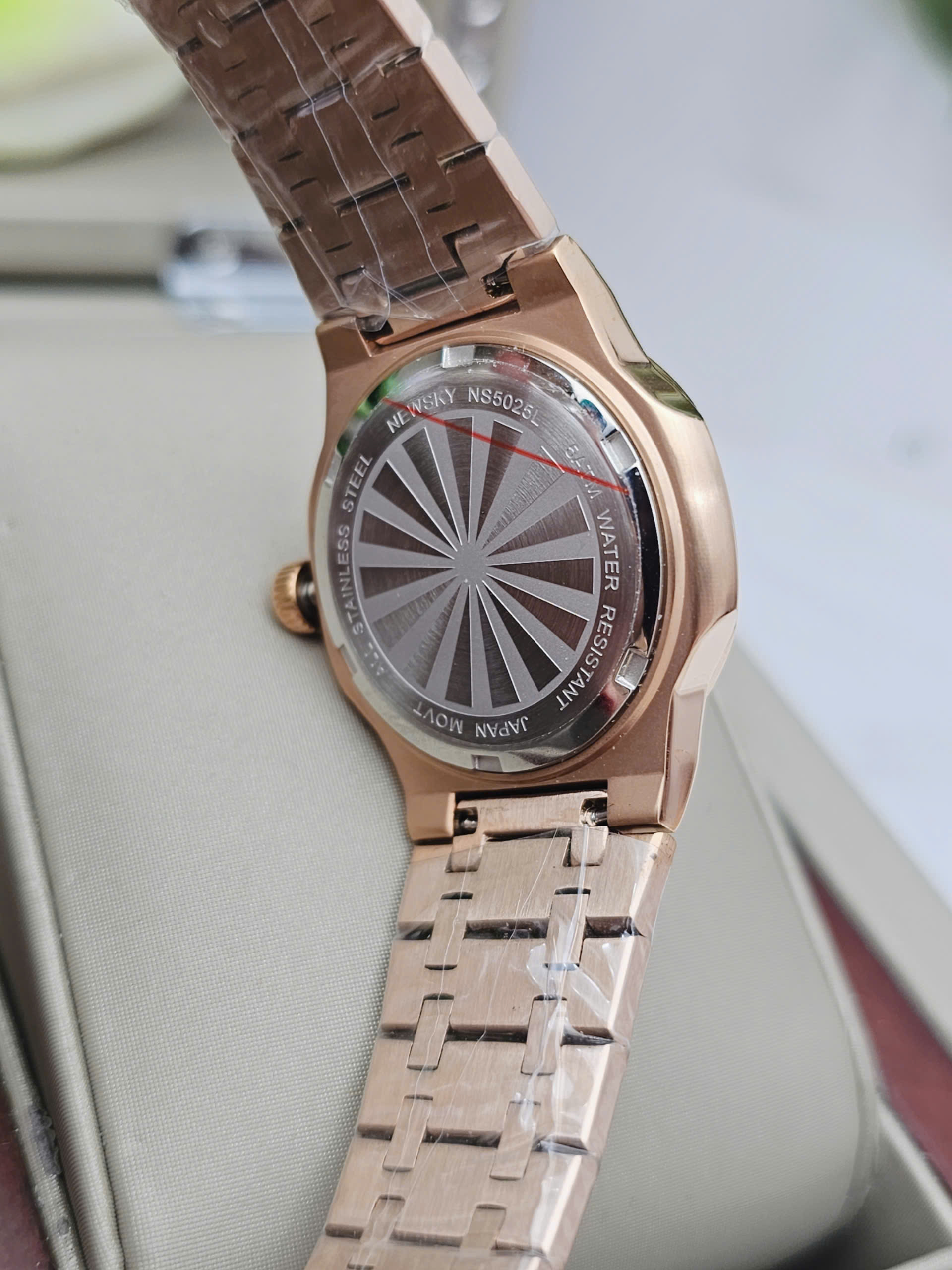 NEWSKY NS5025L-S05 sở hữu phần vỏ và dây đeo được chế tác từ thép không gỉ cao cấp, ứng dụng công nghệ mạ PVD giúp bề mặt luôn sáng đẹp, hạn chế trầy xước và phai màu theo thời gian. Dây kim loại chắc chắn nhưng vẫn tạo cảm giác thoải mái khi đeo, phù hợp cho cả môi trường công sở lẫn các buổi gặp gỡ, dạo phố. Kính sapphire chống xước hiệu quả giúp bảo vệ mặt đồng hồ tối ưu, giữ cho sản phẩm luôn như mới sau thời gian dài sử dụng.