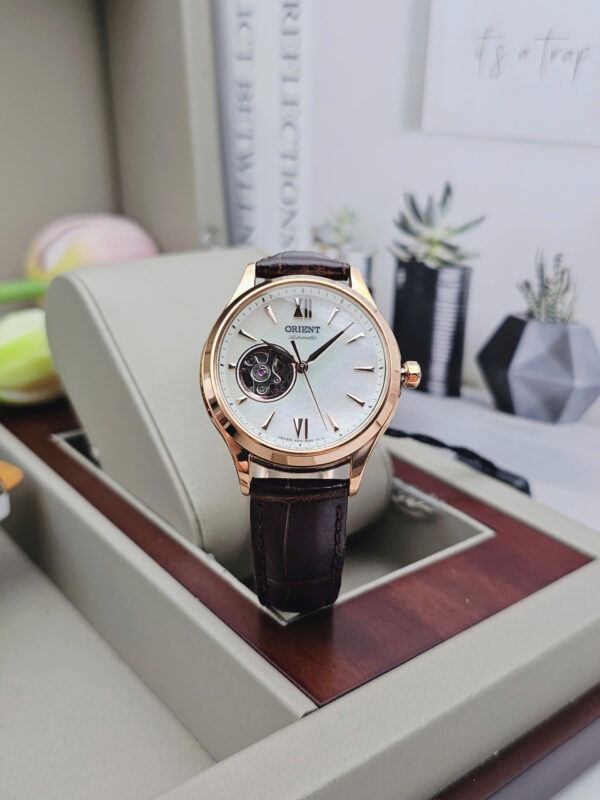 Orient Automatic RA-AG0022A là mẫu đồng hồ nữ mang vẻ đẹp thanh lịch pha lẫn nét hiện đại, đến từ thương hiệu Orient danh tiếng của Nhật Bản. Thiết kế nổi bật với kích thước mặt 35.6mm cùng độ dày chỉ 11mm, tạo cảm giác gọn gàng và tinh tế trên cổ tay phái đẹp. Phần case được mạ PVD Rose Gold thời thượng, tôn lên vẻ sang trọng và nữ tính. Điểm nhấn đặc biệt của mẫu đồng hồ này nằm ở thiết kế hở tim tại vị trí 9 giờ, mang lại nét cuốn hút riêng cho người đeo.