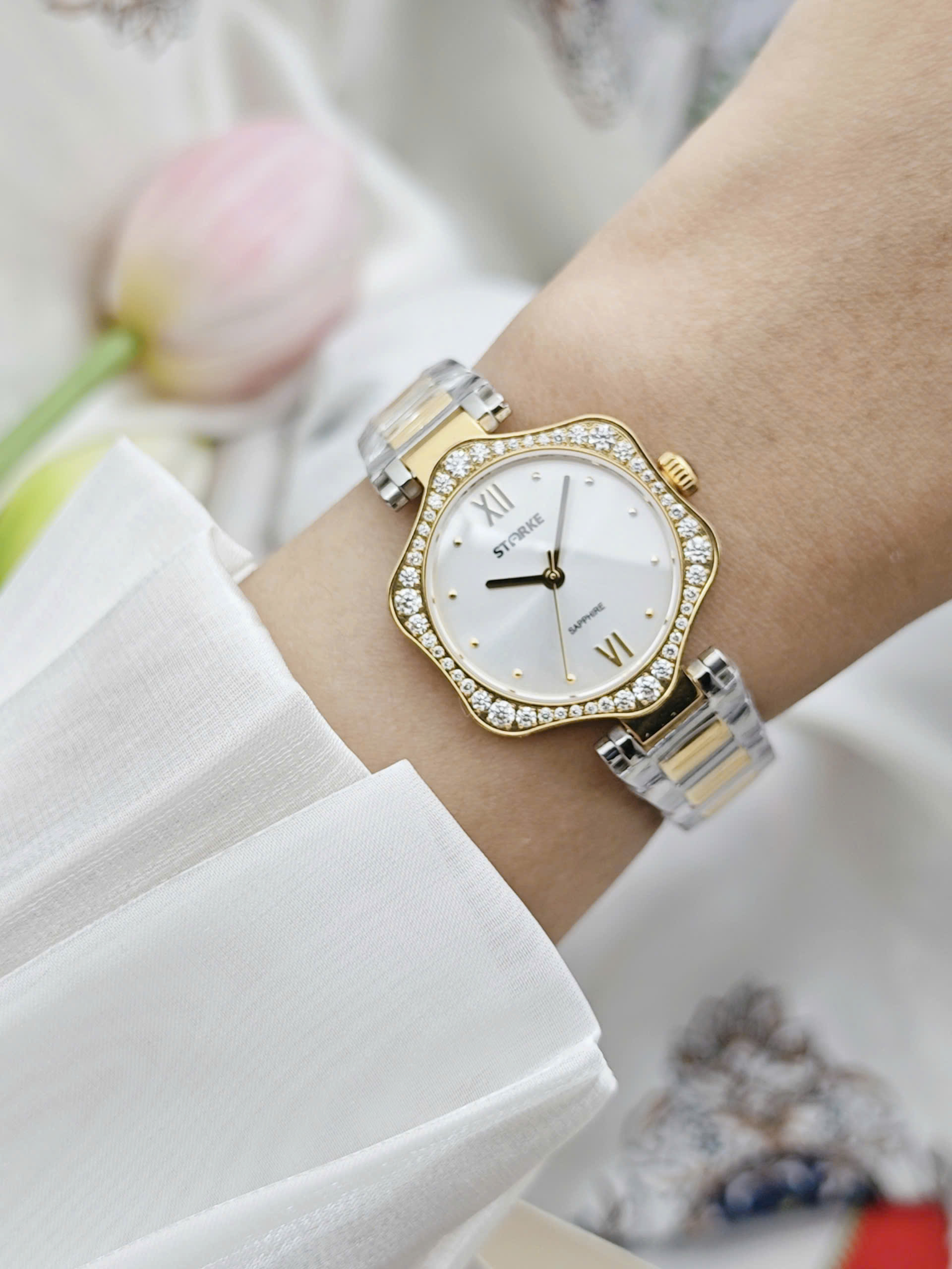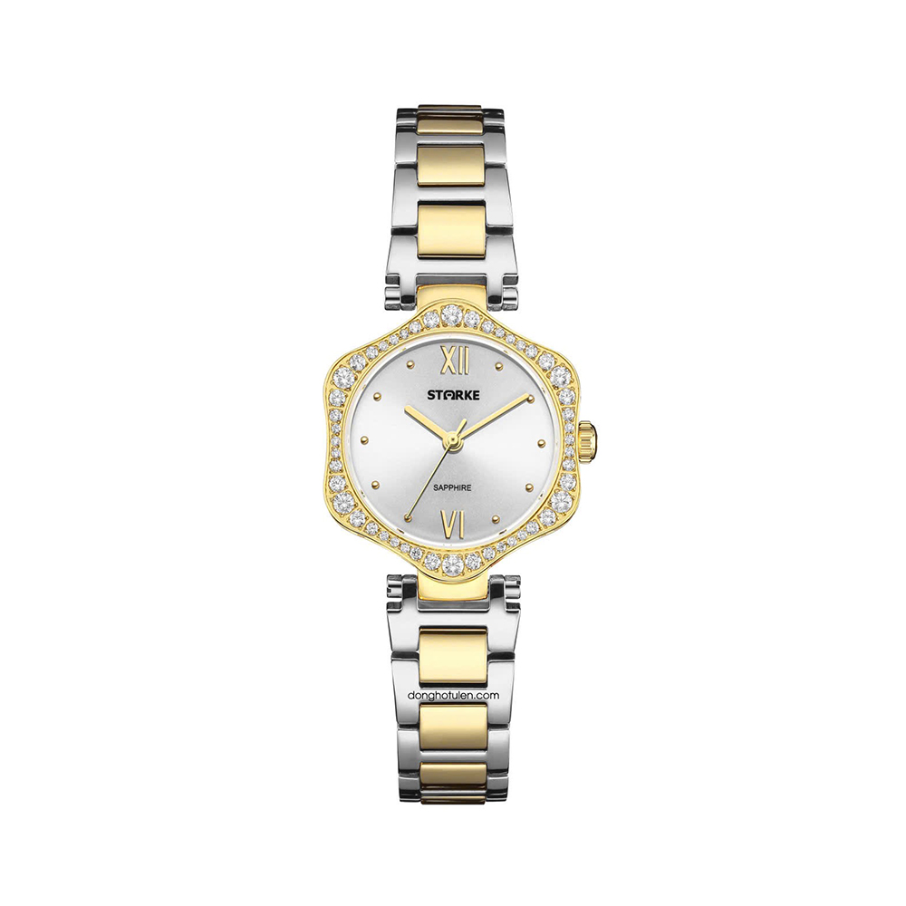 Đồng hồ nữ STARKE SK184AL – AAW là mẫu đồng hồ mang phong cách thanh lịch, nhẹ nhàng nhưng vẫn toát lên vẻ sang trọng hiện đại. Thiết kế mặt số tròn kích thước 27mm nhỏ gọn, rất phù hợp với cổ tay nữ giới, tạo cảm giác tinh tế và nữ tính khi đeo. Mặt số màu trắng trang nhã kết hợp viền vàng nổi bật, giúp tổng thể đồng hồ trở nên hài hòa và dễ phối với nhiều trang phục khác nhau, từ công sở đến dạo phố hay dự tiệc.