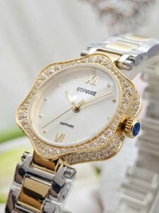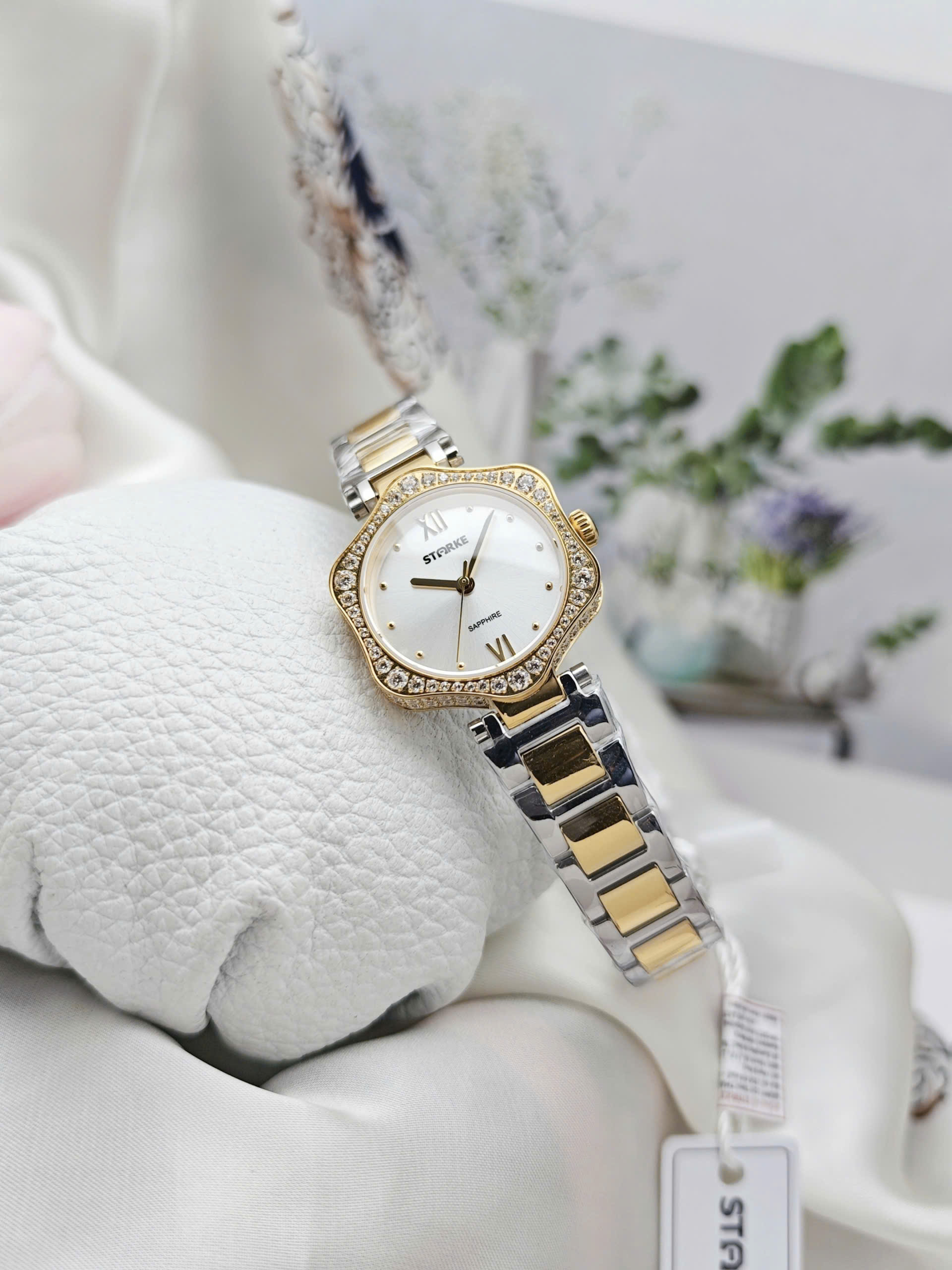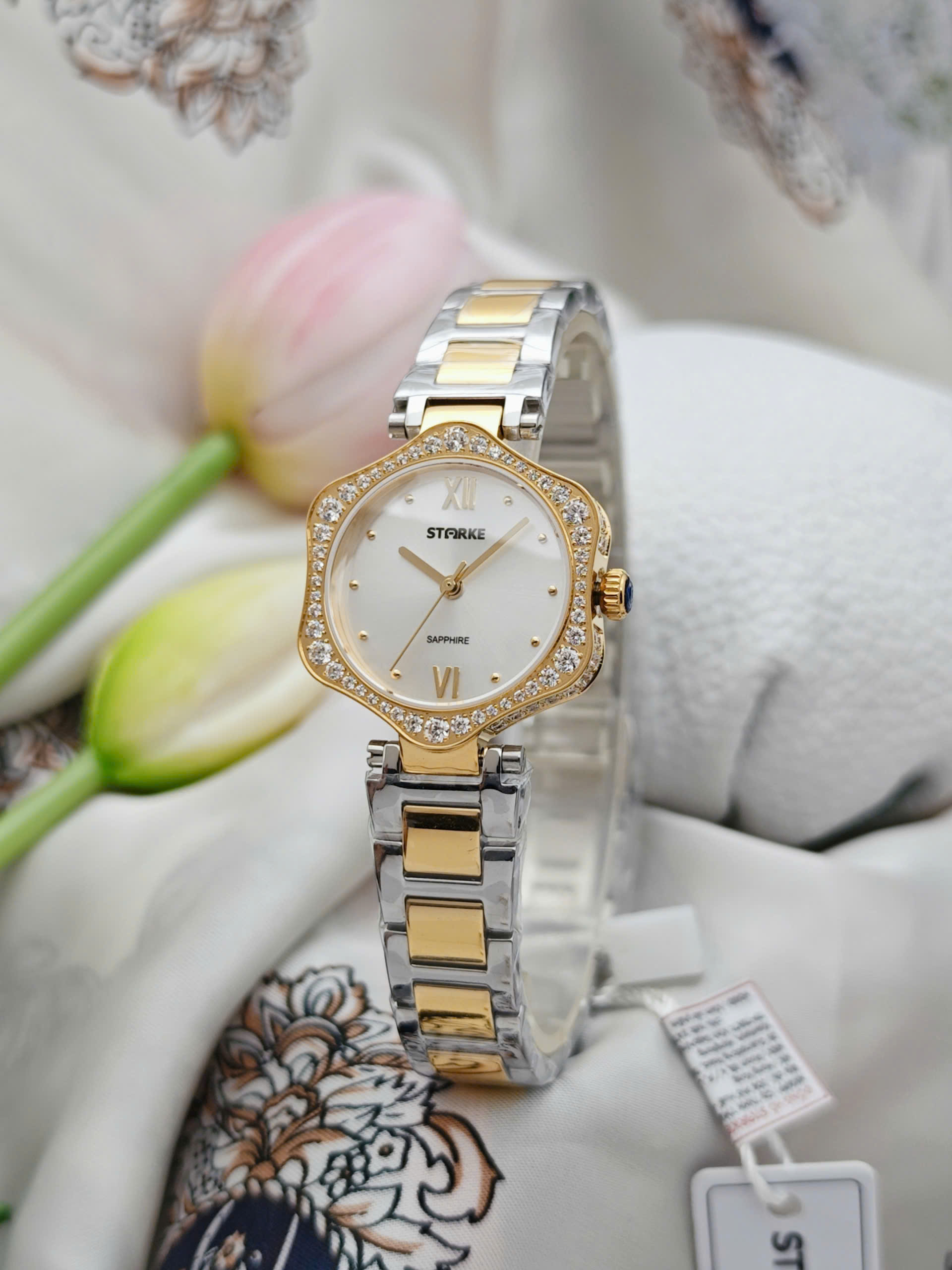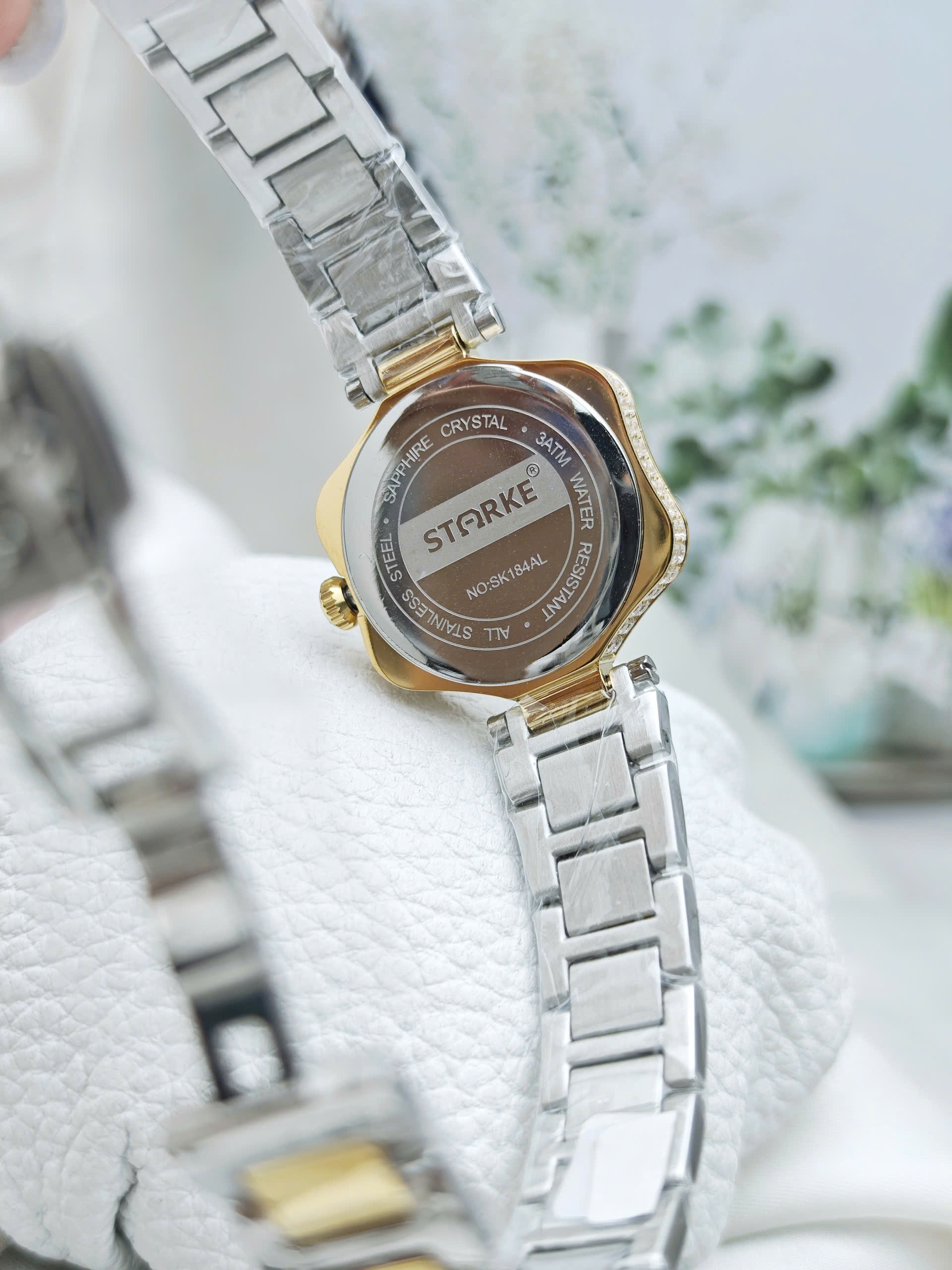 Vỏ và dây đeo của STARKE SK184AL – AAW được chế tác từ thép không gỉ 316L, ứng dụng công nghệ mạ PVD bền màu, chống oxy hóa hiệu quả. Thiết kế dây demi phối giữa màu vàng và bạc tạo điểm nhấn sang trọng, hiện đại. Đồng hồ có khả năng chịu nước 3ATM, đáp ứng tốt các nhu cầu cơ bản như rửa tay hay đi mưa nhẹ. Sản phẩm đi kèm full box đầy đủ, thích hợp làm quà tặng tinh tế dành cho phái đẹp.