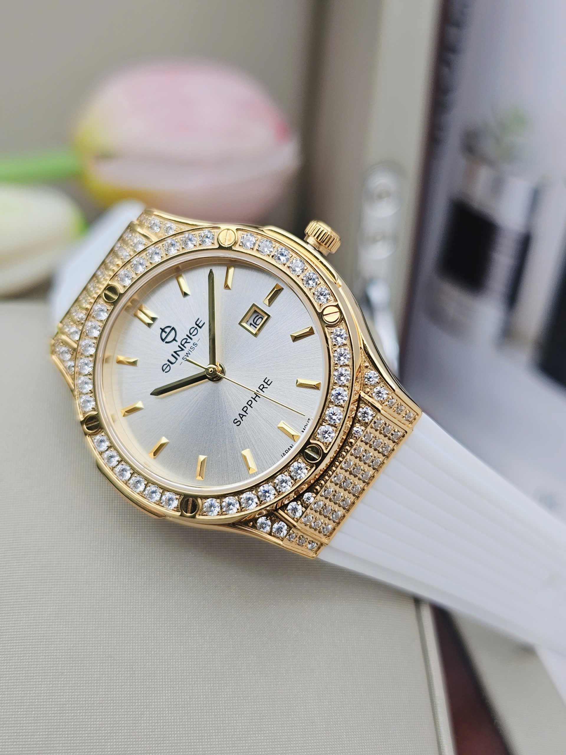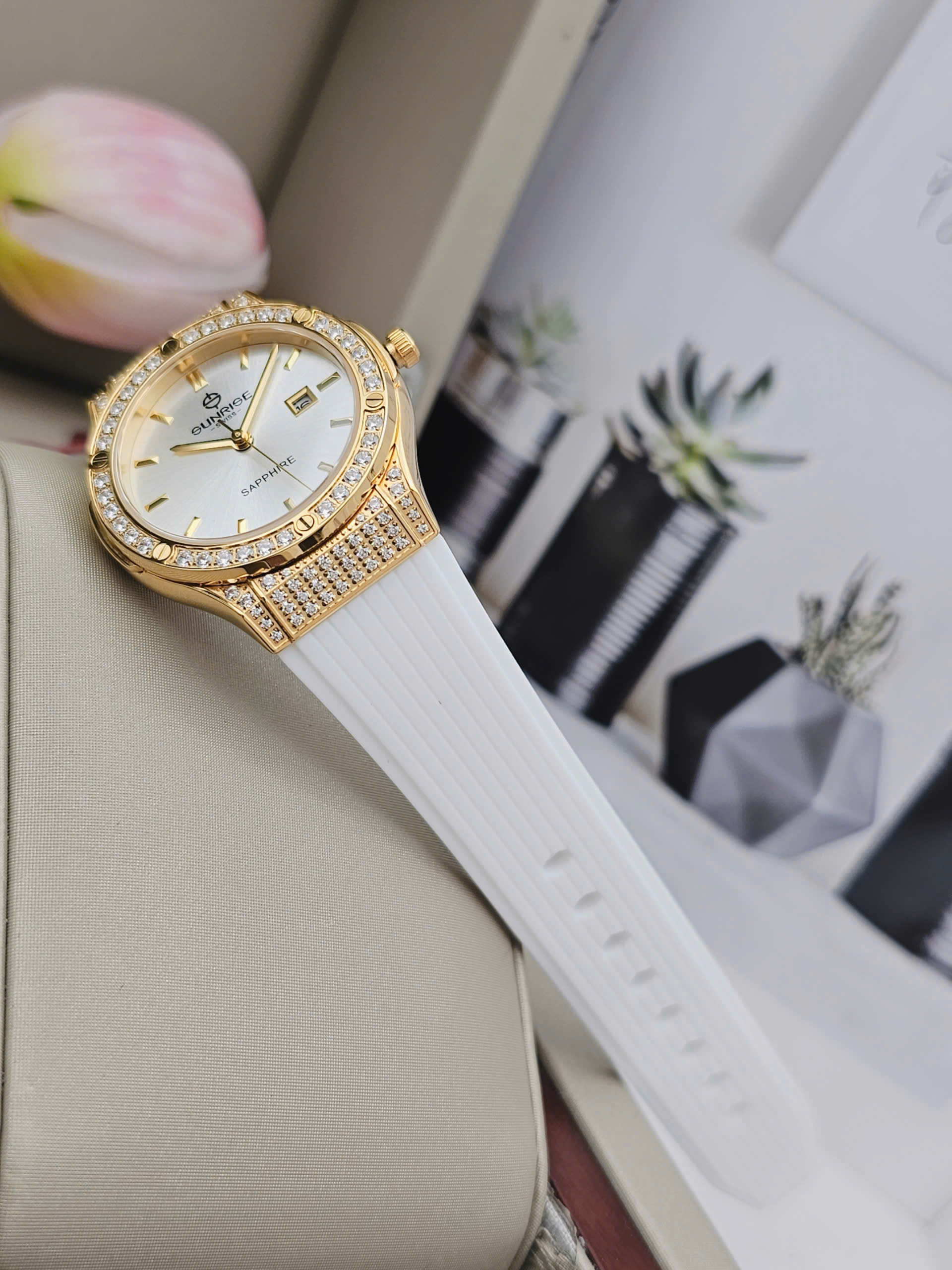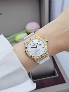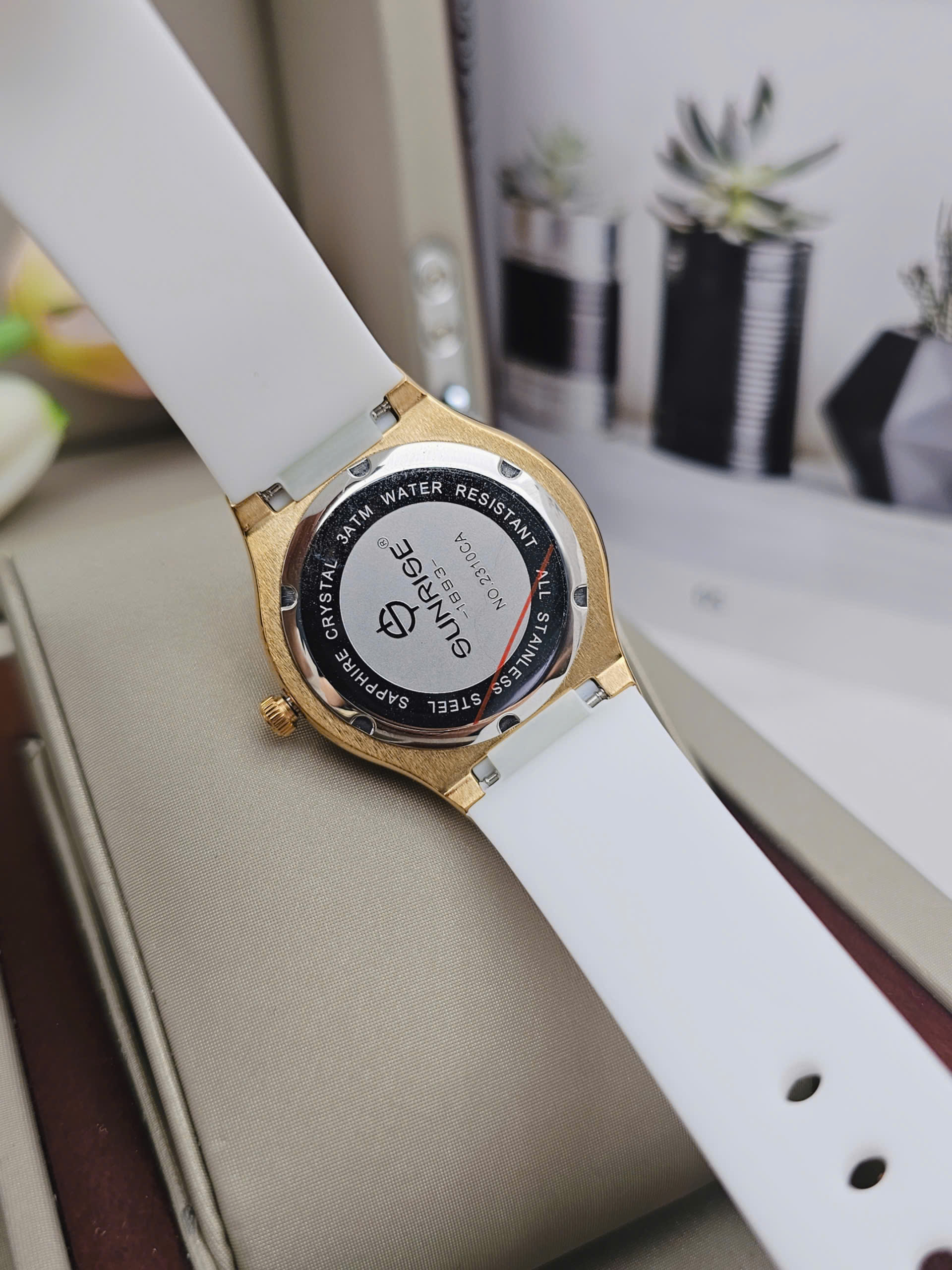 Dây silicone màu trắng mềm mại ôm trọn cổ tay, mang lại cảm giác thoải mái và nhẹ nhàng suốt cả ngày dài. Sự kết hợp giữa dây trắng tinh khôi, mặt số đồng điệu và viền vàng đính đá sang trọng giúp Sunrise 2310CA-VV-T dễ dàng hòa hợp với nhiều phong cách, từ trang phục công sở thanh lịch đến những buổi dạo phố dịu dàng. Dù được sản xuất tại Trung Quốc, chiếc đồng hồ vẫn thể hiện trọn vẹn tinh thần chất lượng và thẩm mỹ đặc trưng của thương hiệu Sunrise, trở thành điểm nhấn tinh tế cho vẻ đẹp của phái nữ.
