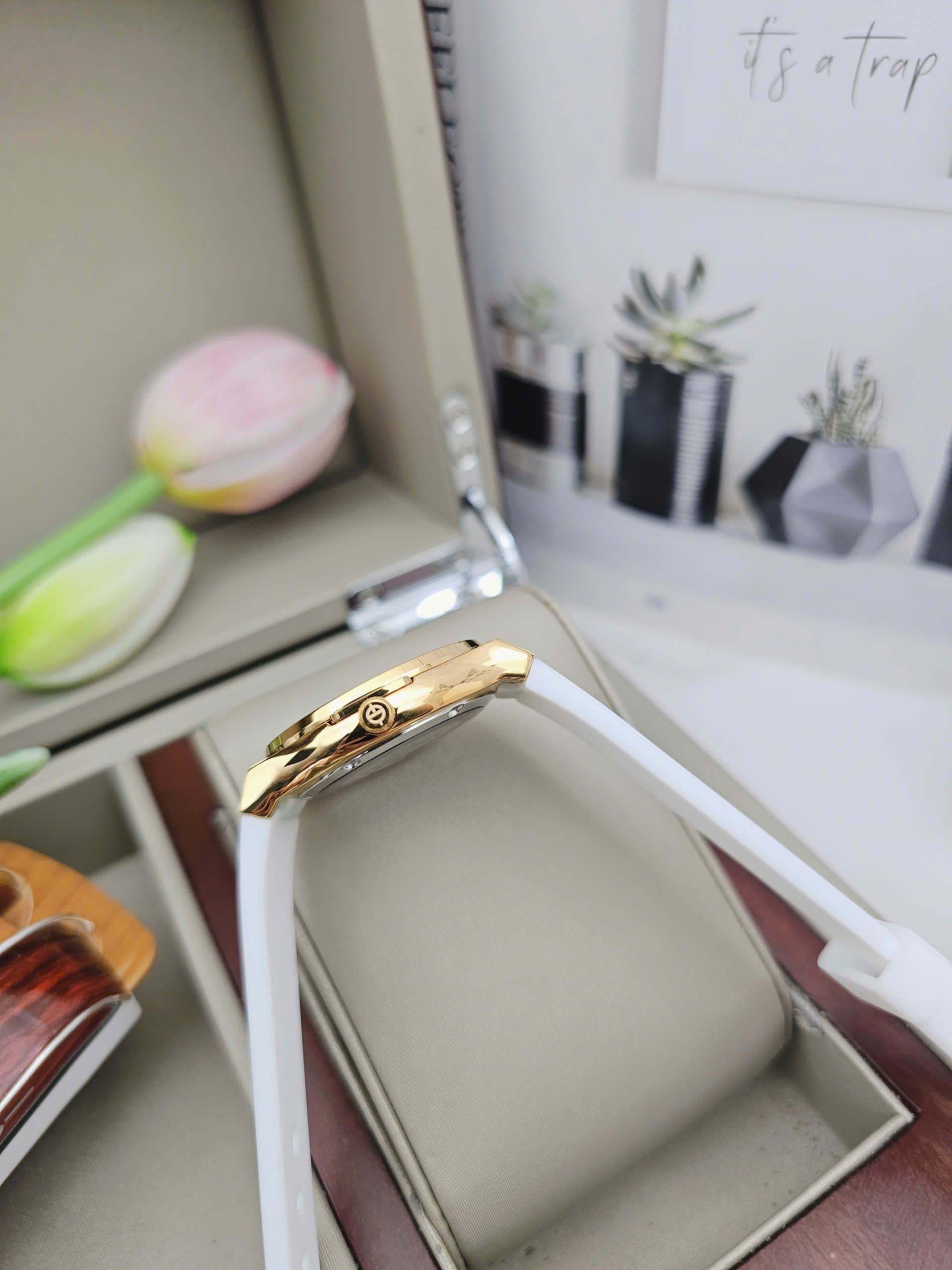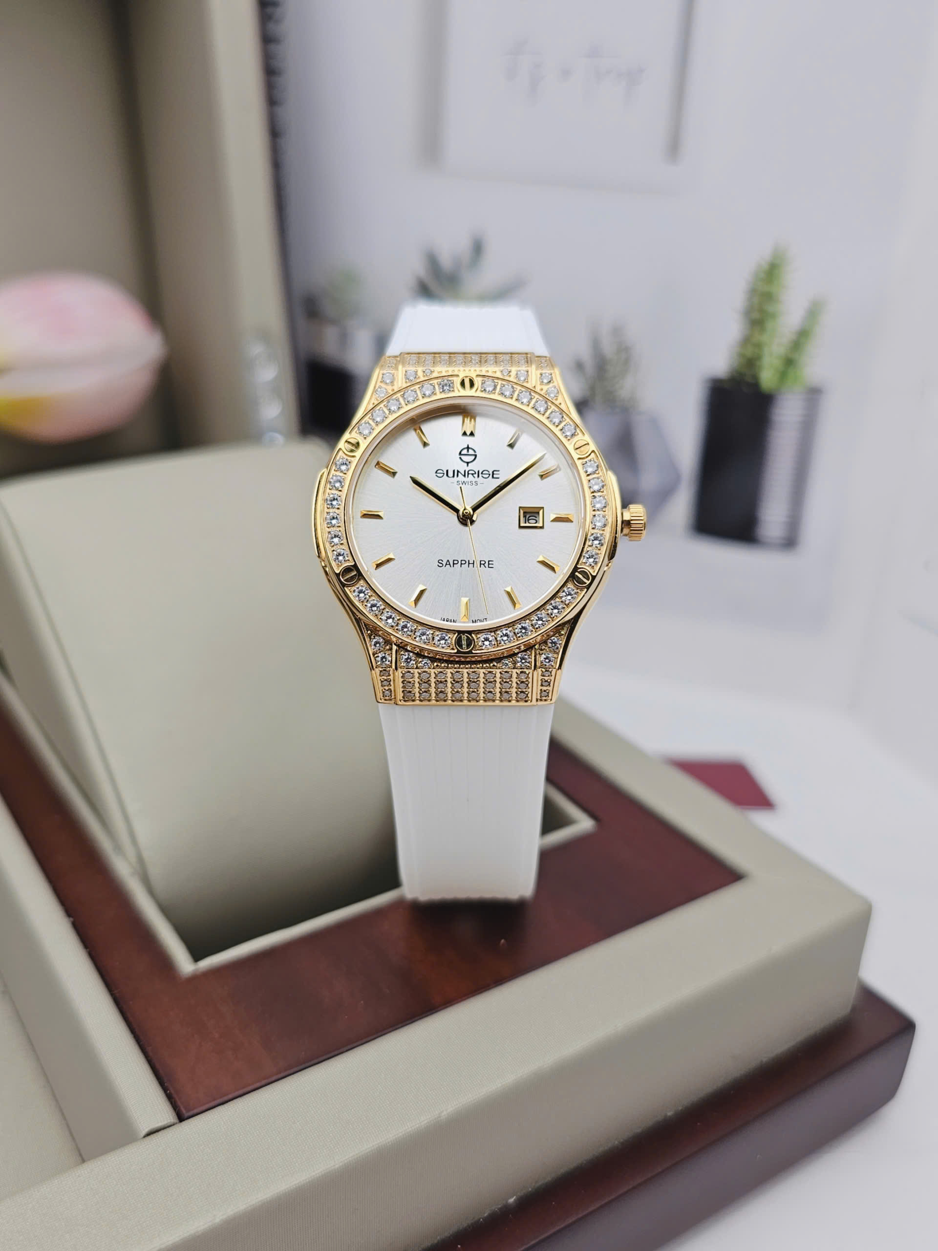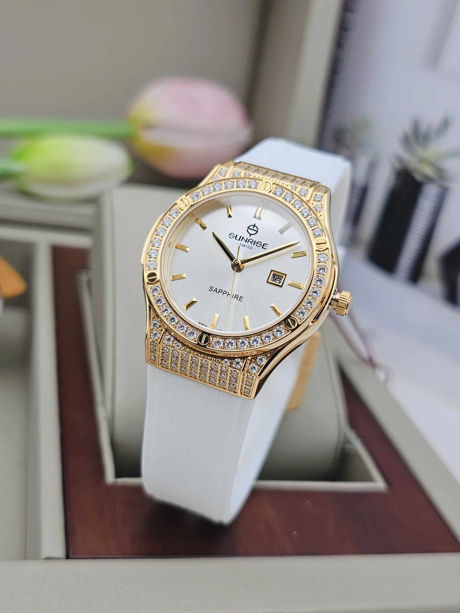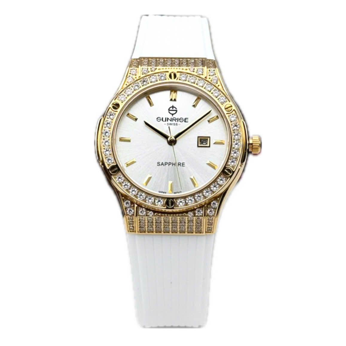 Dây silicone màu trắng mềm mại ôm trọn cổ tay, mang lại cảm giác thoải mái và nhẹ nhàng suốt cả ngày dài. Sự kết hợp giữa dây trắng tinh khôi, mặt số đồng điệu và viền vàng đính đá sang trọng giúp Sunrise 2310CA-VV-T dễ dàng hòa hợp với nhiều phong cách, từ trang phục công sở thanh lịch đến những buổi dạo phố dịu dàng. Dù được sản xuất tại Trung Quốc, chiếc đồng hồ vẫn thể hiện trọn vẹn tinh thần chất lượng và thẩm mỹ đặc trưng của thương hiệu Sunrise, trở thành điểm nhấn tinh tế cho vẻ đẹp của phái nữ.