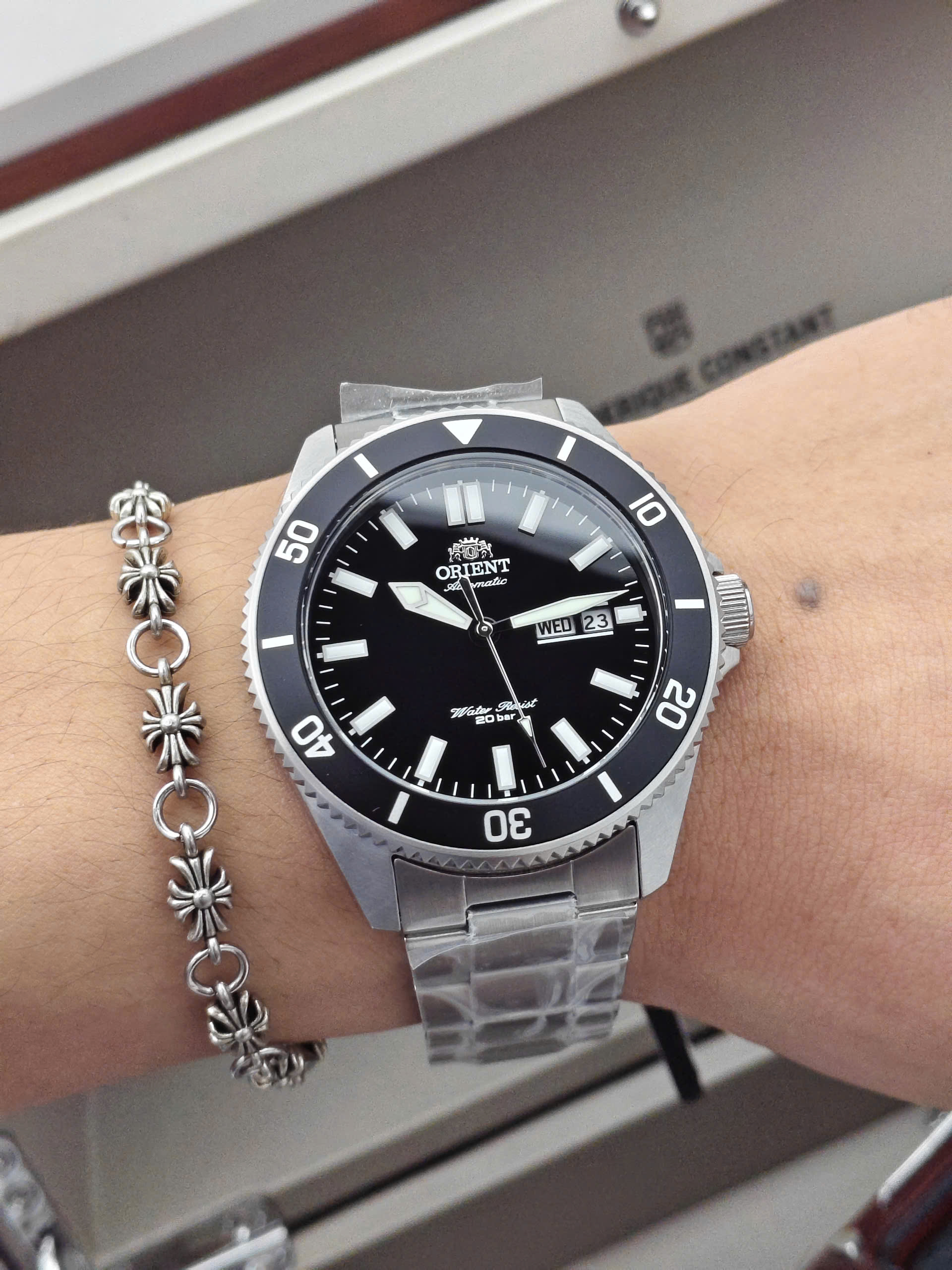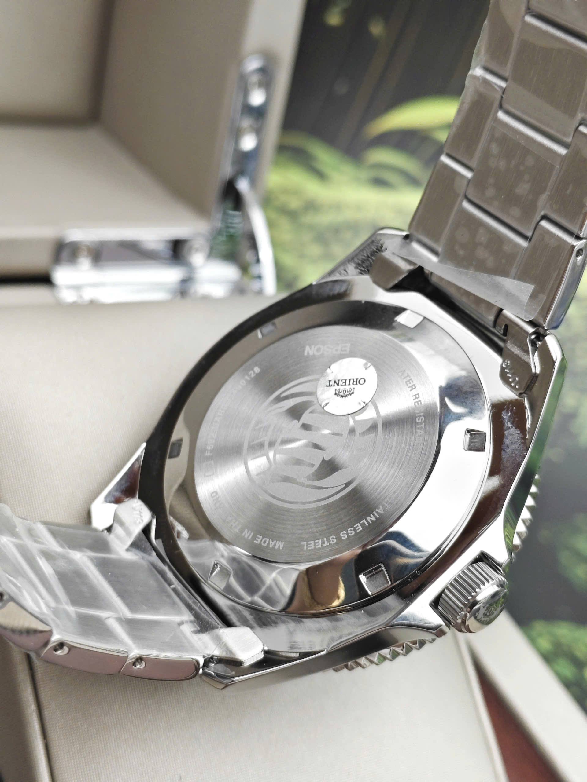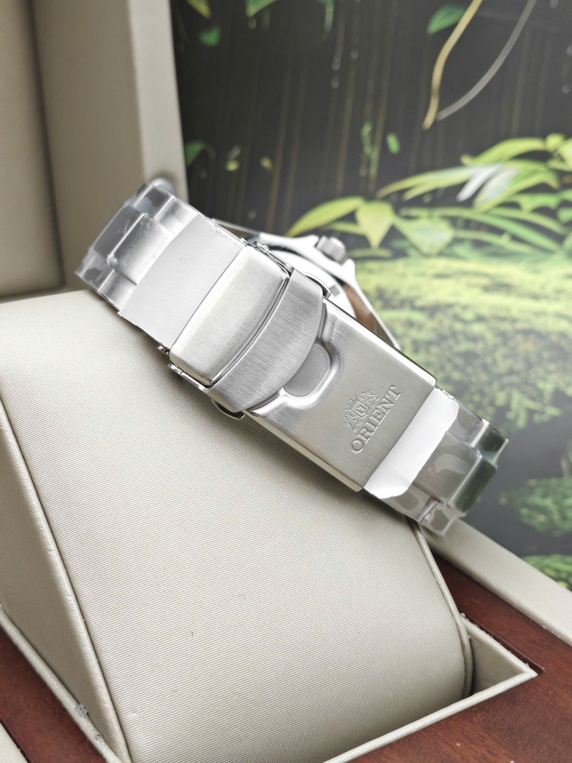 Sản phẩm sử dụng bộ máy Automatic (cơ tự động) do Orient sản xuất, nổi tiếng với độ bền cao và khả năng vận hành ổn định. Vỏ và dây đồng hồ đều được làm từ thép không gỉ 316L, mang lại độ chắc chắn, chống ăn mòn và giữ được vẻ sáng đẹp theo thời gian. Mặt kính cứng giúp hạn chế trầy xước trong quá trình sử dụng, đáp ứng tốt nhu cầu đeo thường xuyên của người dùng nam.