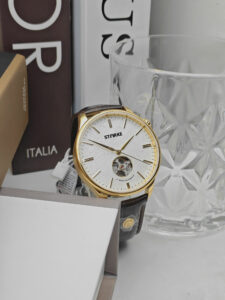 Đồng hồ Starke SK130BM-VV-T với thiết kế cổ điển nhưng không kém phần hiện đại khi hở tim ở hướng 6h tôn lên vẻ mạnh mẽ của phái nam. Mang ngoại hình phù hợp với các trang phục công sở, chiếc đồng hồ tôn lên vẻ sang trọng trong nét đơn giản.