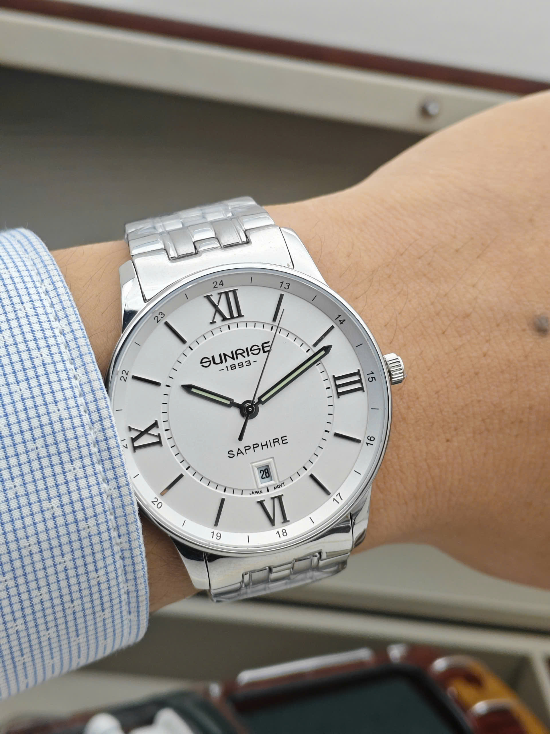 Mẫu đồng hồ nam Sunrise 1259SA-Silver được hoàn thiện từ vỏ và dây thép không gỉ chắc chắn, kết hợp mặt kính sapphire chống trầy xước hiệu quả, giúp đồng hồ luôn giữ được vẻ ngoài sáng bóng theo thời gian. Dù được sản xuất tại Trung Quốc, sản phẩm vẫn đáp ứng tiêu chuẩn chất lượng của thương hiệu Sunrise Thụy Sĩ. Đây là lựa chọn lý tưởng cho nam giới đang tìm kiếm một chiếc đồng hồ bền bỉ, dễ sử dụng và mang giá trị thẩm mỹ cao.