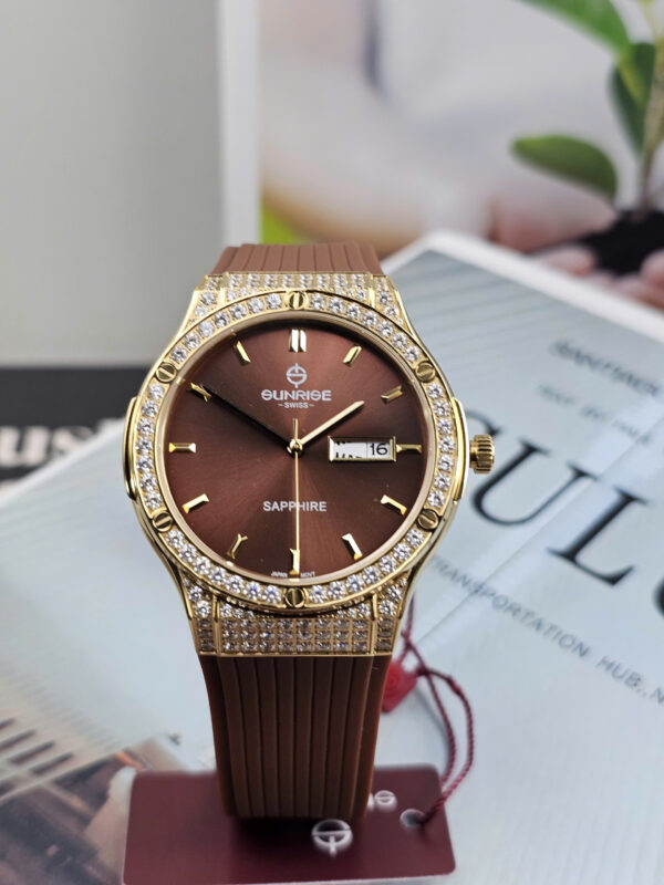 Đồng hồ nam Sunrise 1310CA-VV-N là sự kết hợp hài hòa giữa phong cách sang trọng và nét hiện đại đầy nam tính. Thuộc thương hiệu Sunrise đến từ Thụy Sĩ, mẫu đồng hồ này gây ấn tượng với vỏ thép không gỉ mạ vàng nổi bật, tôn lên vẻ đẳng cấp cho người đeo. Mặt số màu nâu được đính đá tinh tế, tạo điểm nhấn sang trọng nhưng không quá phô trương. Đường kính mặt 41mm vừa vặn, phù hợp với cổ tay nam giới, dễ dàng sử dụng trong nhiều hoàn cảnh khác nhau.