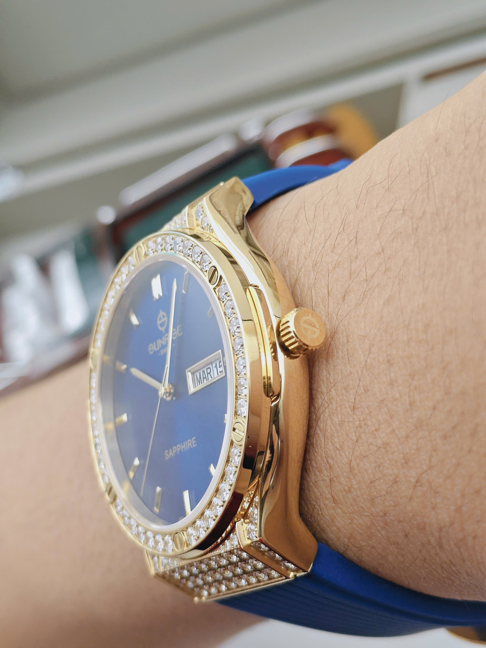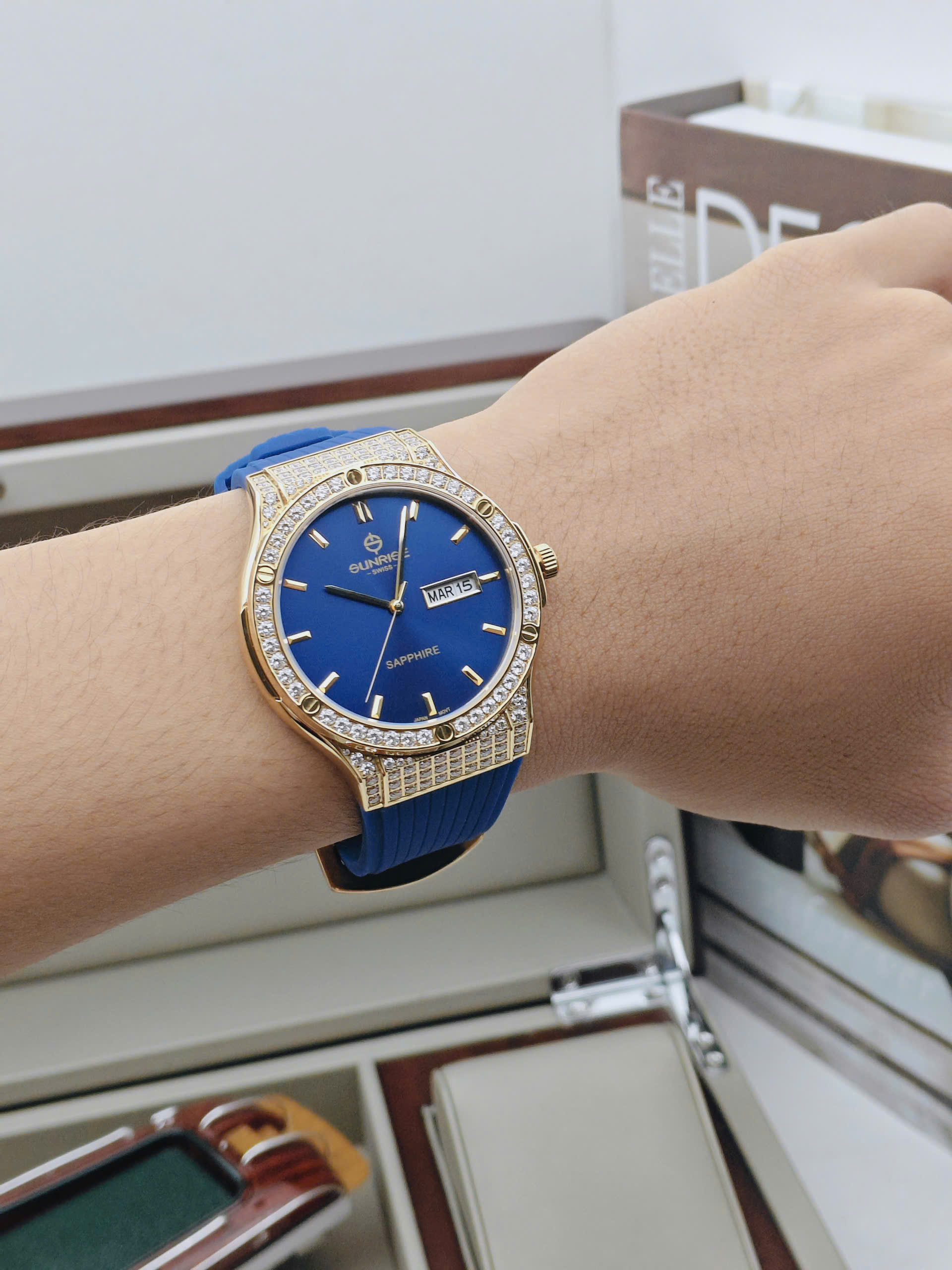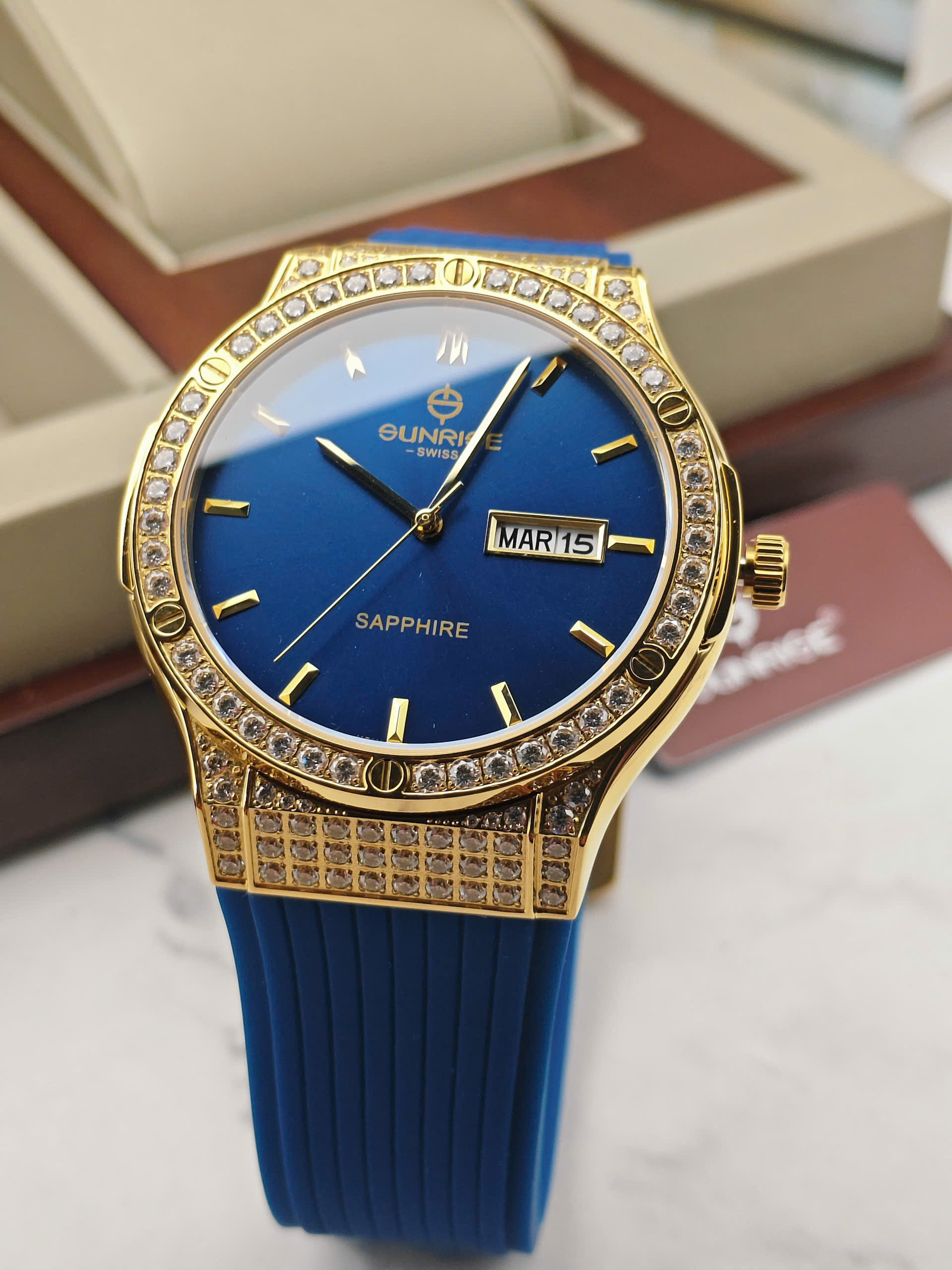 Đồng hồ nam Sunrise 1310CA-VV-X gây ấn tượng với thiết kế thời thượng, mang đậm tinh thần sang trọng đặc trưng của thương hiệu Sunrise đến từ Thụy Sĩ. Mẫu đồng hồ sở hữu vỏ thép không gỉ mạ vàng nổi bật, kết hợp cùng mặt số xanh biển sâu cuốn hút, tạo nên vẻ ngoài mạnh mẽ nhưng vẫn rất tinh tế. Phần viền được đính đá lấp lánh là điểm nhấn đắt giá, giúp tổng thể thiết kế trở nên nổi bật và thu hút ánh nhìn trong mọi hoàn cảnh.