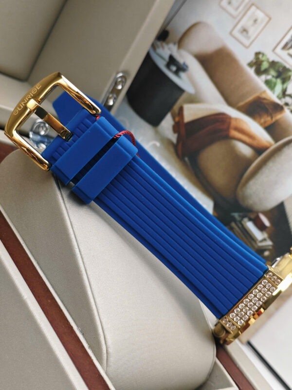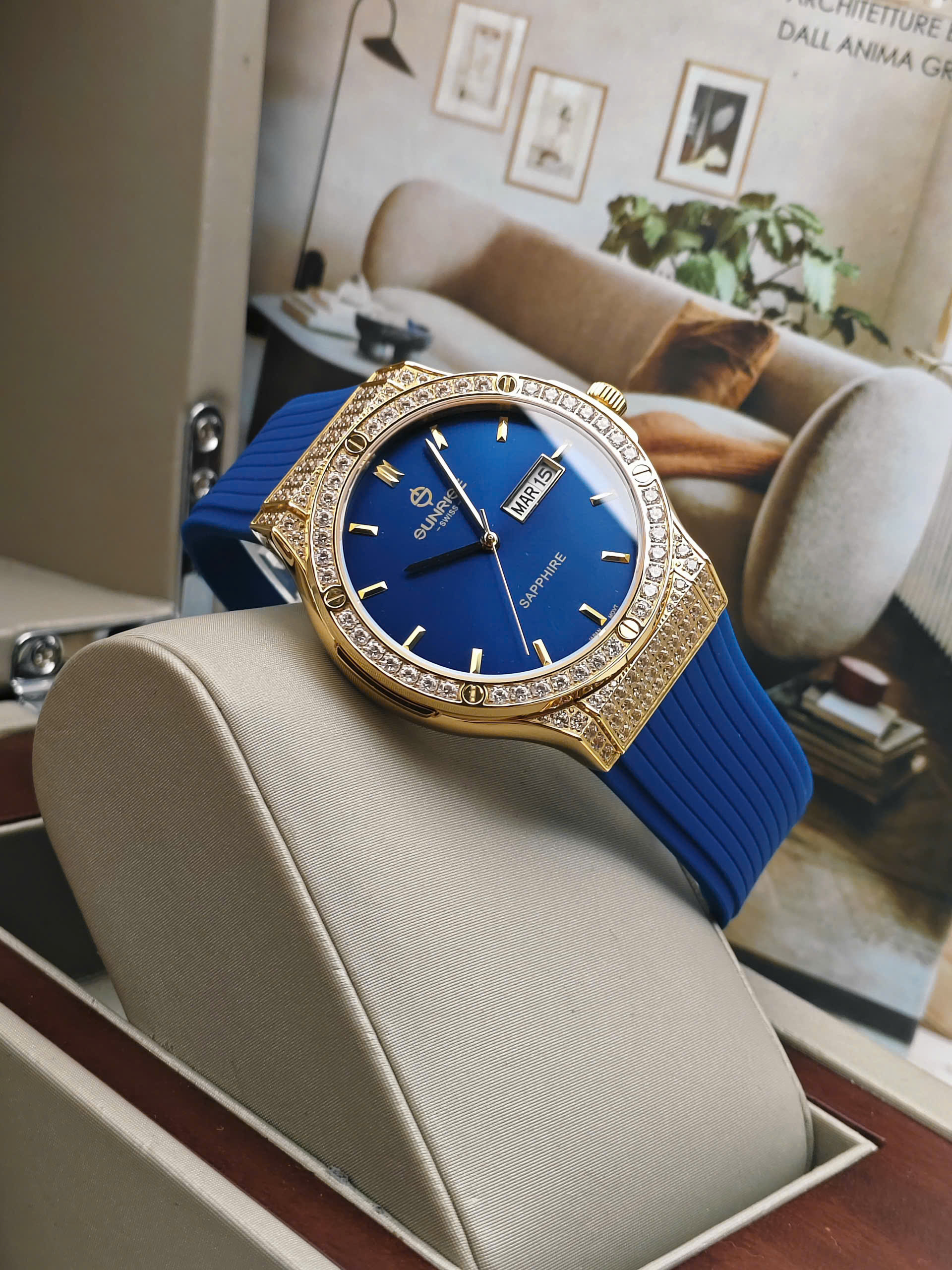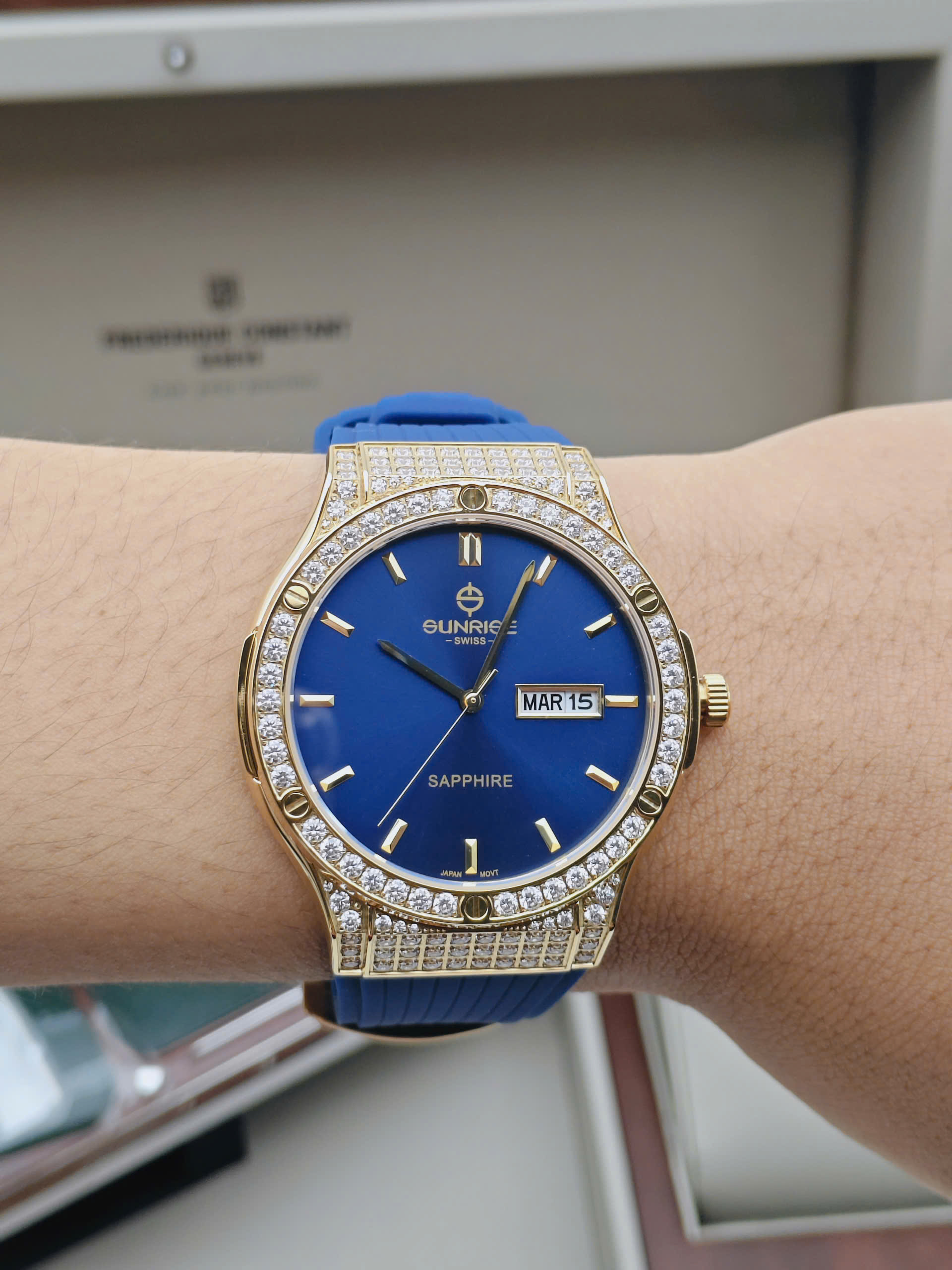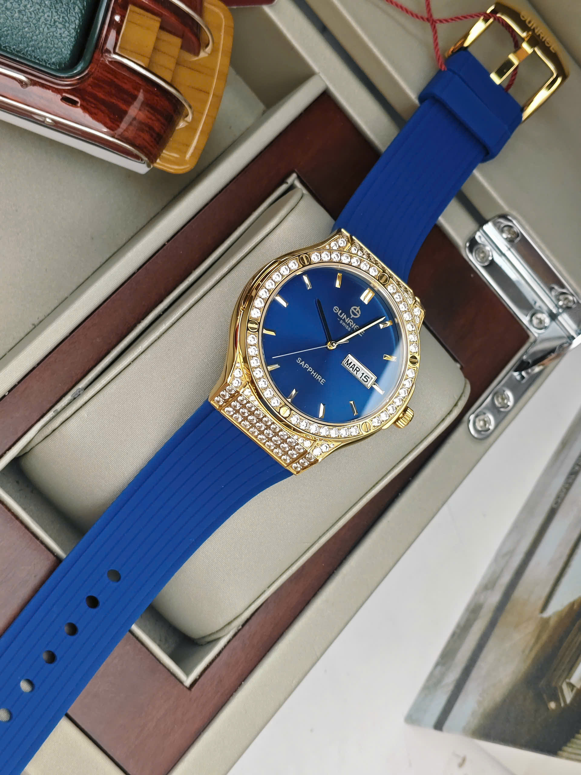 Đồng hồ nam Sunrise 1310CA-VV-X gây ấn tượng với thiết kế thời thượng, mang đậm tinh thần sang trọng đặc trưng của thương hiệu Sunrise đến từ Thụy Sĩ. Mẫu đồng hồ sở hữu vỏ thép không gỉ mạ vàng nổi bật, kết hợp cùng mặt số xanh biển sâu cuốn hút, tạo nên vẻ ngoài mạnh mẽ nhưng vẫn rất tinh tế. Phần viền được đính đá lấp lánh là điểm nhấn đắt giá, giúp tổng thể thiết kế trở nên nổi bật và thu hút ánh nhìn trong mọi hoàn cảnh.