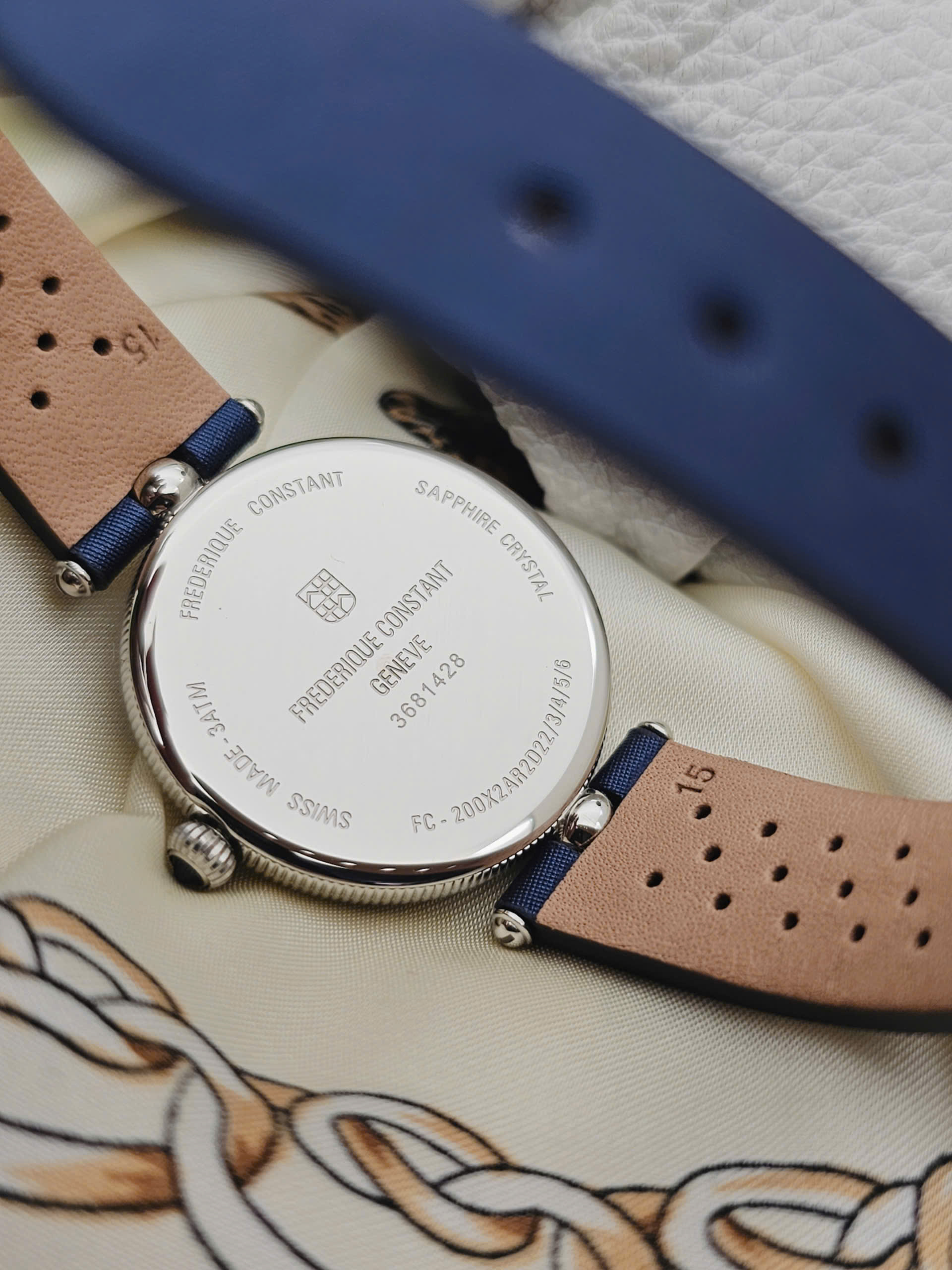 Mẫu FC-200MPN2AR2D6 sở hữu vỏ thép không gỉ màu bạc sang trọng, kết hợp viền đính 18 viên kim cương lấp lánh, tạo điểm nhấn đẳng cấp trên cổ tay. Mặt kính sapphire cao cấp có khả năng chống trầy xước tối ưu, bảo vệ hoàn hảo mặt số xanh tinh tế bên trong. Đồng hồ sử dụng bộ máy quartz Thụy Sỹ chính xác, vận hành bền bỉ với các chức năng giờ, phút, giây cơ bản. Độ chịu nước 3ATM phù hợp cho các hoạt động thường ngày như rửa tay hoặc đi mưa nhẹ.