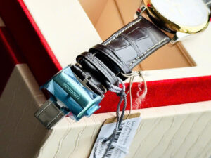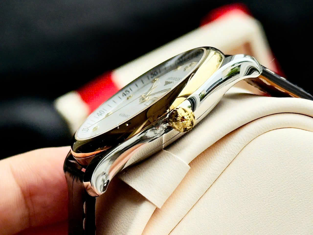 Chất liệu cao cấp và sự hoàn thiện tỉ mỉ Mẫu đồng hồ này sở hữu mặt kính Sapphire nguyên khối có khả năng chống trầy xước tuyệt vời, giúp bảo vệ tối đa vẻ đẹp trong trẻo của mặt số theo thời gian. Sự kết hợp giữa dây da cao cấp màu nâu lịch lãm và lớp vỏ demi vàng 18K tạo nên một cảm giác vừa đầm tay, vừa êm ái khi sử dụng. Với kích thước mặt 38.5mm lý tưởng, đồng hồ dễ dàng ôm sát cổ tay của đại đa số nam giới, đặc biệt phù hợp khi diện cùng những bộ suit chỉnh chu trong các buổi họp quan trọng hay sự kiện cao cấp.