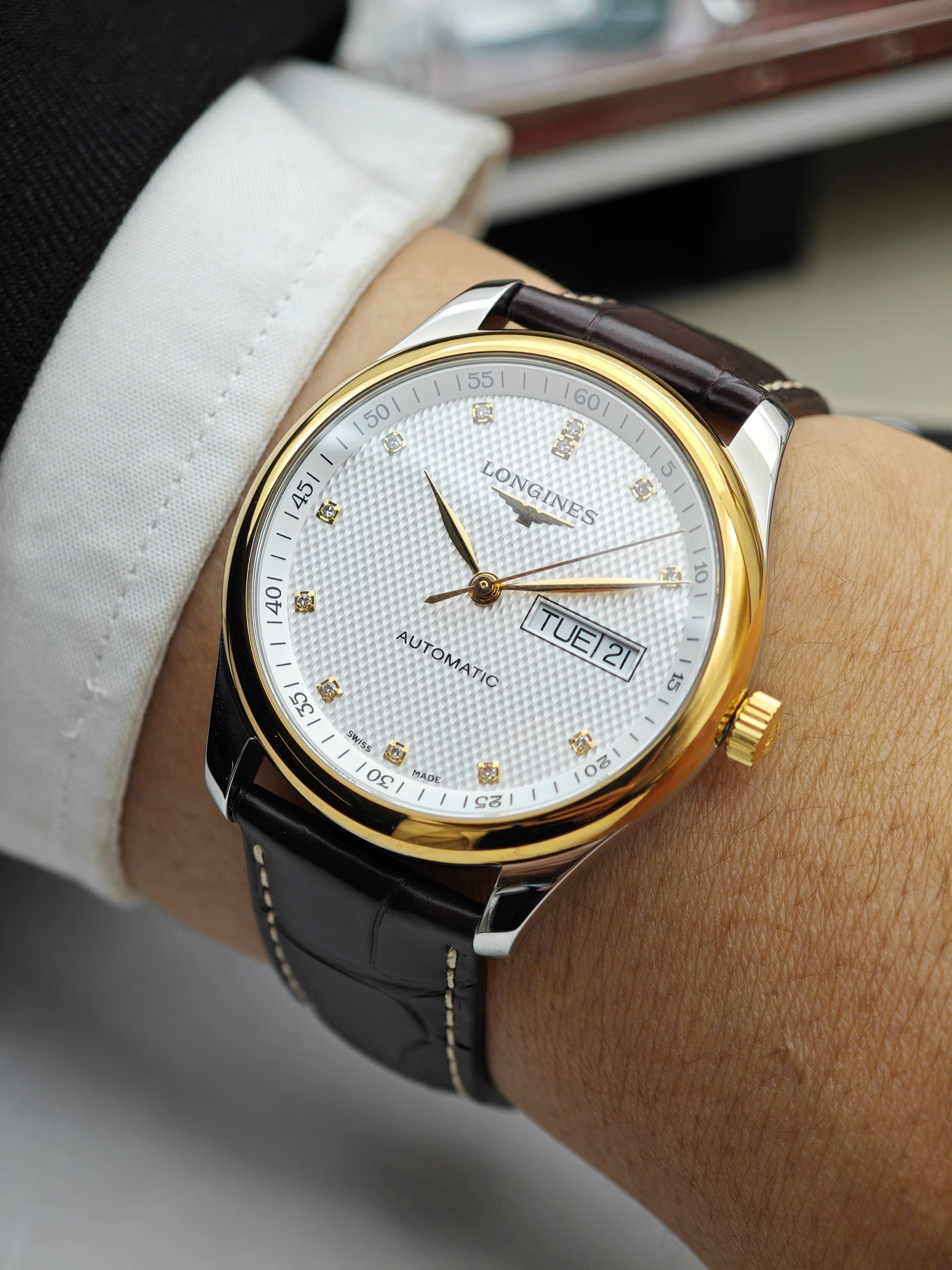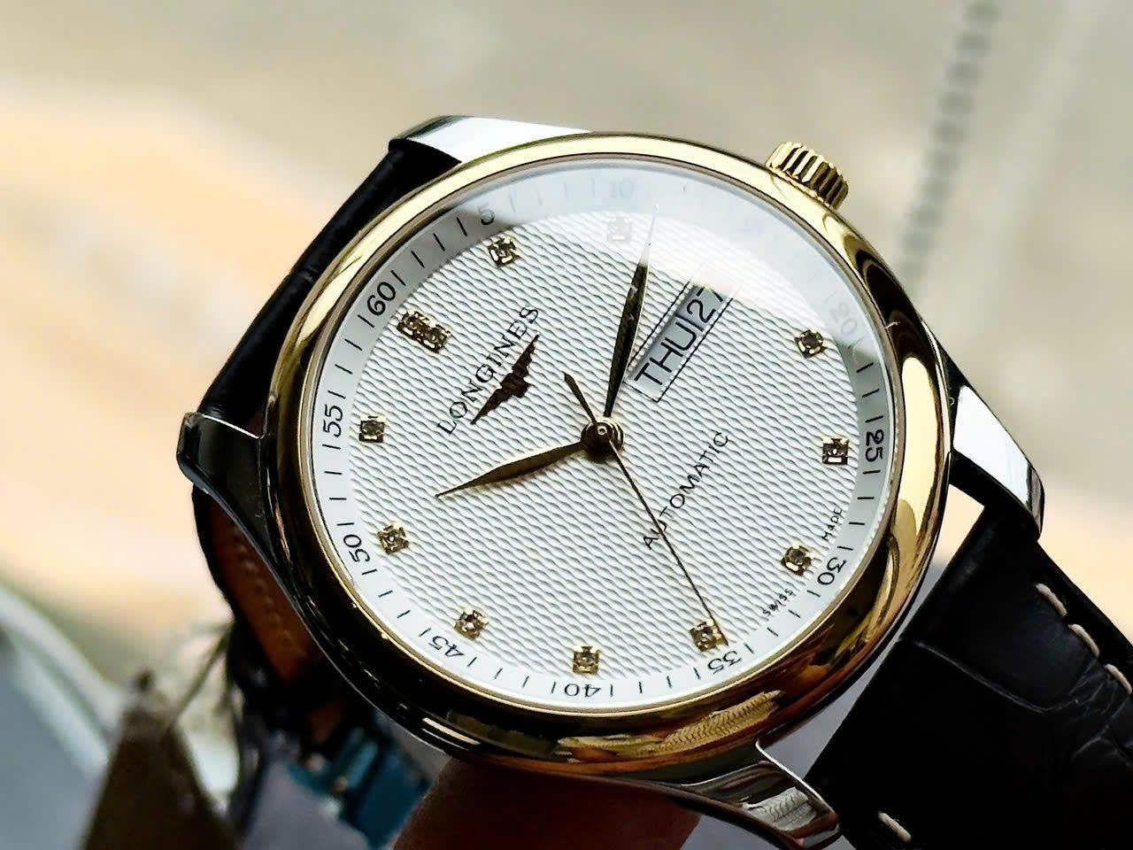 Thiết kế sang trọng và đẳng cấp vượt thời gian Longines Master Collection L2.755.5.77.3 là biểu tượng của sự chuẩn mực và thanh lịch trong thế giới đồng hồ Thụy Sĩ. Điểm nhấn đắt giá nhất nằm ở vành bezel được chế tác từ vàng đúc 18K, kết hợp hài hòa với vỏ thép không gỉ 316L demi đầy tinh tế. Mặt số trắng trang nhã được trang trí bằng các hoa văn dập nổi Guilloche sắc sảo, làm nền cho 12 viên kim cương tự nhiên lấp lánh thay thế cho các cọc số thông thường. Đây là một thiết kế hoàn hảo dành cho những quý ông theo đuổi phong cách cổ điển, sang trọng nhưng vẫn mang hơi thở hiện đại.