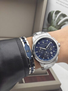 Về mặt thẩm mỹ, R8851121016 gây ấn tượng mạnh với mặt số Chronograph màu xanh dương (Blue Dial) sâu thẳm, được đặt gọn trong vỏ thép không gỉ có đường kính 44mm, một kích thước lý tưởng làm nổi bật cổ tay nam giới. Thiết kế mặt số sắc nét với ba mặt phụ (sub-dials) chức năng (60 giây, 60 phút và 24 giờ) cùng với thang đo Tachymeter bao quanh viền ngoài, nhấn mạnh tính năng bấm giờ chuyên nghiệp. Các kim và vạch chỉ giờ được phủ dạ quang, đảm bảo khả năng đọc giờ rõ ràng ngay cả trong điều kiện thiếu sáng, kết hợp cùng dây đeo kim loại (bracelet) bằng thép không gỉ màu bạc, tạo nên vẻ ngoài mạnh mẽ, bền bỉ và dễ dàng phối hợp với nhiều phong cách thời trang.