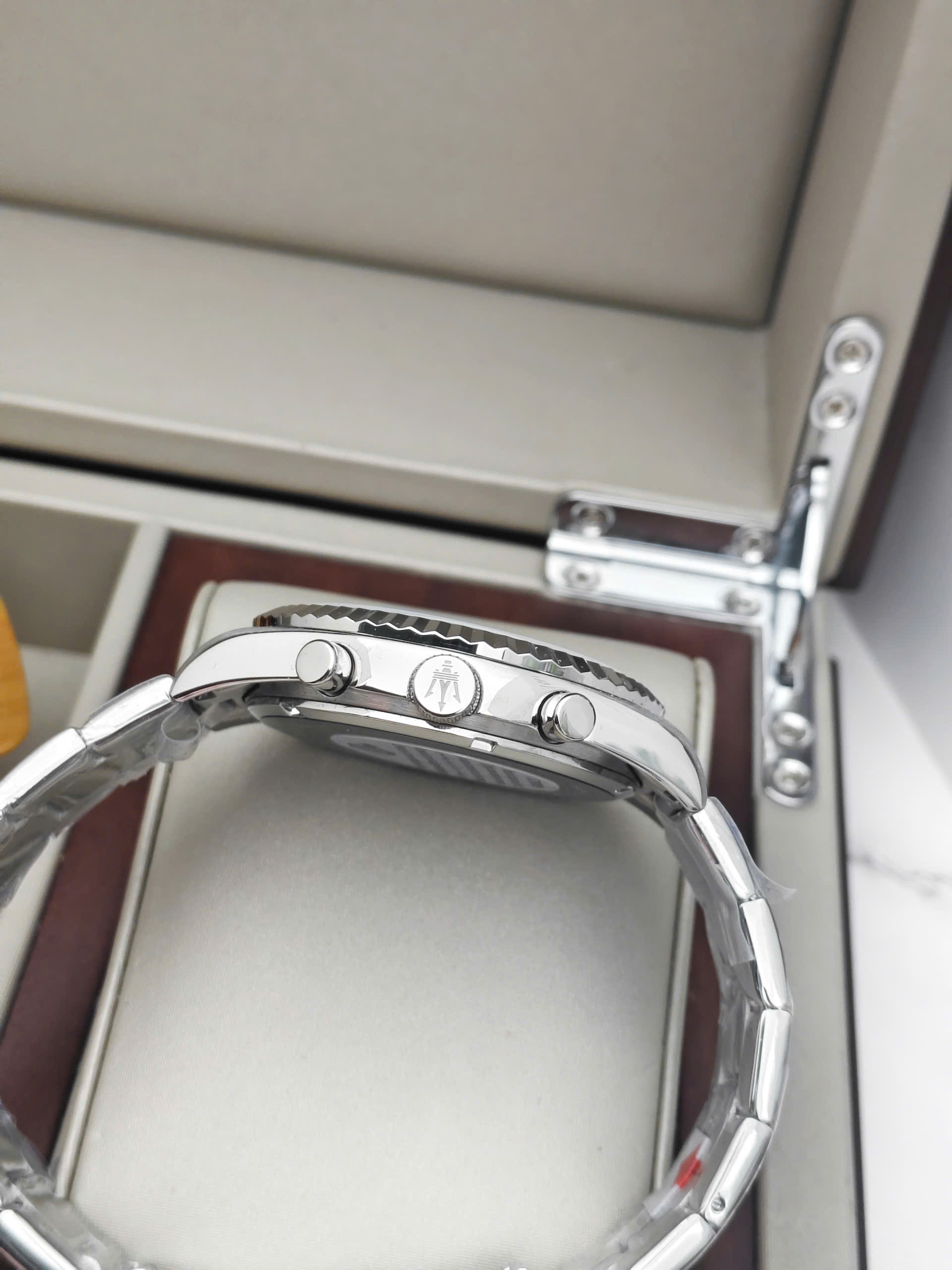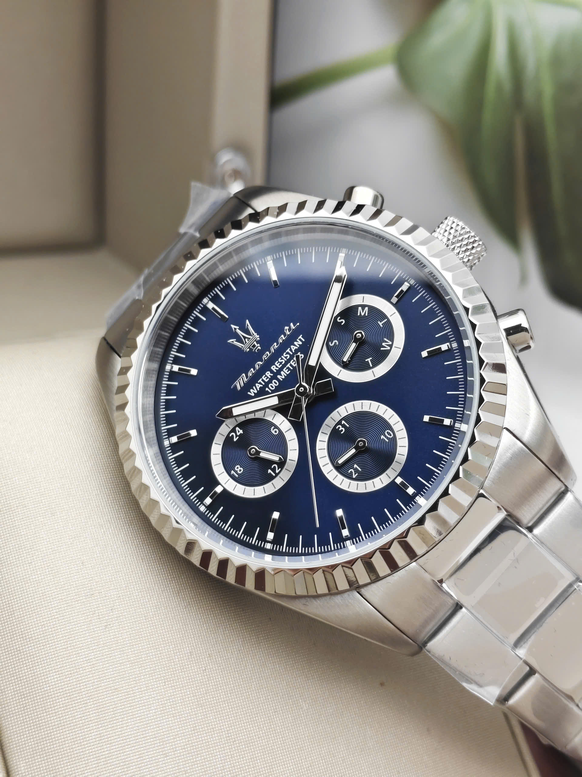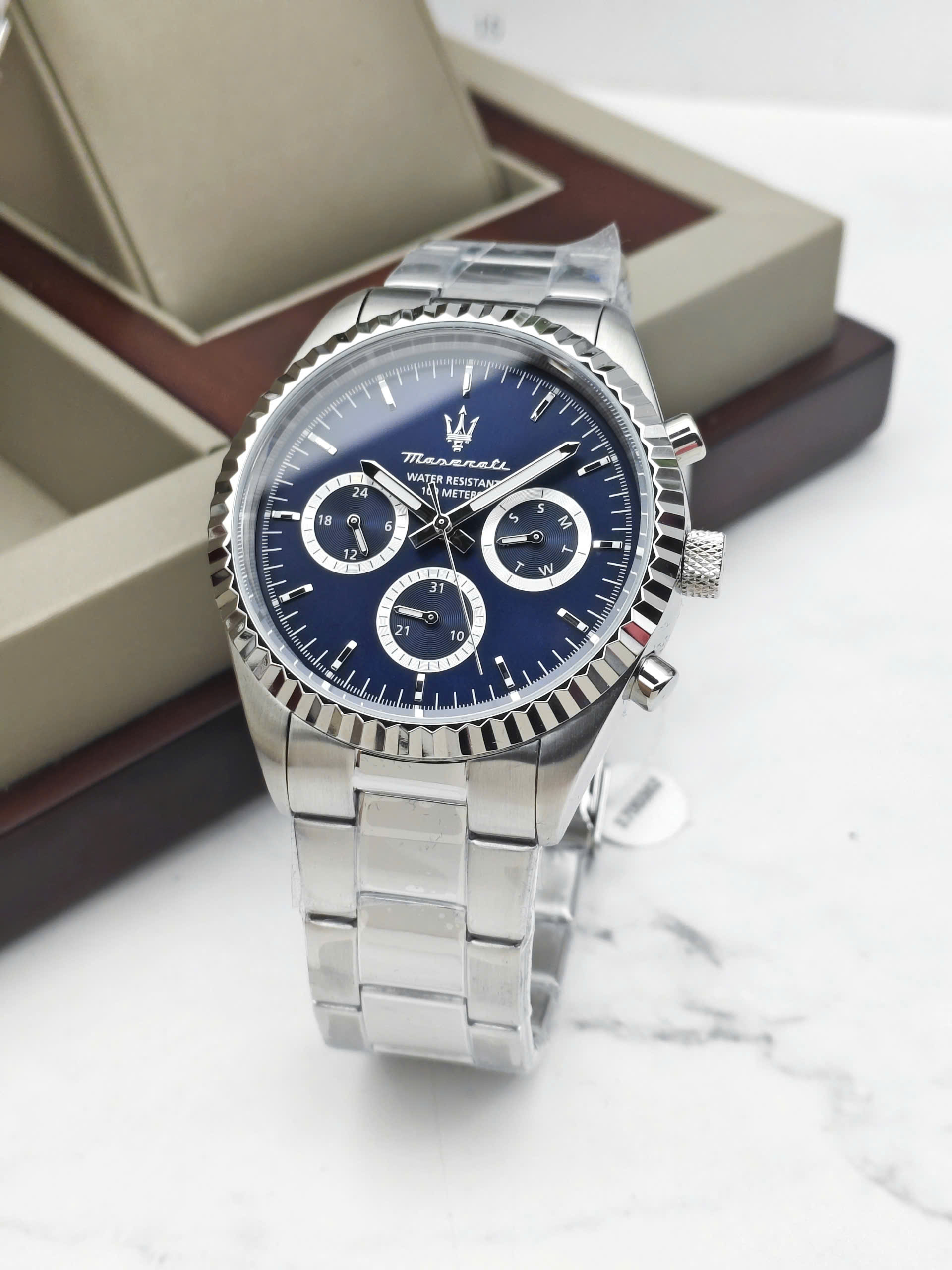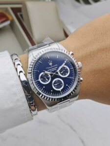 Maserati Compizione R8853100047 là mẫu đồng hồ nam mạnh mẽ thuộc bộ sưu tập Thu/Đông 2025, lấy cảm hứng từ tinh thần tốc độ và thi đấu của thương hiệu Maserati. Mặt số xanh đậm kết hợp bộ kim màu bạc mang lại cảm giác thể thao nhưng vẫn rất sang trọng. Thiết kế hiển thị tương tự cổ điển giúp tổng thể trở nên dễ nhìn, nam tính và phù hợp với những quý ông yêu thích phong cách năng động, hiện đại.