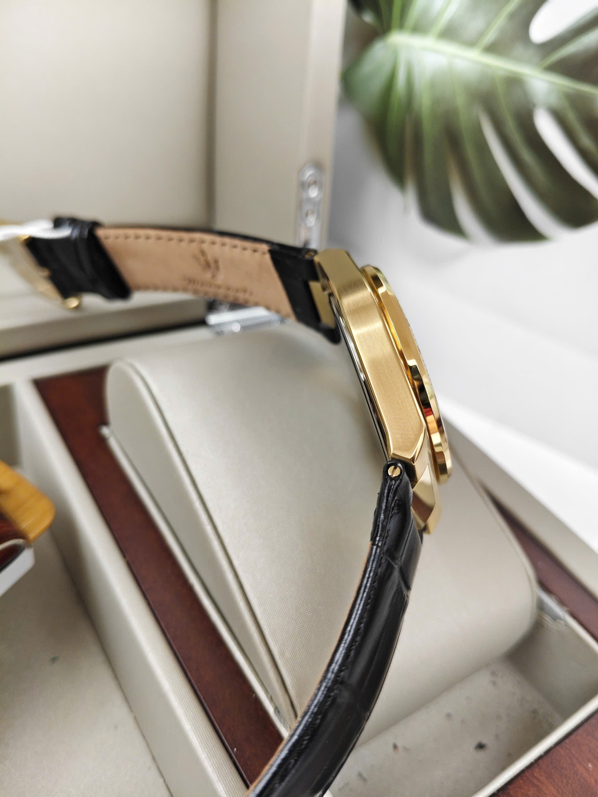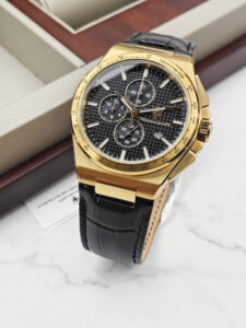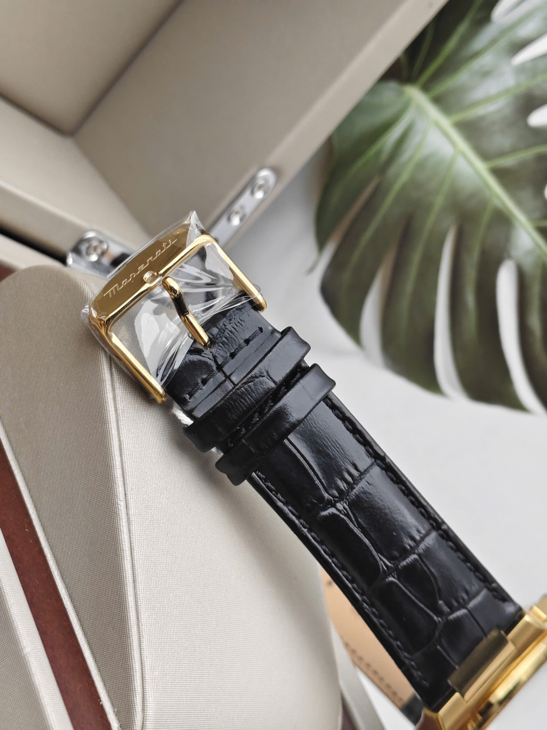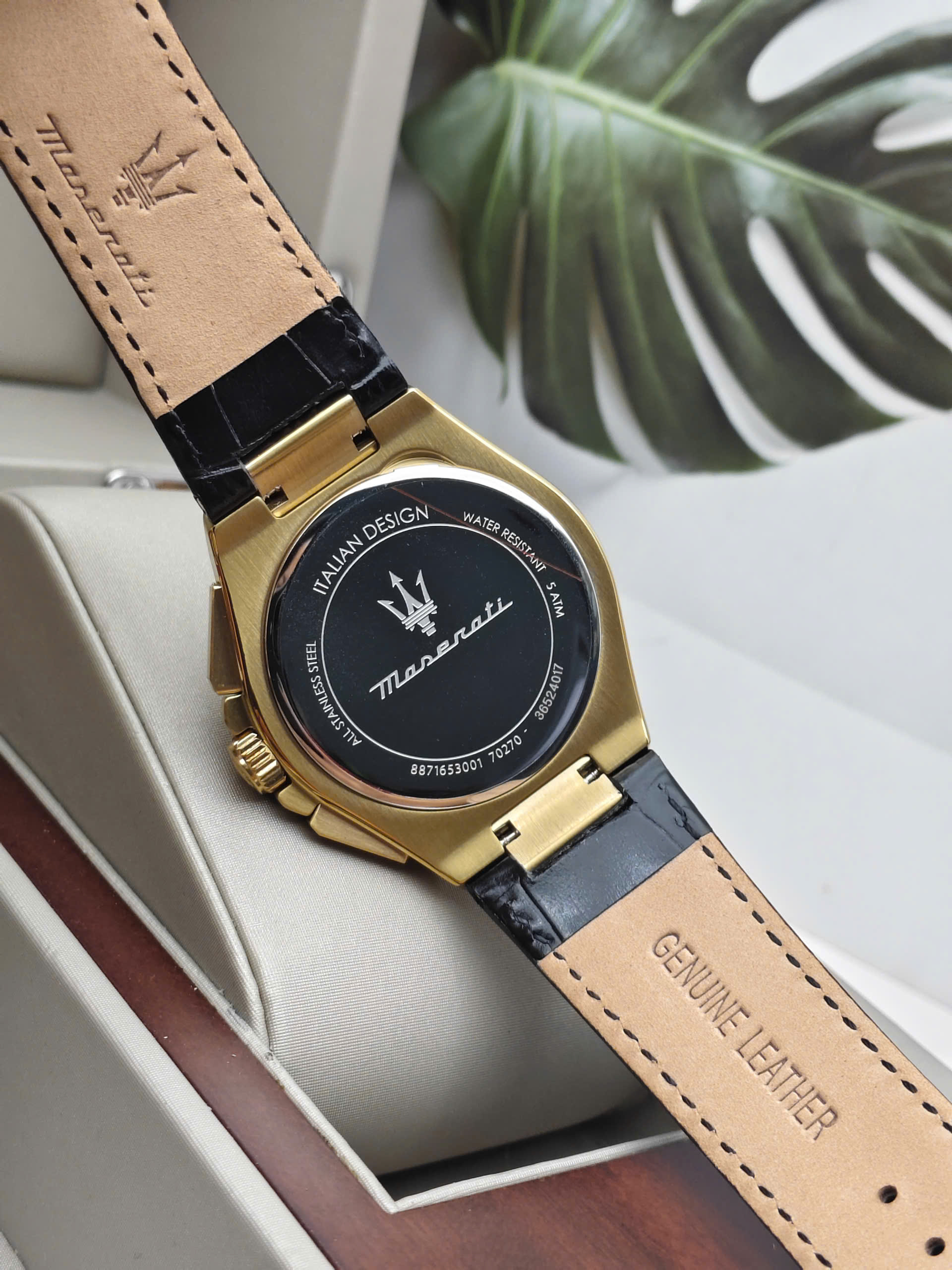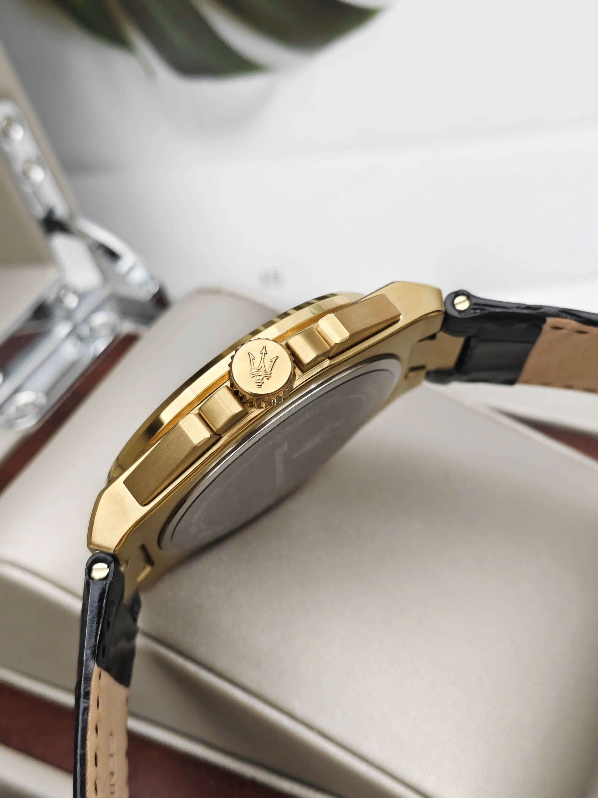 Maserati Velocità Slim R8871653001 là một mẫu đồng hồ thể thao (Chronograph) dành cho nam giới với vẻ ngoài vừa sang trọng vừa mạnh mẽ. Điểm nhấn của thiết kế là sự kết hợp giữa vỏ thép không gỉ mạ vàng (Gold) rực rỡ và mặt số màu đen huyền bí. Kim và các cọc số cũng được mạ vàng nổi bật trên nền đen, tạo nên độ tương phản cao và vẻ đẹp đẳng cấp. Dây đeo bằng da thật màu đen (Leather) với đường chỉ khâu cùng màu giúp tôn thêm vẻ thanh lịch và ôm sát cổ tay người đeo.