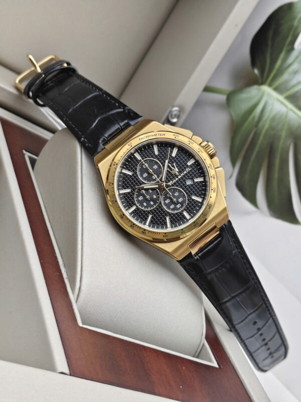 Maserati Velocità Slim R8871653001 là một mẫu đồng hồ thể thao (Chronograph) dành cho nam giới với vẻ ngoài vừa sang trọng vừa mạnh mẽ. Điểm nhấn của thiết kế là sự kết hợp giữa vỏ thép không gỉ mạ vàng (Gold) rực rỡ và mặt số màu đen huyền bí. Kim và các cọc số cũng được mạ vàng nổi bật trên nền đen, tạo nên độ tương phản cao và vẻ đẹp đẳng cấp. Dây đeo bằng da thật màu đen (Leather) với đường chỉ khâu cùng màu giúp tôn thêm vẻ thanh lịch và ôm sát cổ tay người đeo.