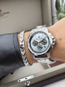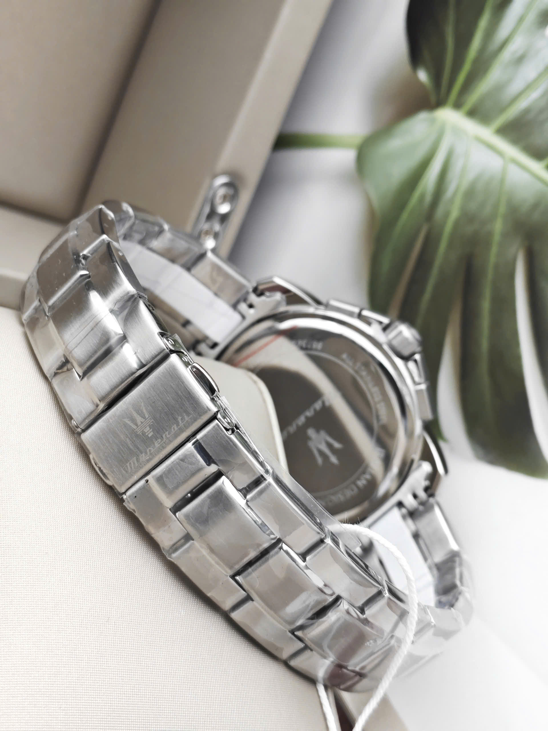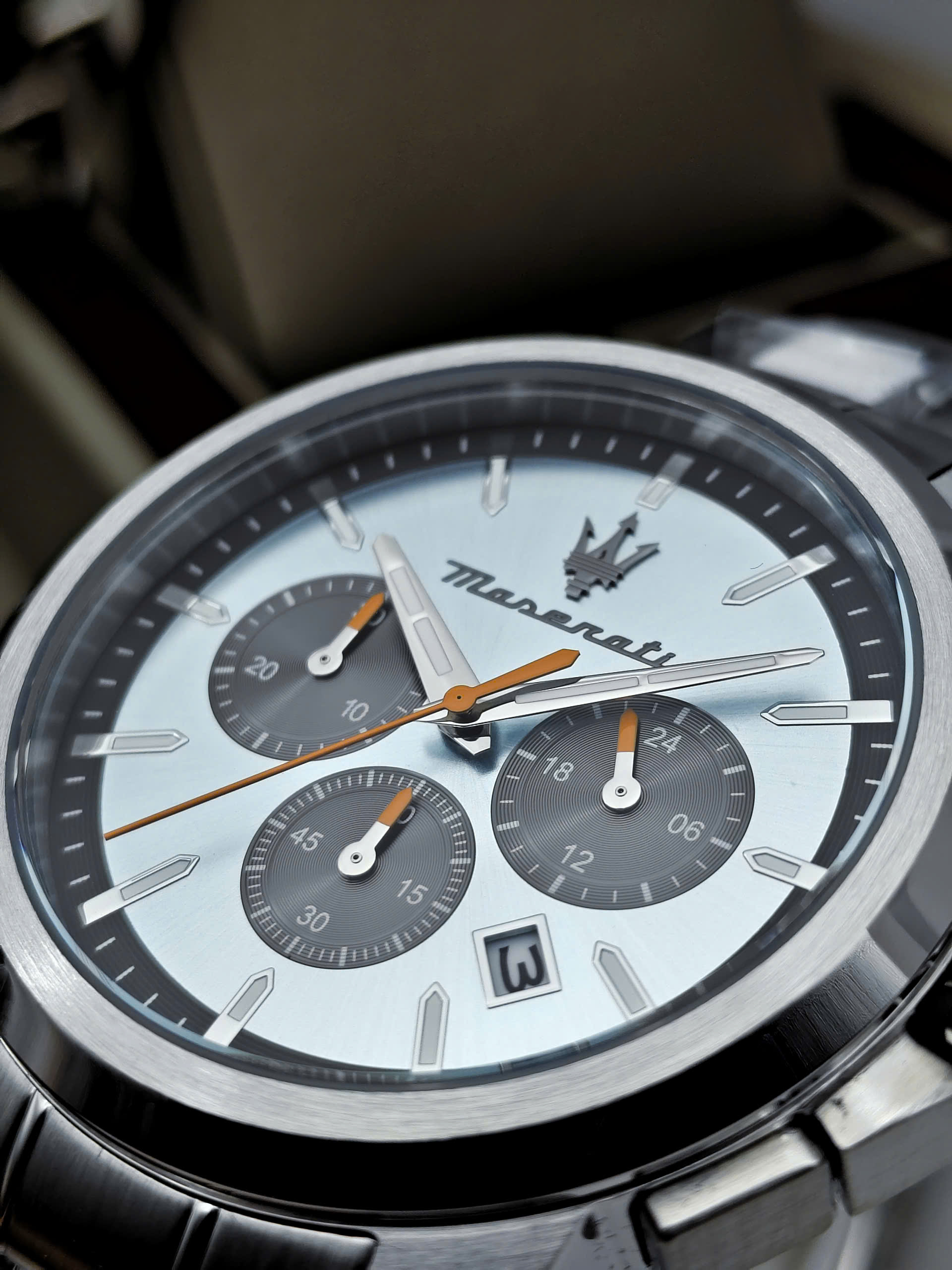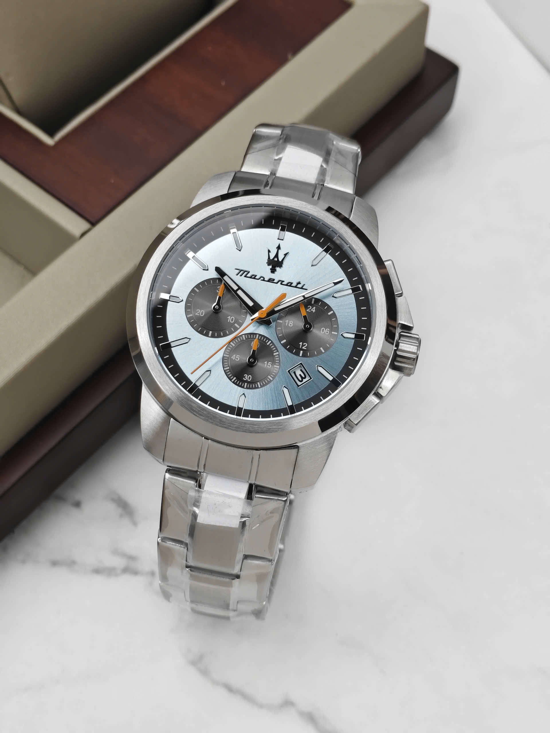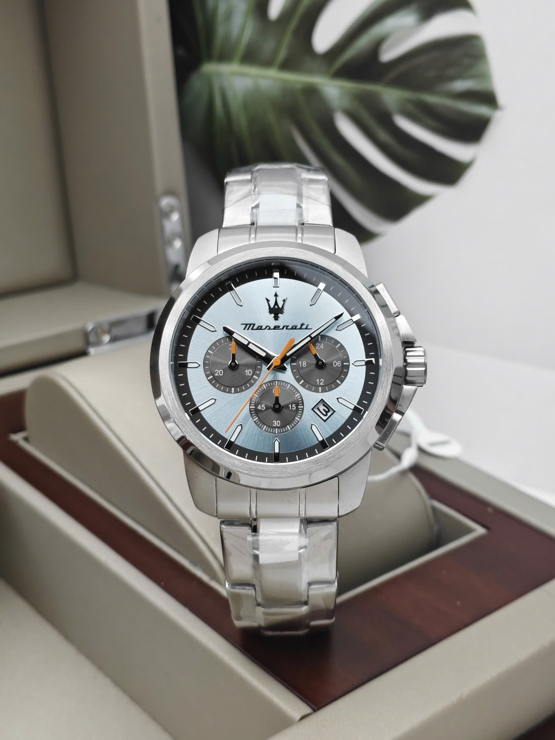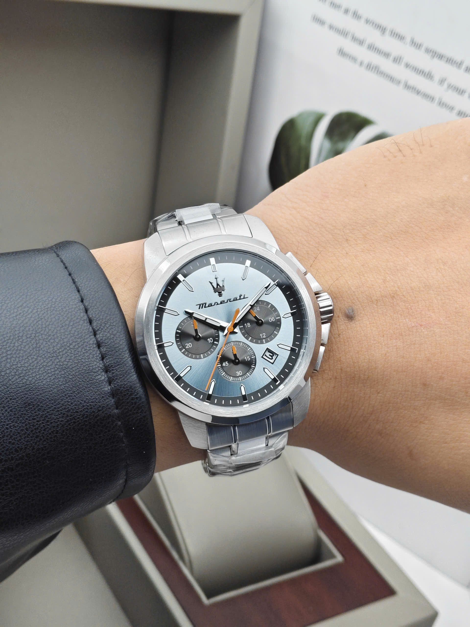 Maserati Successo R8873621045 là mẫu đồng hồ Chronograph (bấm giờ thể thao) dành cho nam giới, kết hợp hoàn hảo giữa phong cách năng động và vẻ đẹp sang trọng. Vỏ và dây đeo đều được làm từ thép không gỉ màu bạc sáng bóng, tạo cảm giác chắc chắn và cao cấp. Điểm nhấn đặc biệt của chiếc đồng hồ này là mặt số màu xanh nhạt (Light Blue) tươi mới, kết hợp với các kim chỉ giờ màu bạc và kim giây màu cam nổi bật, mang lại vẻ ngoài trẻ trung và cuốn hút.