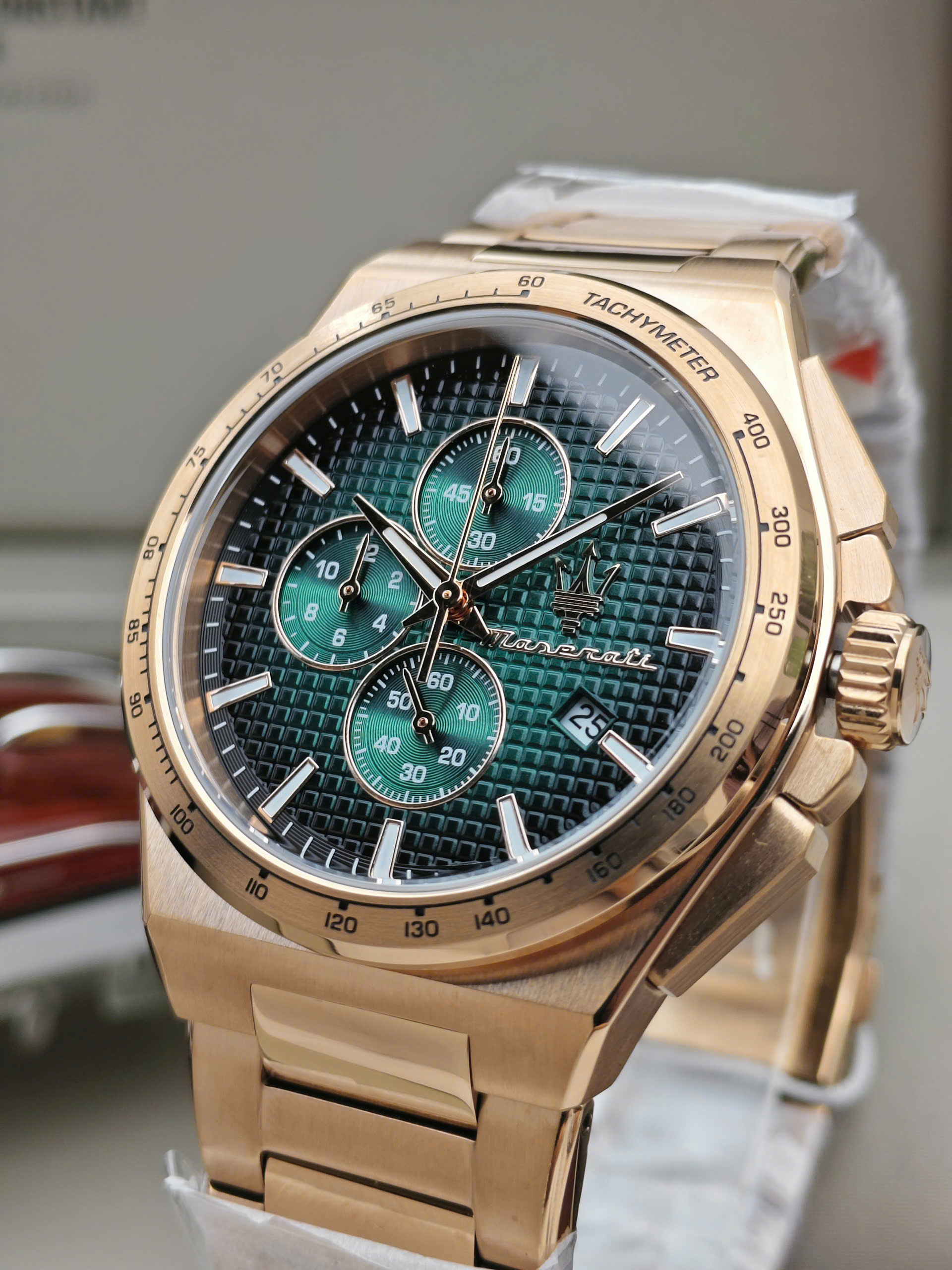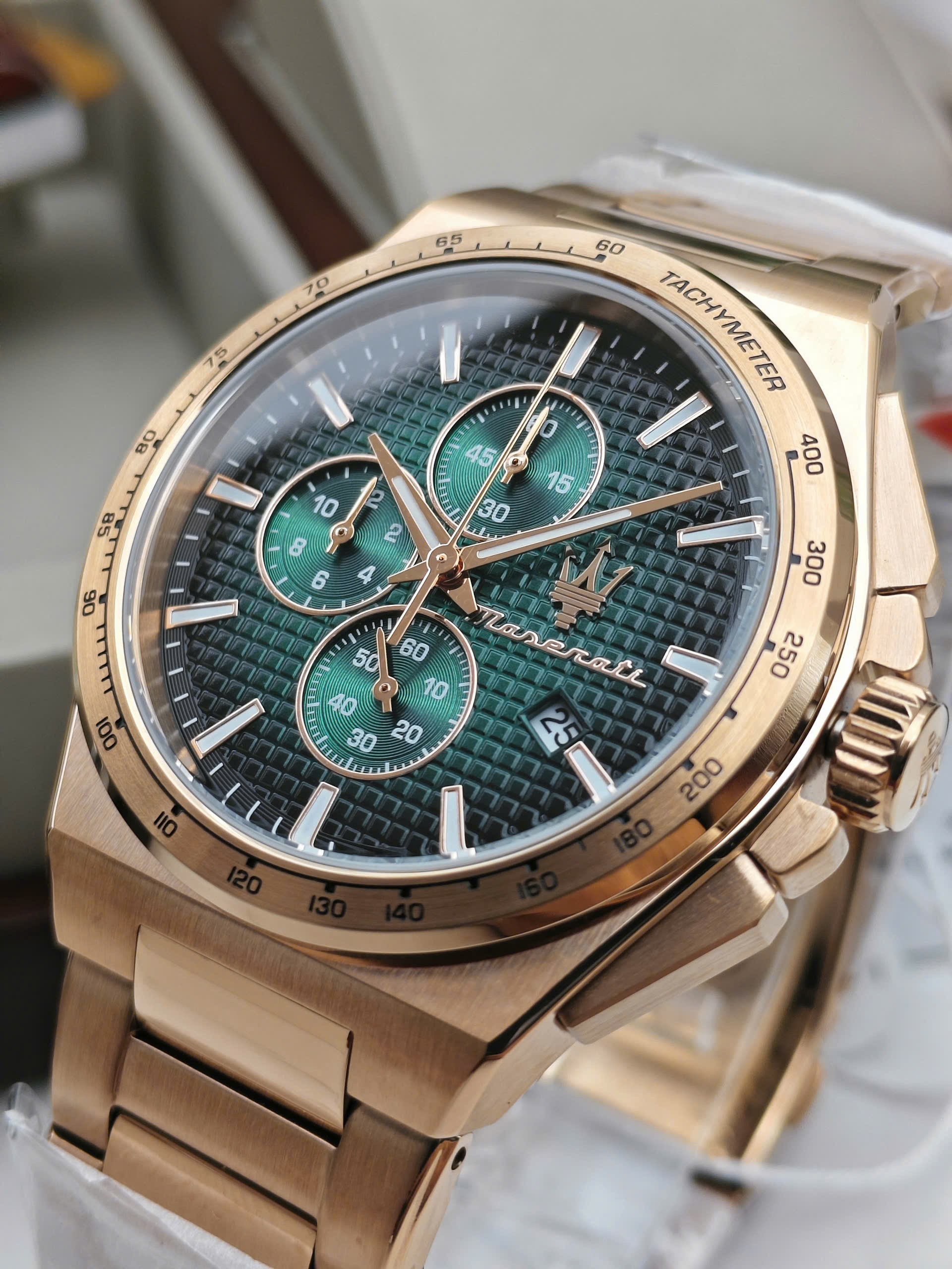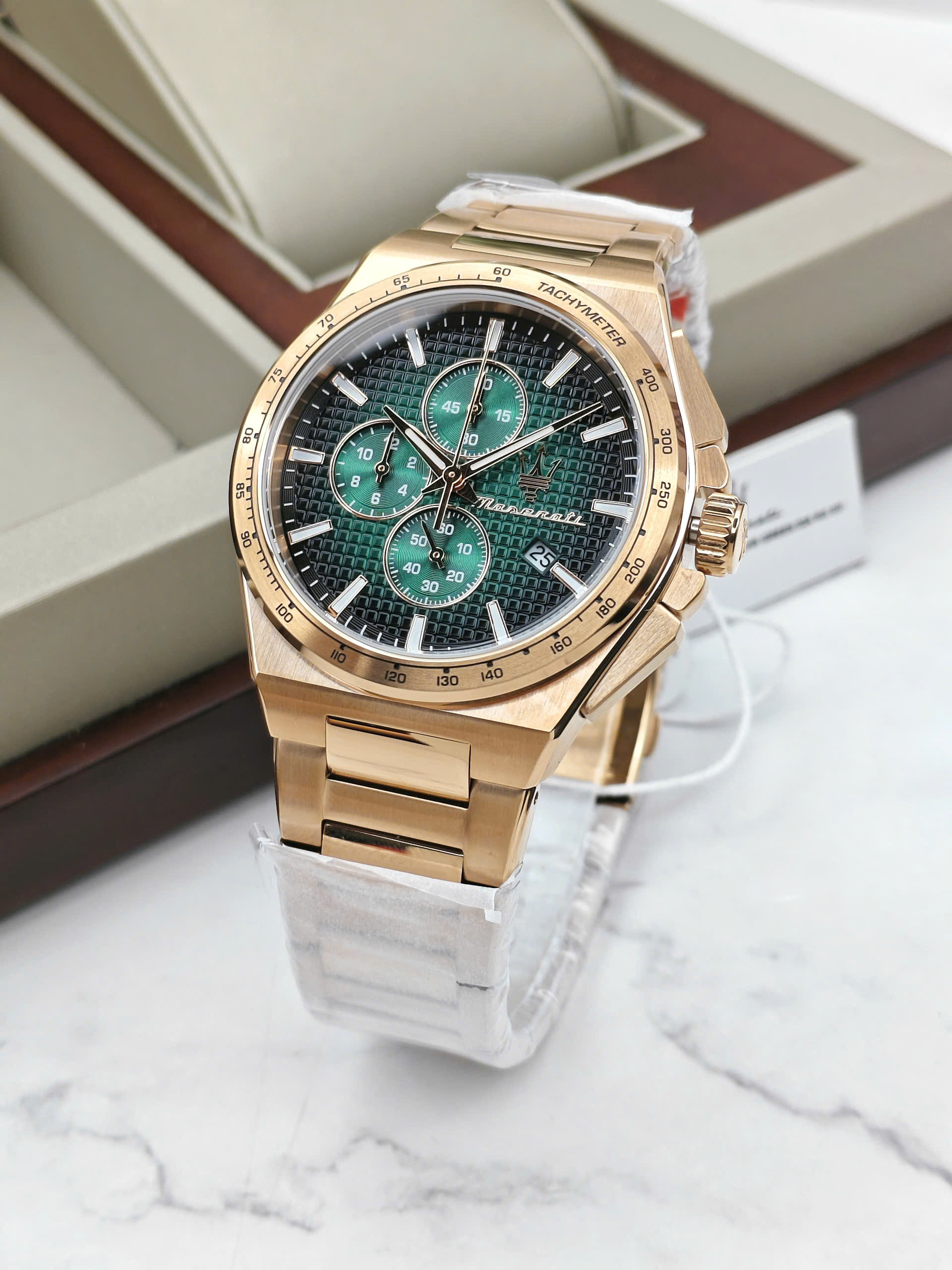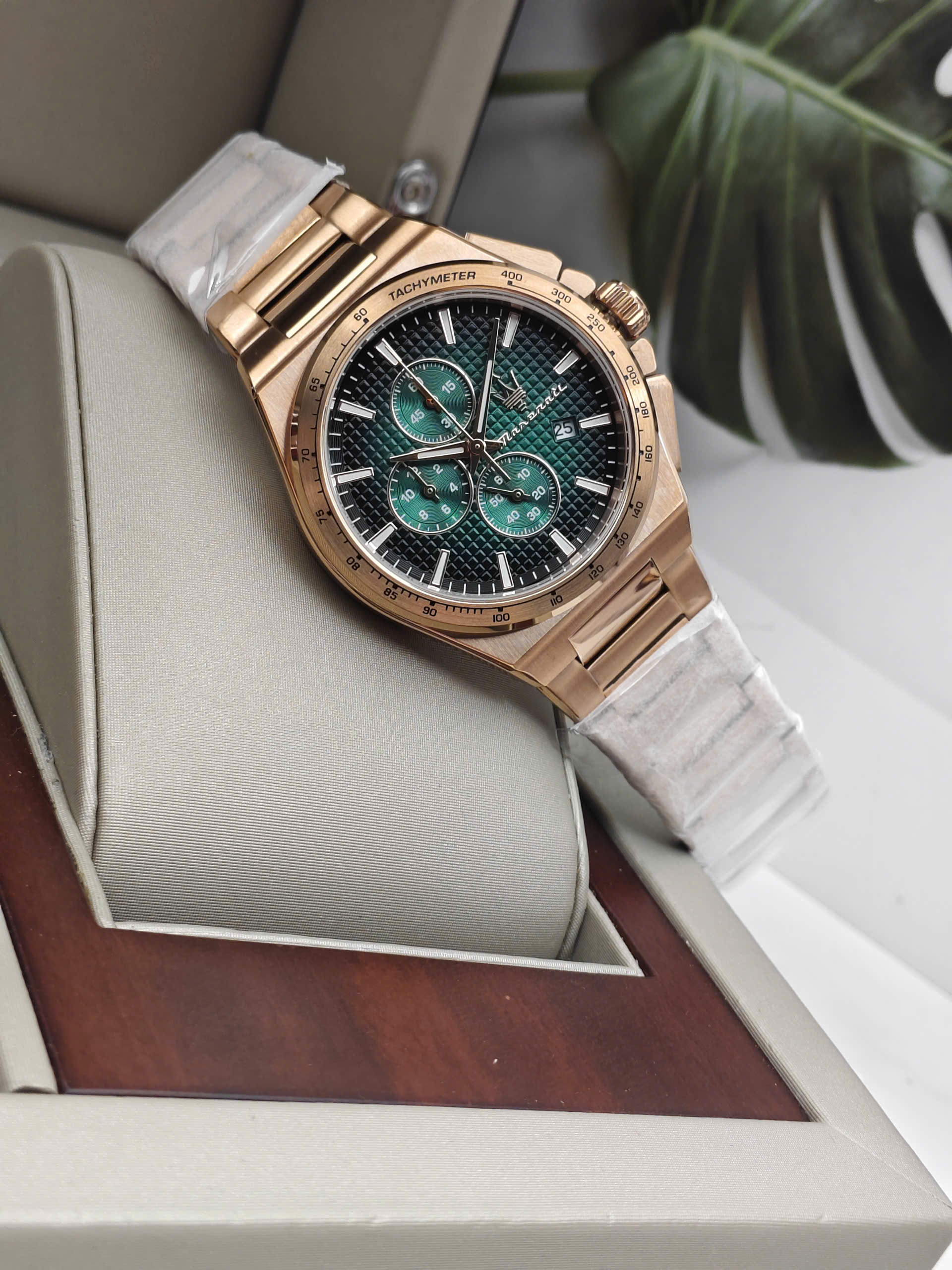 Maserati Velocità Slim R8873653001 là một mẫu đồng hồ nam mang phong cách “Velocità” (tốc độ) đầy mạnh mẽ nhưng không kém phần sang trọng. Điểm nổi bật nhất của thiết kế này là lớp mạ màu vàng hồng (Rose Gold) phủ toàn bộ vỏ và dây đeo thép không gỉ, tạo nên vẻ ngoài thời thượng và đẳng cấp. Mặt số màu xanh lá cây (Green) độc đáo kết hợp cùng các kim và chi tiết màu vàng hồng tạo nên độ tương phản ấn tượng, thu hút mọi ánh nhìn.