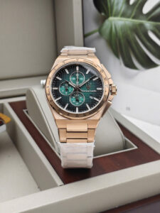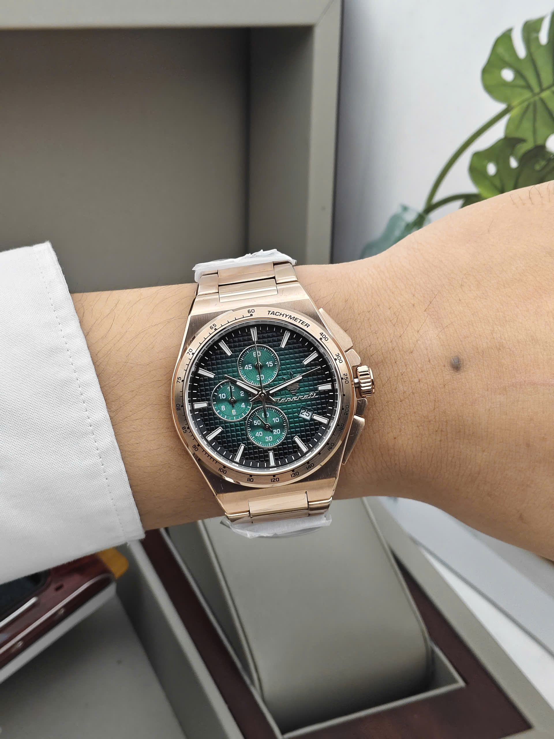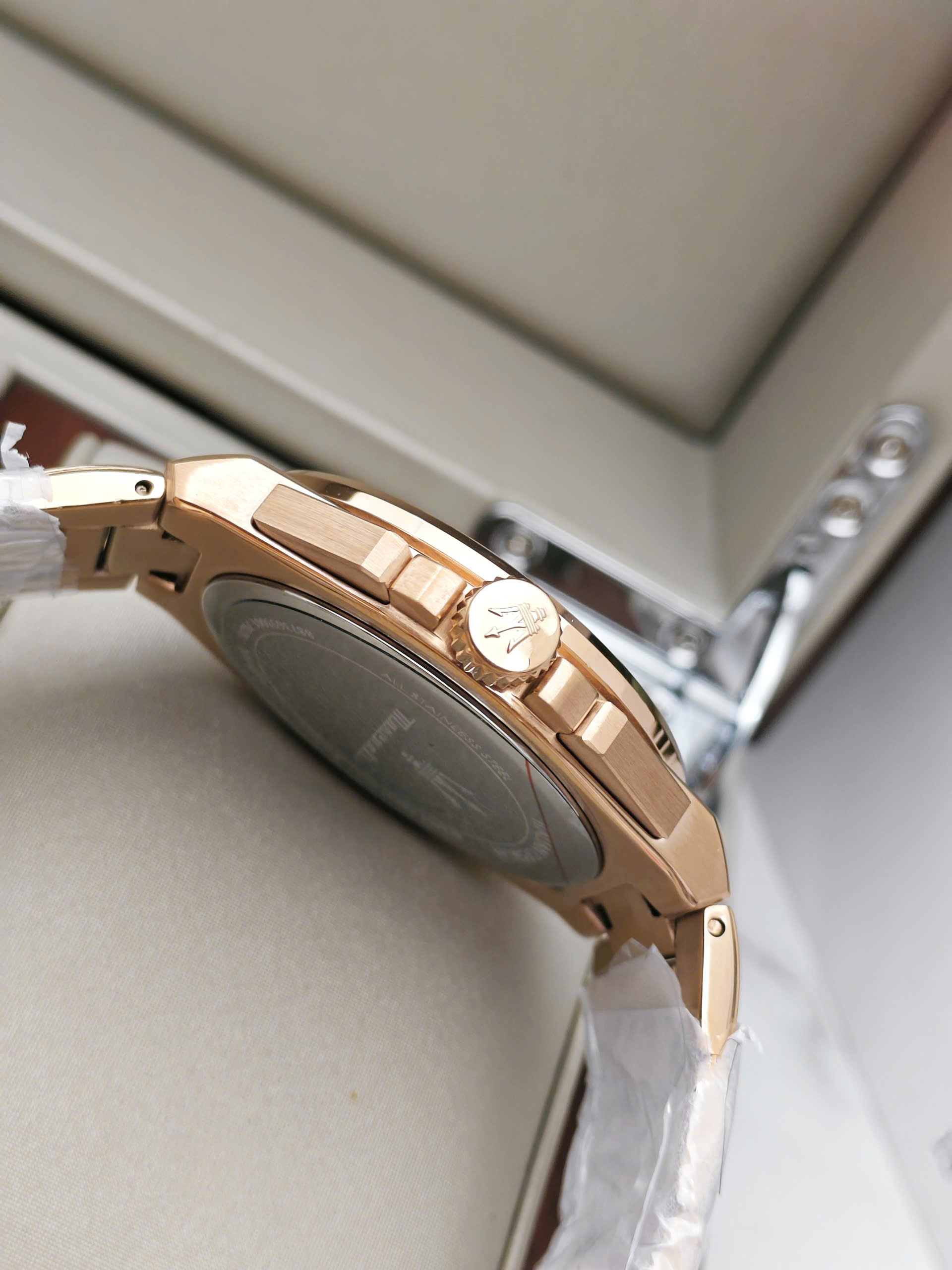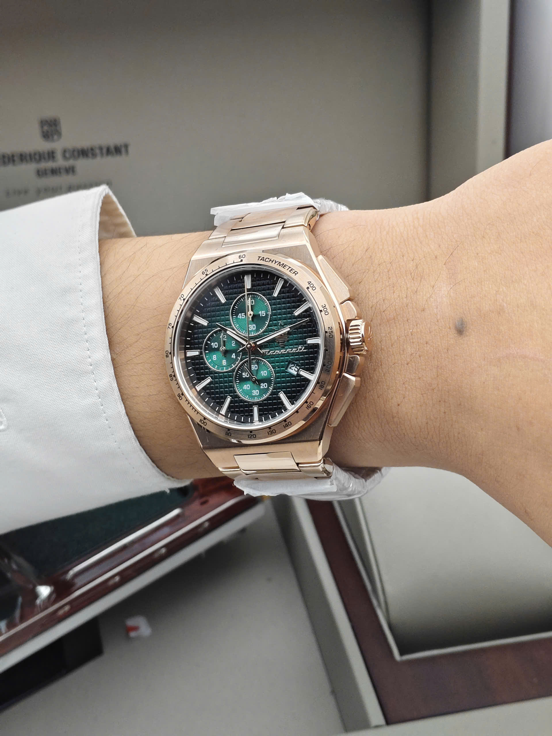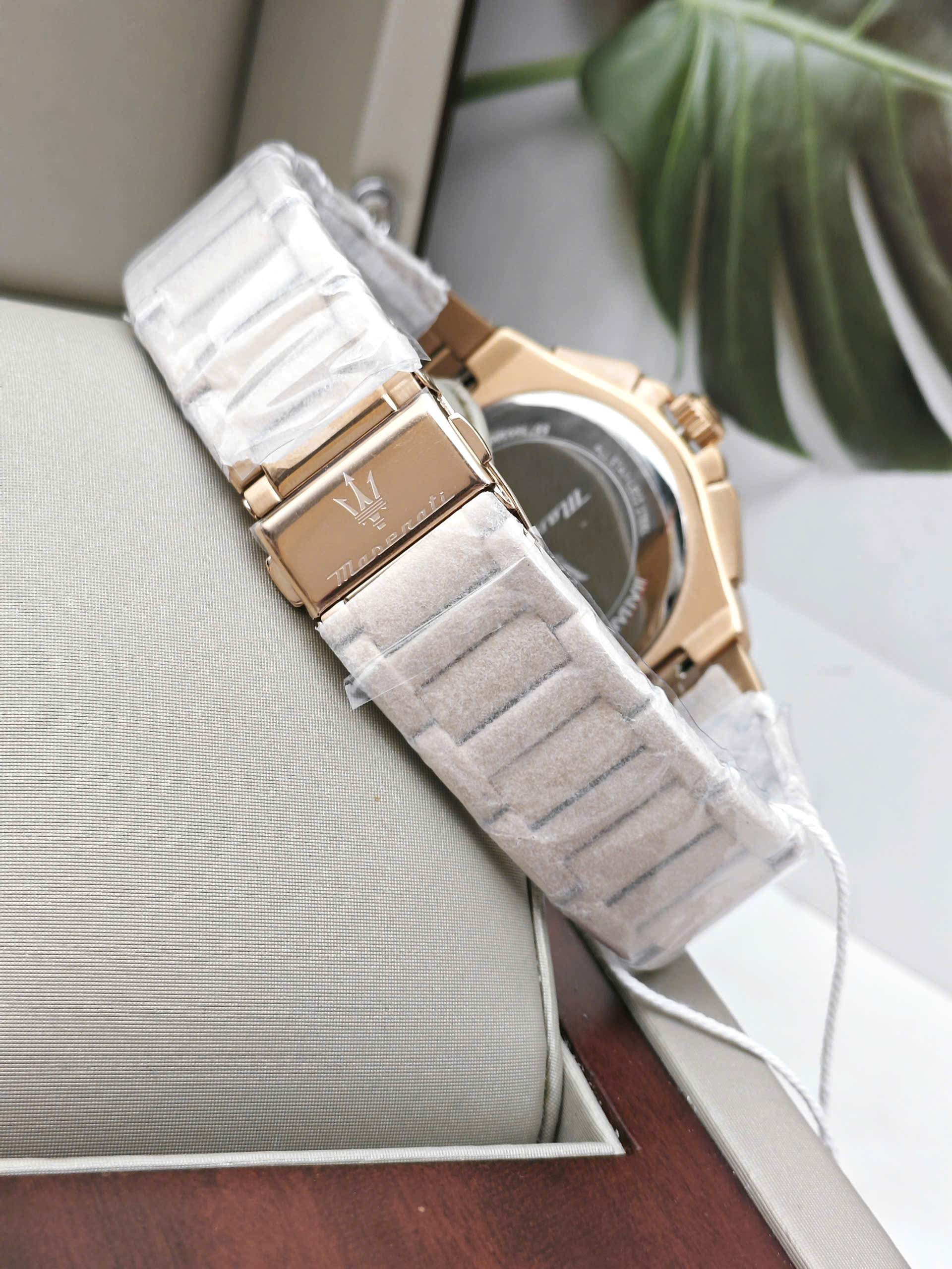 Maserati Velocità Slim R8873653001 là một mẫu đồng hồ nam mang phong cách “Velocità” (tốc độ) đầy mạnh mẽ nhưng không kém phần sang trọng. Điểm nổi bật nhất của thiết kế này là lớp mạ màu vàng hồng (Rose Gold) phủ toàn bộ vỏ và dây đeo thép không gỉ, tạo nên vẻ ngoài thời thượng và đẳng cấp. Mặt số màu xanh lá cây (Green) độc đáo kết hợp cùng các kim và chi tiết màu vàng hồng tạo nên độ tương phản ấn tượng, thu hút mọi ánh nhìn.