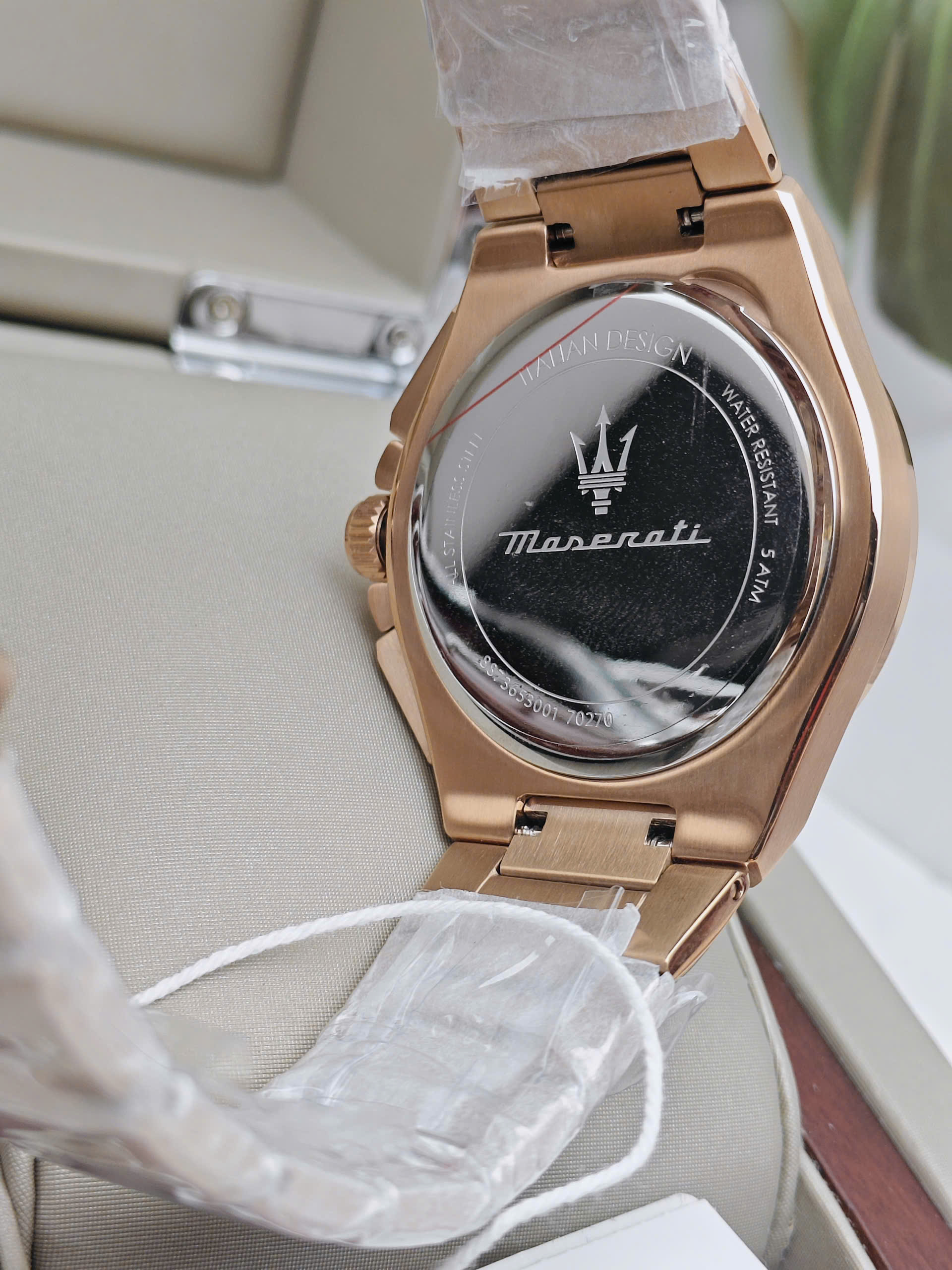 Ngoài chức năng xem giờ cơ bản, Maserati R8873653001 còn là một chiếc đồng hồ bấm giờ thể thao (Chronograph) với các mặt số phụ cho phép đo thời gian chính xác. Trên viền bezel có thang đo Tachymeter cố định, hỗ trợ tính toán tốc độ. Đồng hồ cũng được trang bị khả năng chống nước 5 ATM (5 Bar), cho phép bạn thoải mái đeo khi rửa tay hoặc tắm vòi sen mà không lo bị vào nước. Dây đeo dạng mắt xích chắc chắn cùng khóa bấm tiện lợi mang lại cảm giác an toàn và thoải mái khi đeo.