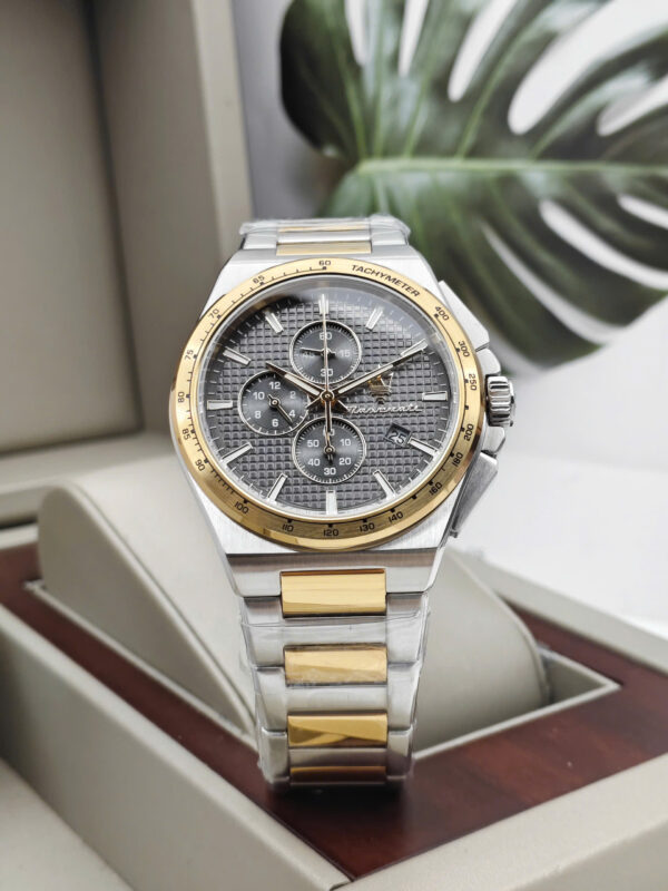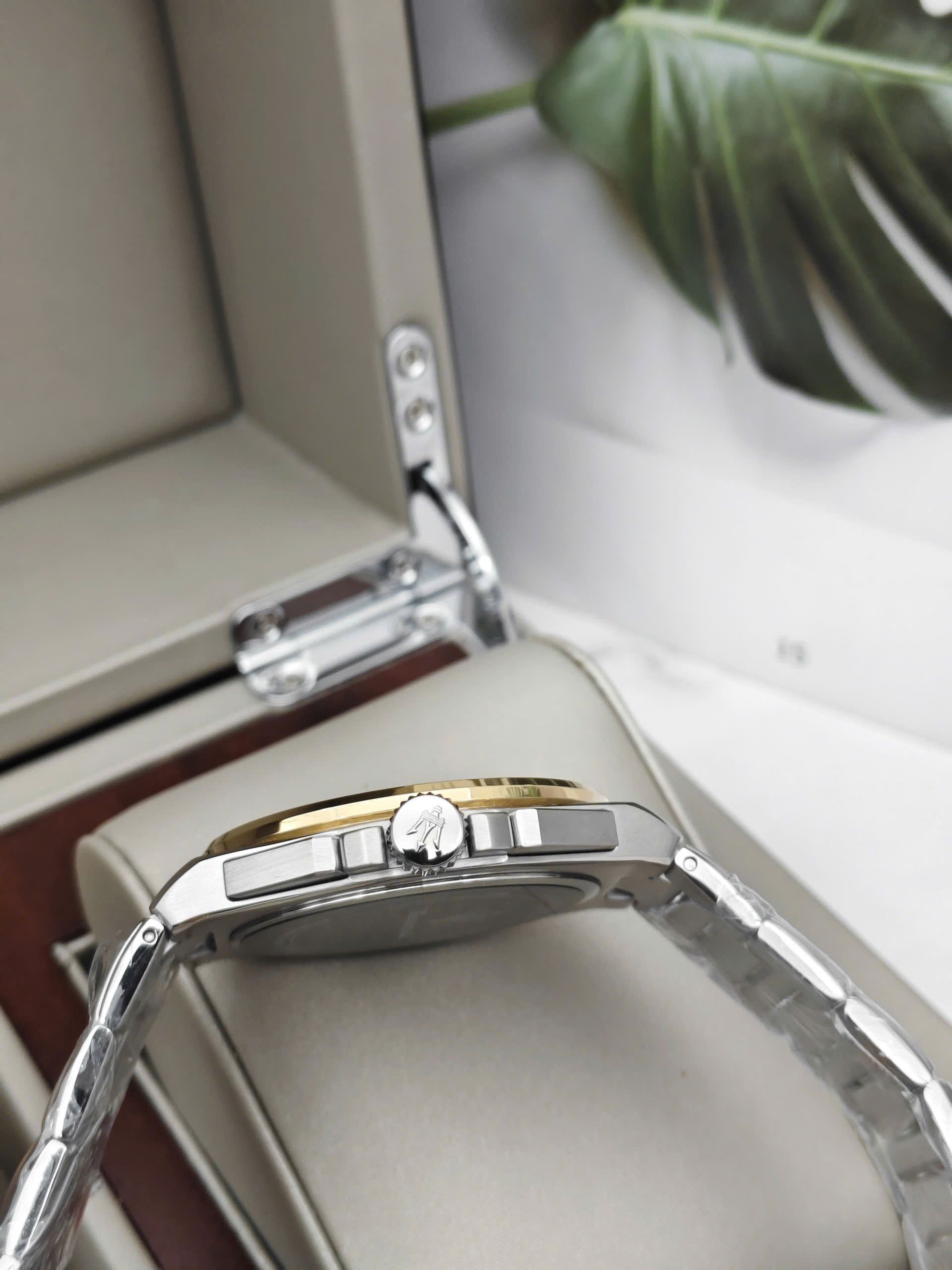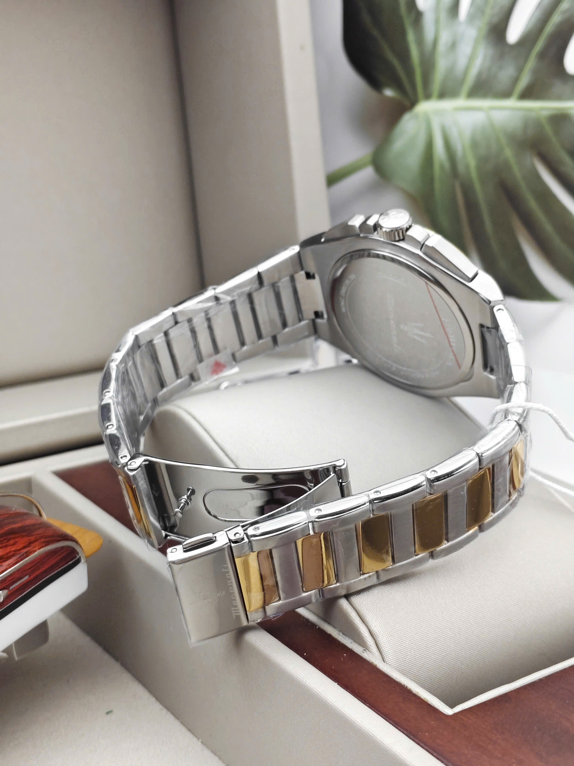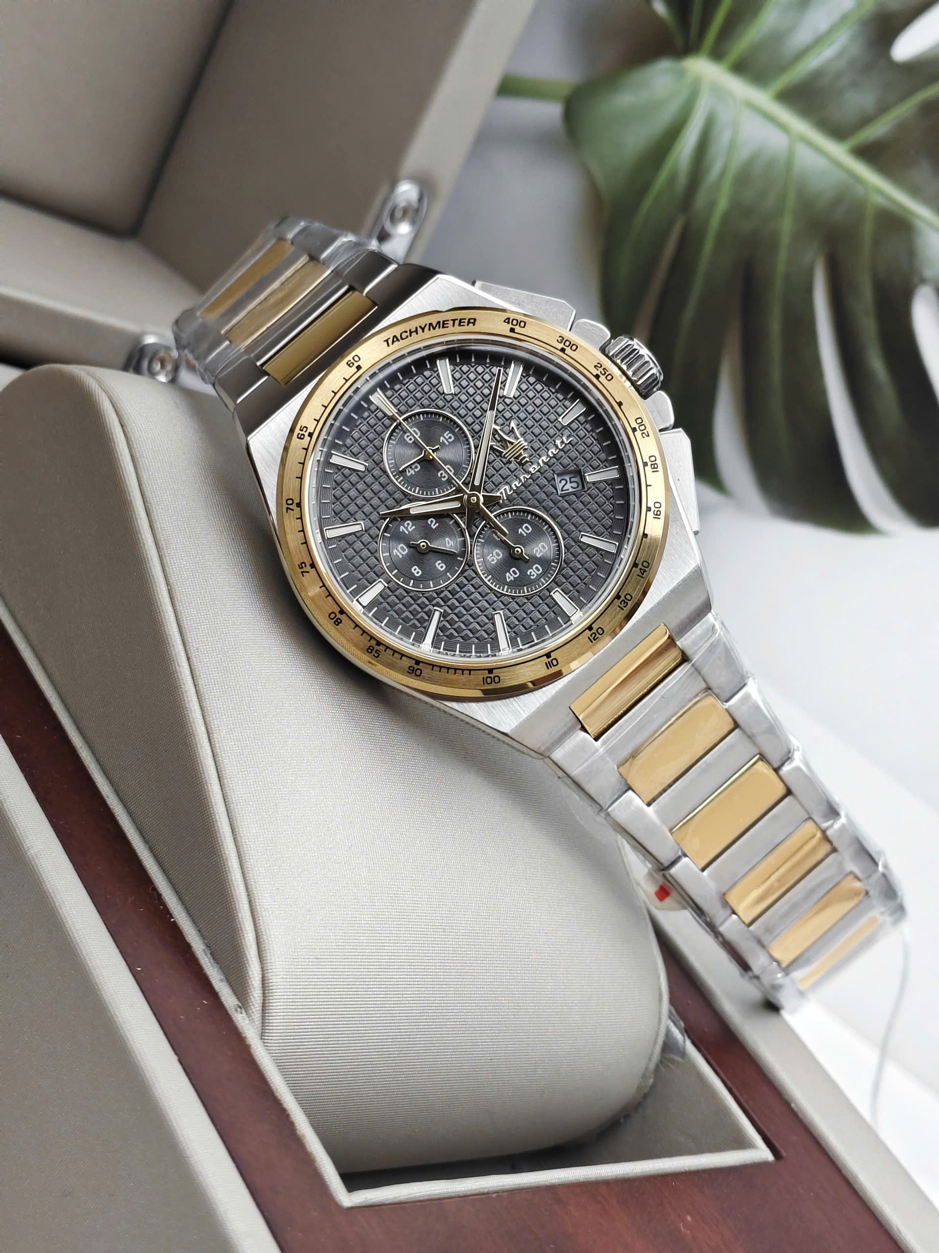 Maserati Velocità Slim R8873653002 gây ấn tượng mạnh mẽ với phong cách phối màu Demi (hai tông màu) thời thượng. Sự kết hợp giữa thép không gỉ màu bạc sáng bóng và các chi tiết mạ vàng (Gold) trên dây đeo và mặt số tạo nên vẻ đẹp vừa cổ điển vừa hiện đại. Mặt số màu đen huyền bí làm nền cho các kim và cọc số màu vàng nổi bật, mang lại vẻ ngoài đẳng cấp và dễ dàng thu hút mọi ánh nhìn, phù hợp cho những quý ông yêu thích sự lịch lãm.