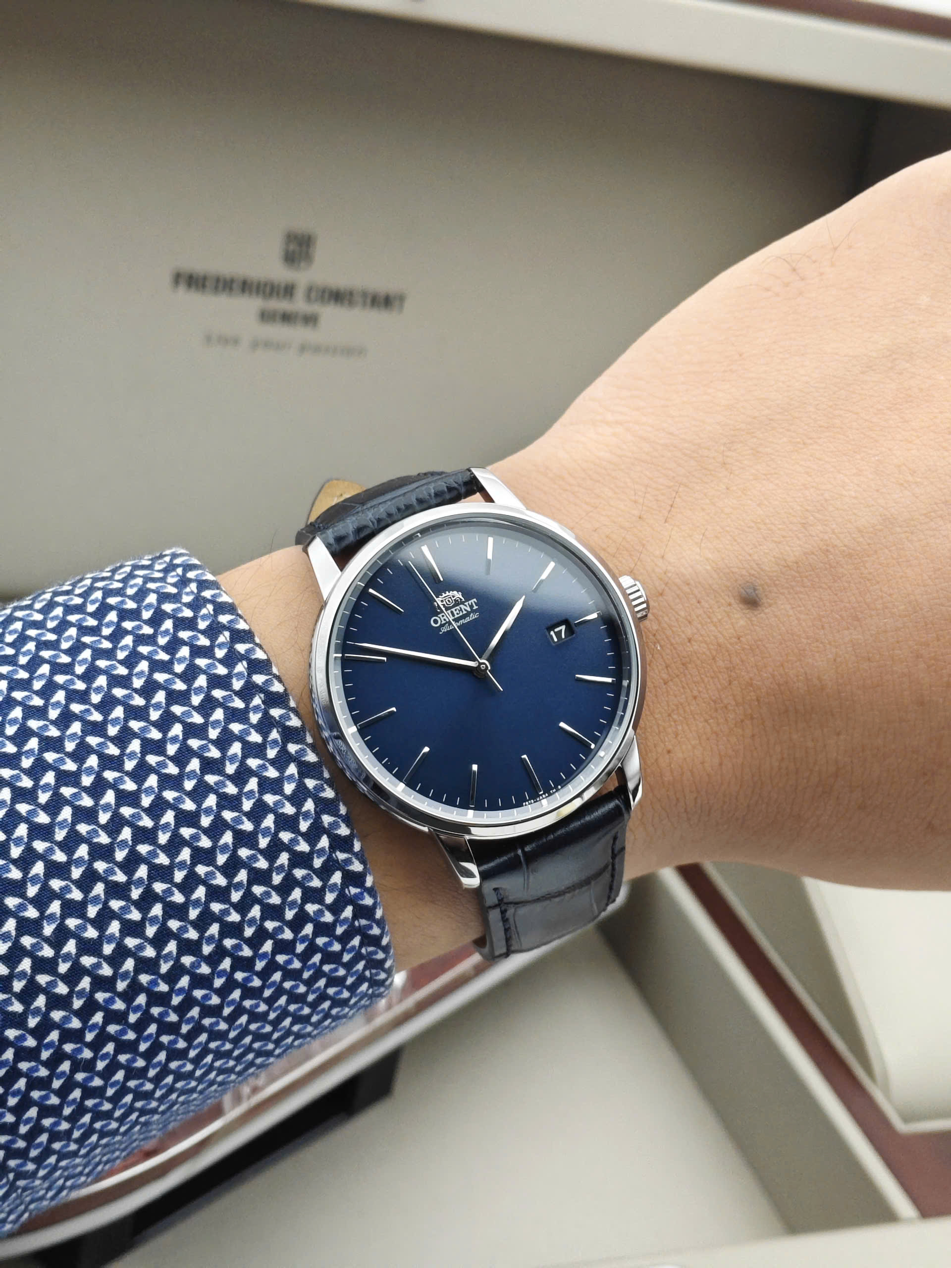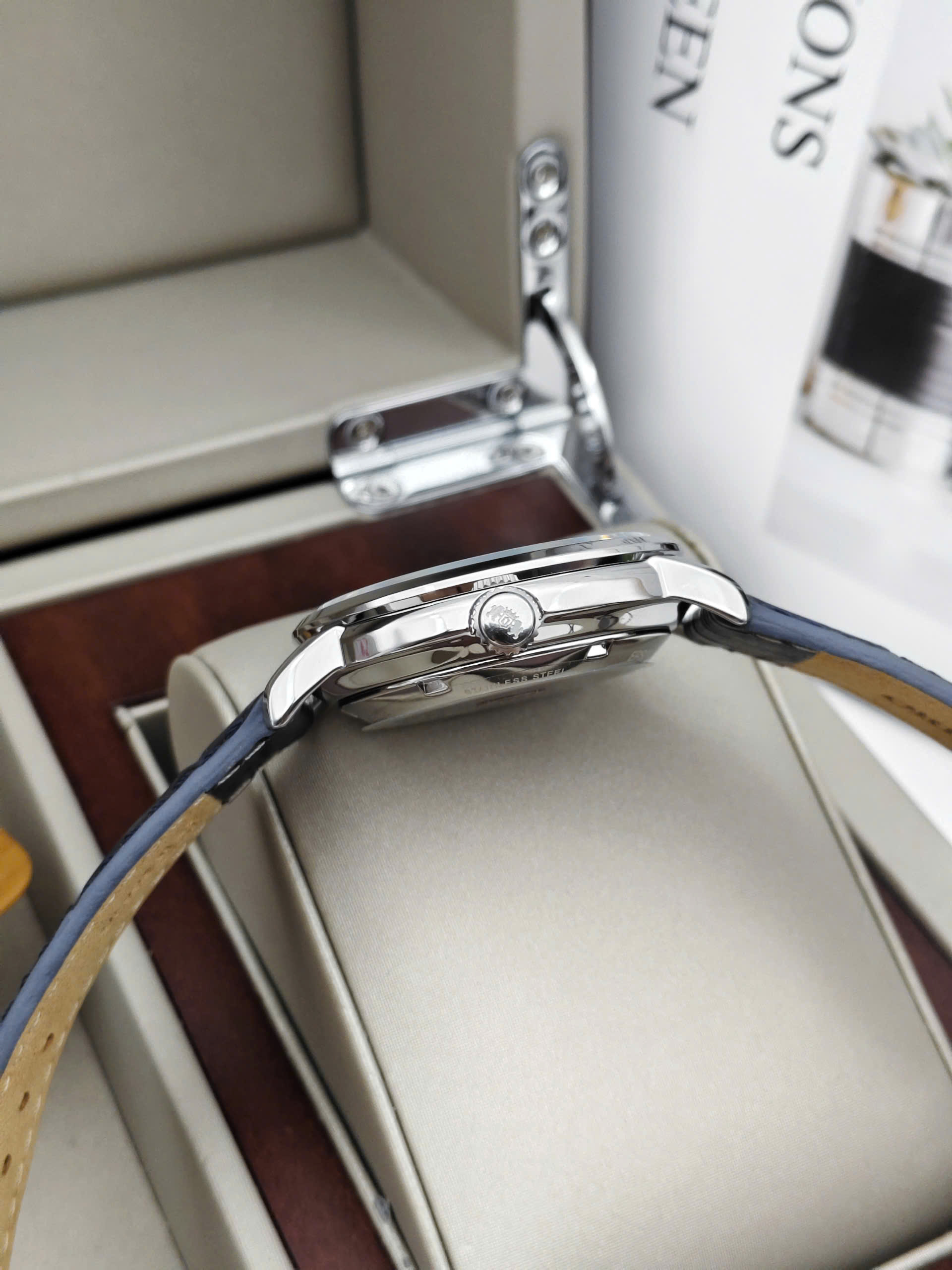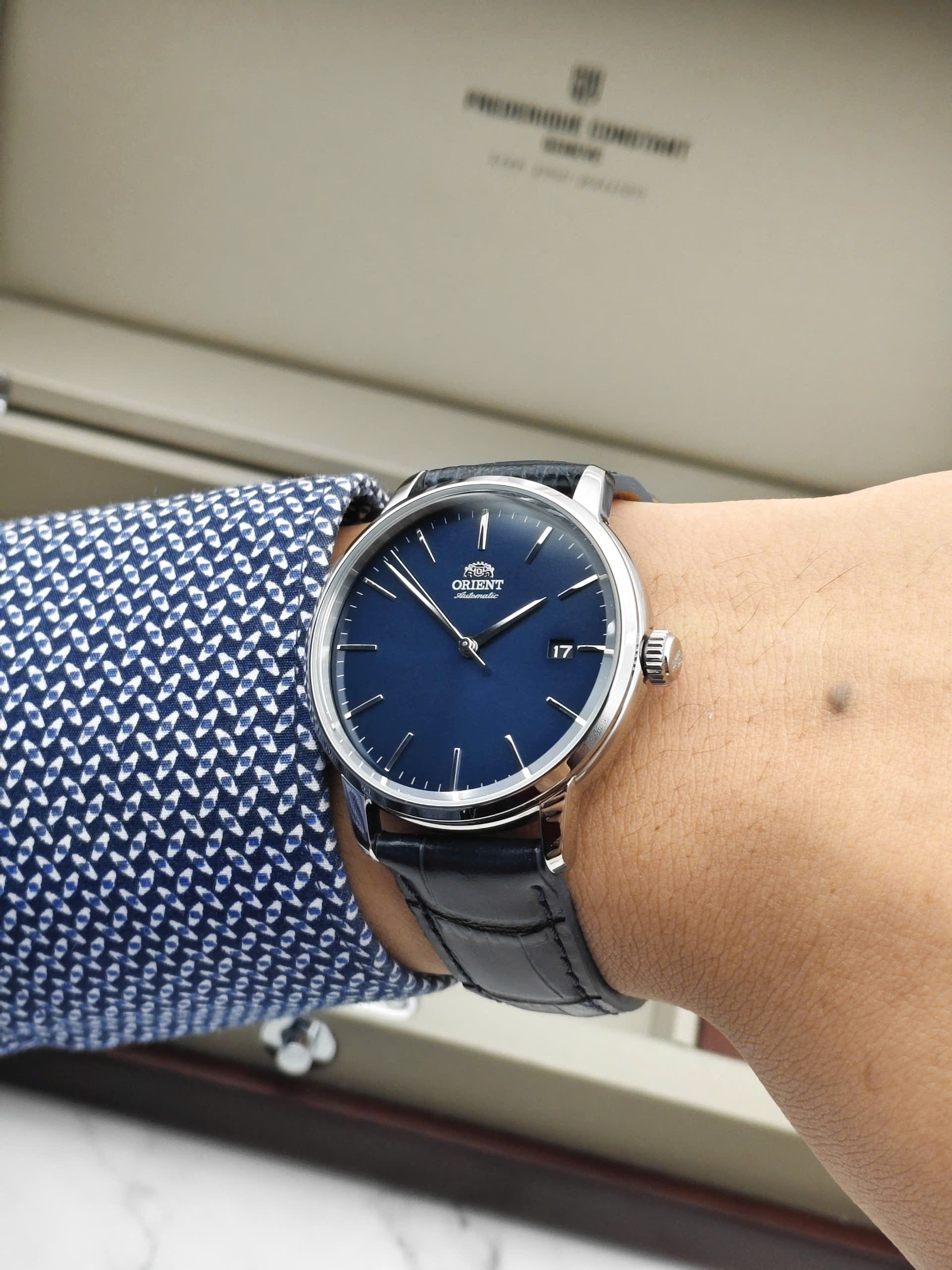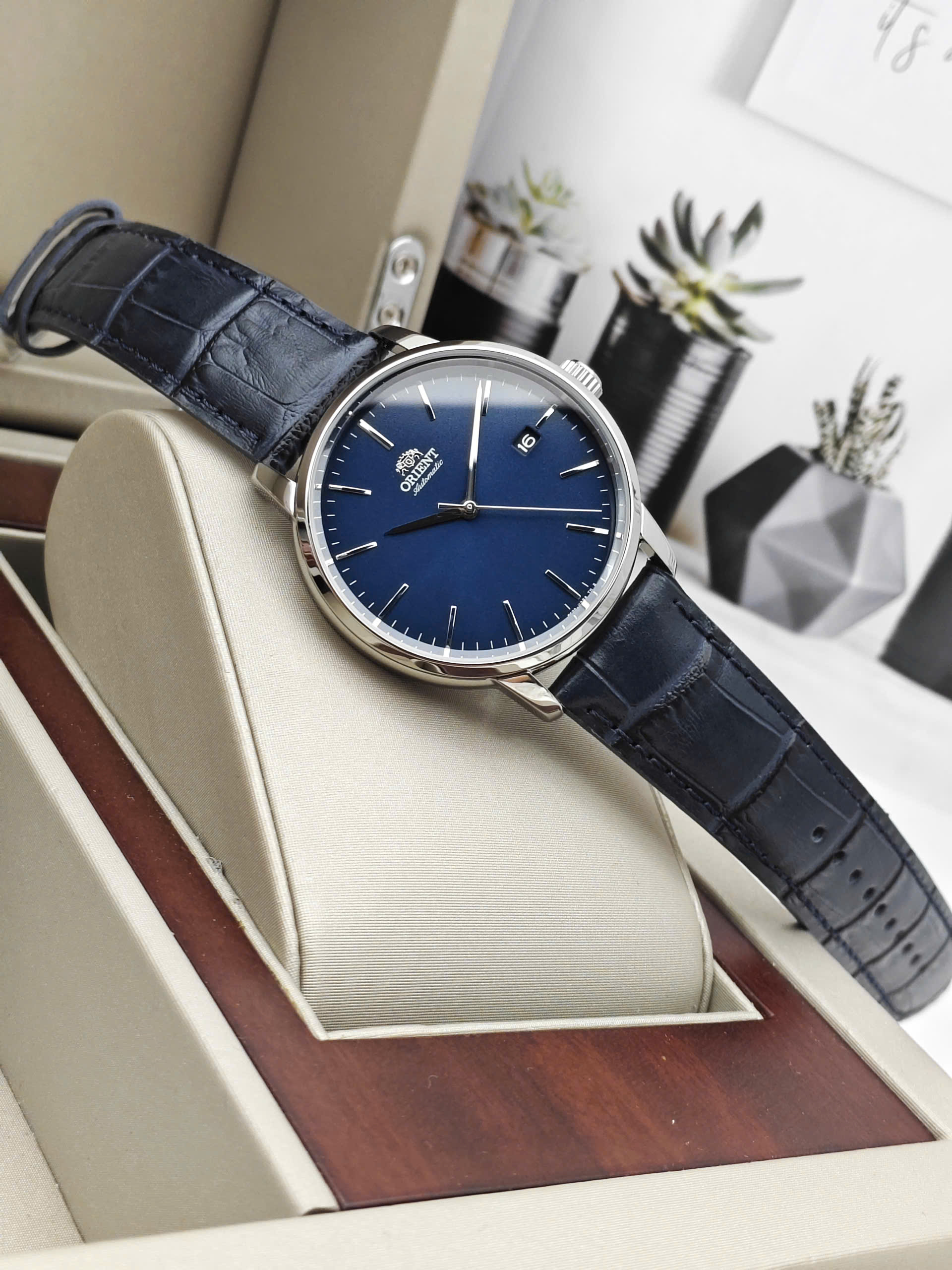Thiết Kế Thanh Lịch và Hiện Đại Orient RA-AC0E04L30B sở hữu vẻ ngoài tinh tế với mặt số màu xanh dương trẻ trung, được hoàn thiện chải tia đồng tâm bắt mắt. Các cọc số và bộ kim được thiết kế thanh mảnh, mạ màu bạc sáng bóng trên nền mặt xanh tạo độ tương phản cao, mang lại cảm giác sang trọng và dễ đọc giờ. Kết hợp cùng dây đeo bằng da mềm mại và vỏ thép không gỉ 316L, chiếc đồng hồ này là phụ kiện hoàn hảo cho phong cách công sở hoặc những dịp cần sự chỉn chu.
