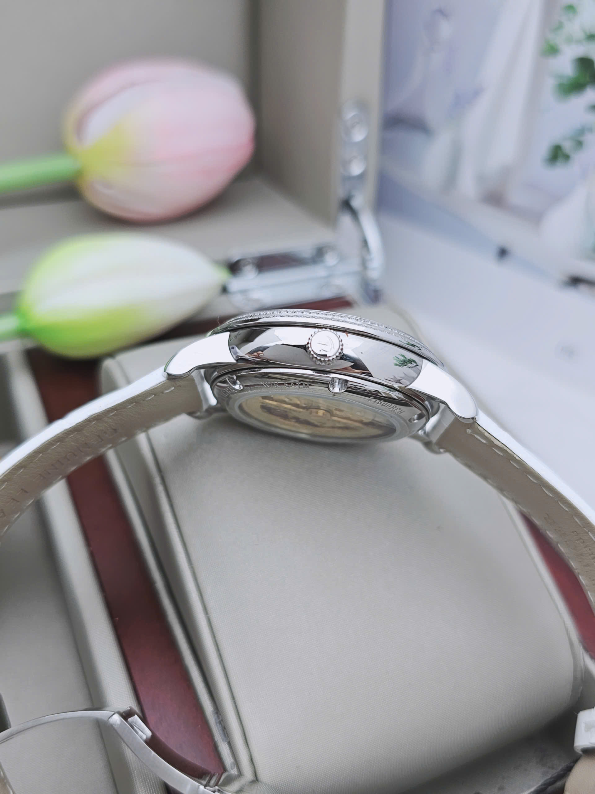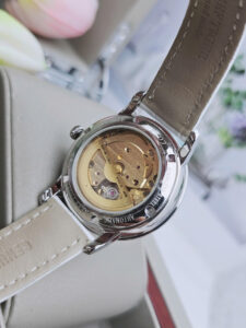 Sản phẩm được trang bị bộ máy cơ tự động vận hành ổn định và bền bỉ theo thời gian. Cơ chế automatic giúp đồng hồ tích trữ năng lượng qua chuyển động cổ tay, mang lại trải nghiệm tiện lợi khi sử dụng hằng ngày. Mặt kính sapphire cao cấp chống trầy xước hiệu quả, giữ cho mặt số luôn sáng rõ và sắc nét. Khả năng chịu nước 5ATM đáp ứng nhu cầu rửa tay, đi mưa nhẹ hoặc sinh hoạt thường nhật. Thiết kế không lịch tăng vẻ tối giản thanh thoát cho người dùng nữ tính.