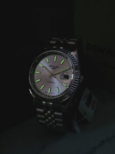 Senaro 88086G-5.AWA có cọc vạch phủ dạ quang rất sáng, được trang bị lịch ngày ở hướng 3 giờ. Ngoài ra, toàn bộ kim giờ, kim phút, và cọc số được phủ dạ quang, sẽ giúp cho người sử dụng có thể dễ dàng xem giờ khi trời tối