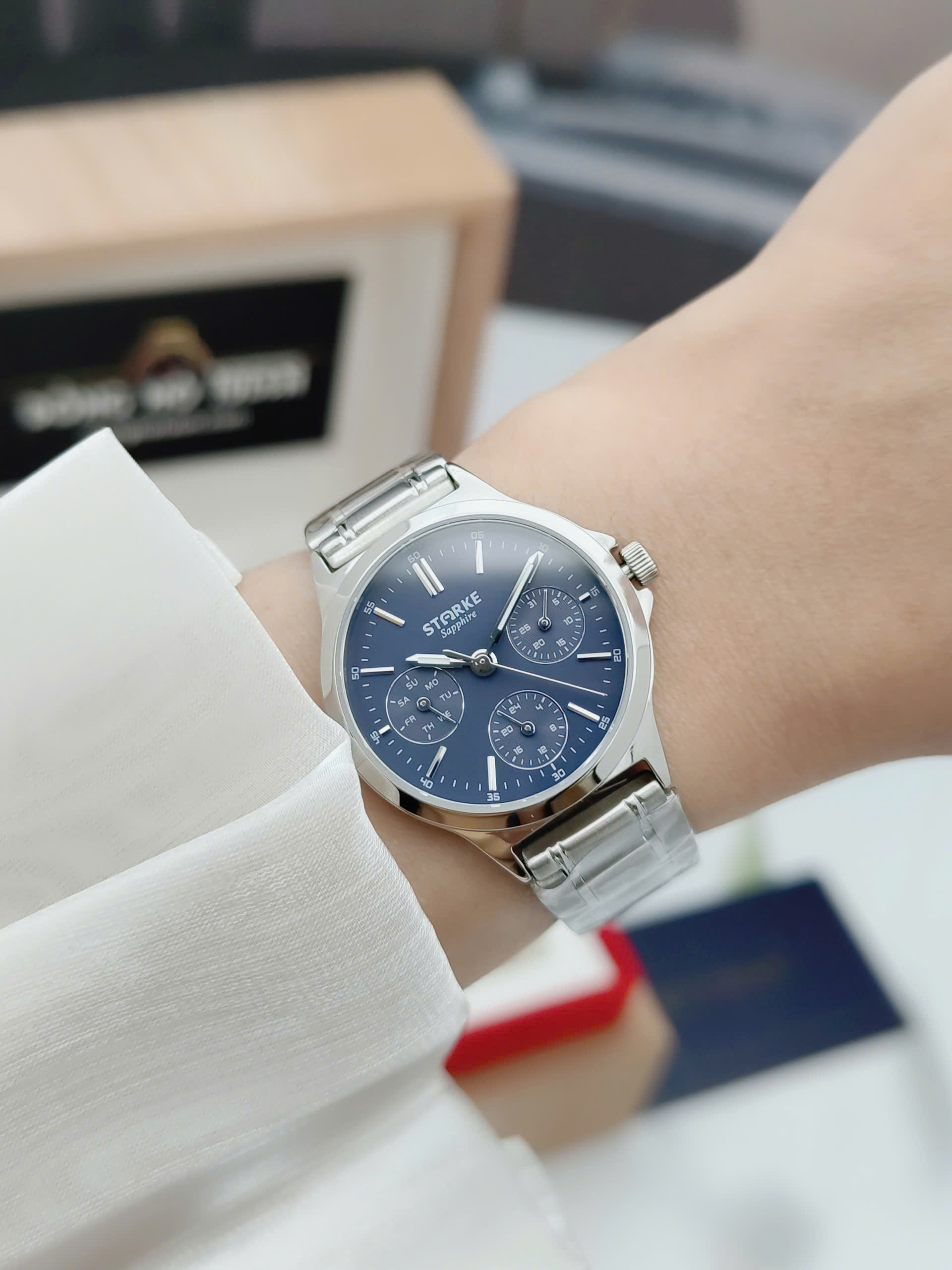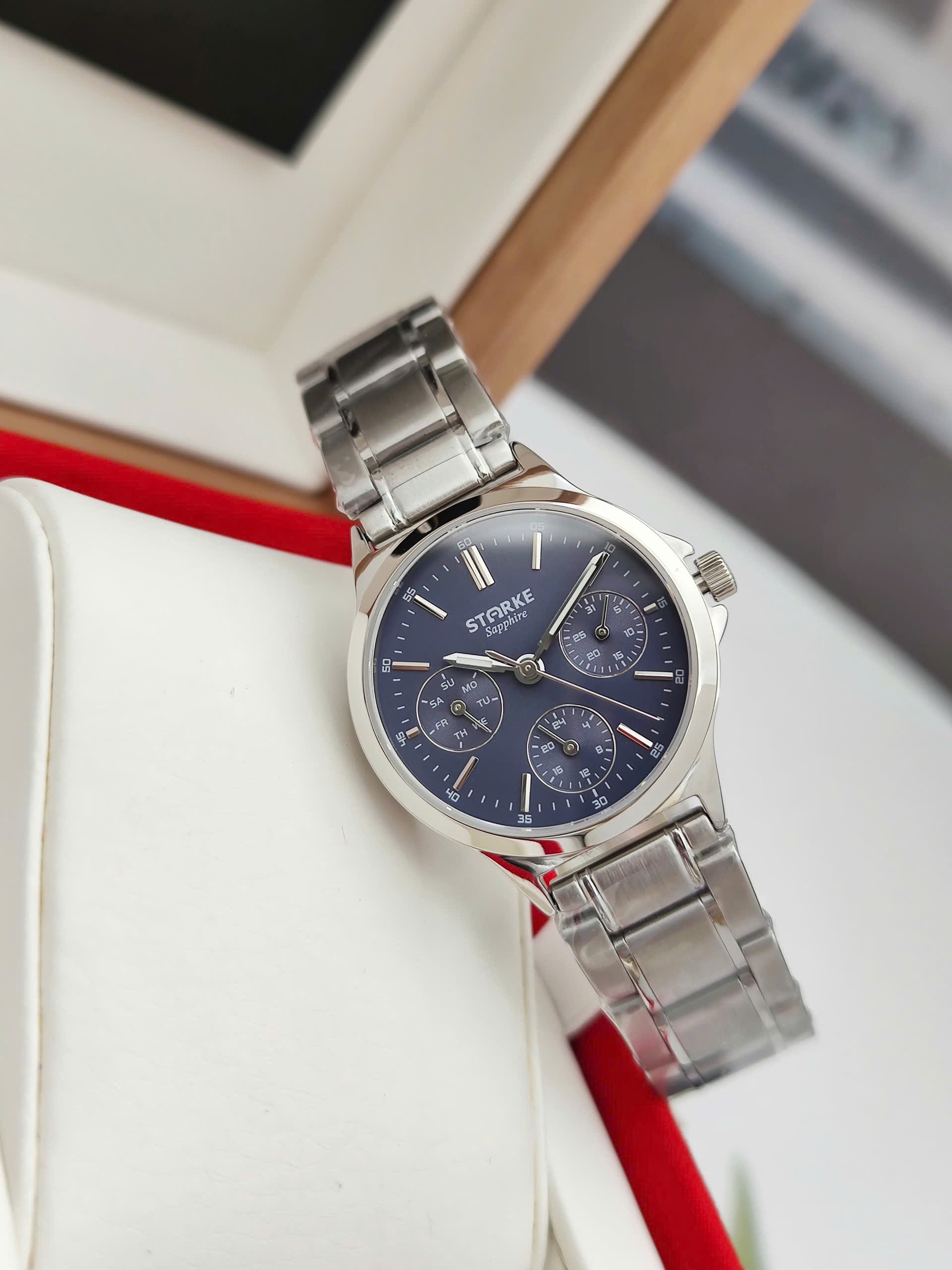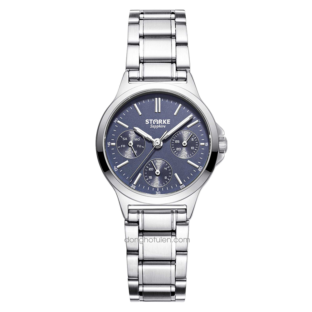 Đồng hồ nữ Starke SK153AL với mặt số xanh dương tinh tế của đồng hồ SK153AL có đường kính 32mm, độ dày chỉ 7mm, giúp tổng thể thiết kế trở nên gọn gàng, thanh thoát và dễ phối với nhiều phong cách thời trang nữ. Bên trong đồng hồ Starke SK153AL là bộ máy Quartz Nhật Bản chất lượng cao, nổi tiếng về độ chính xác và ổn định. SK153AL vận hành đầy đủ các chức năng giờ, phút, giây và bấm giờ thể thao Chronograph, đáp ứng cả nhu cầu thời trang lẫn sử dụng thực tế.
