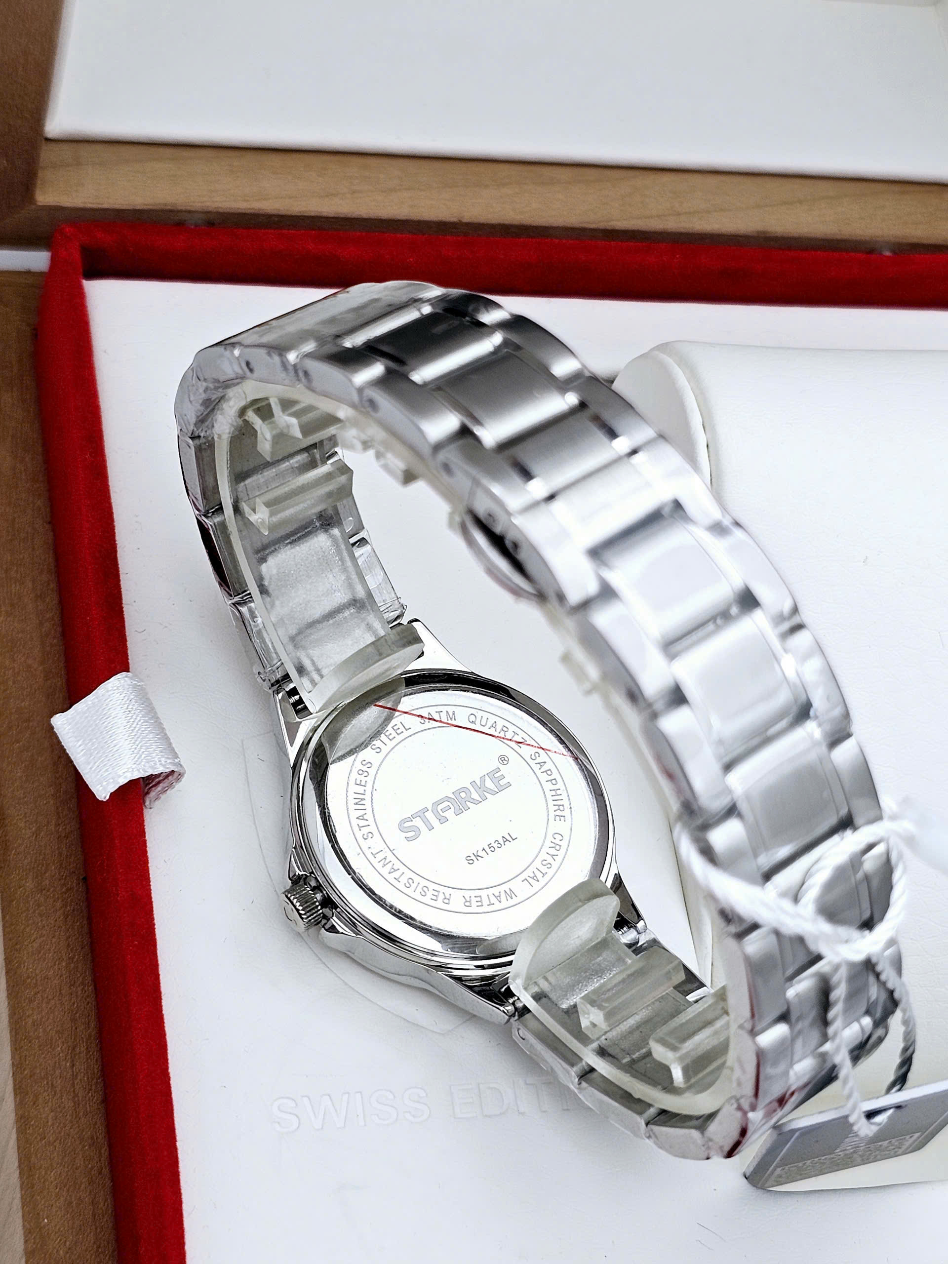 Về độ bền và khả năng sử dụng, Starke SK153AL được trang bị mặt kính Sapphire chống trầy xước, giúp bảo vệ tối ưu vẻ đẹp của đồng hồ theo thời gian. Mẫu SK153AL có độ chịu nước 3 ATM, phù hợp cho các hoạt động sinh hoạt hằng ngày như rửa tay hay đi mưa nhẹ. Ngoài ra, đồng hồ nữ SK153AL còn được tích hợp lịch ngày, hỗ trợ người dùng theo dõi thời gian một cách tiện lợi và khoa học.